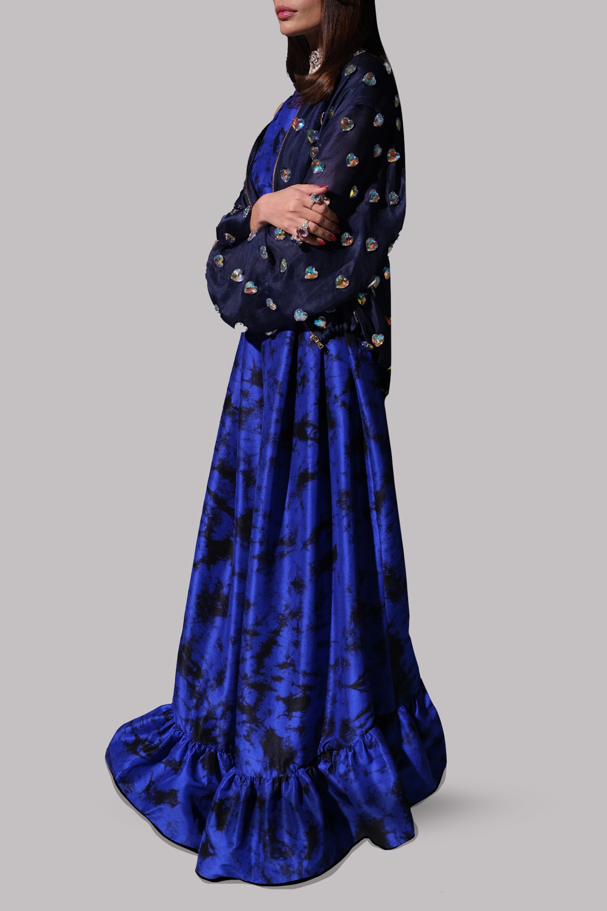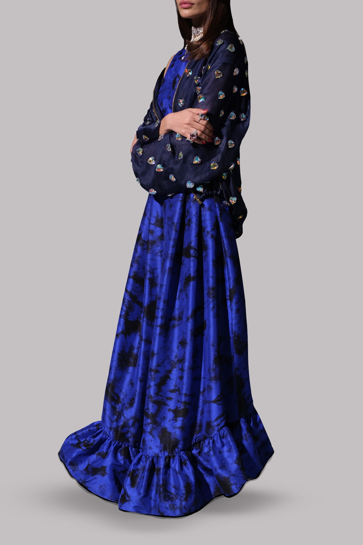 Dazzling Blue and Black close neck organza maxi adorned with extravagant embellishment with perfect cut and extravagant details. It’s impeccably tailored with matching embellished jacket.