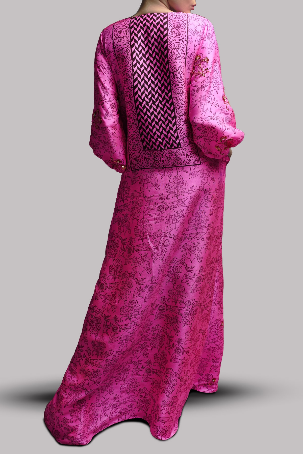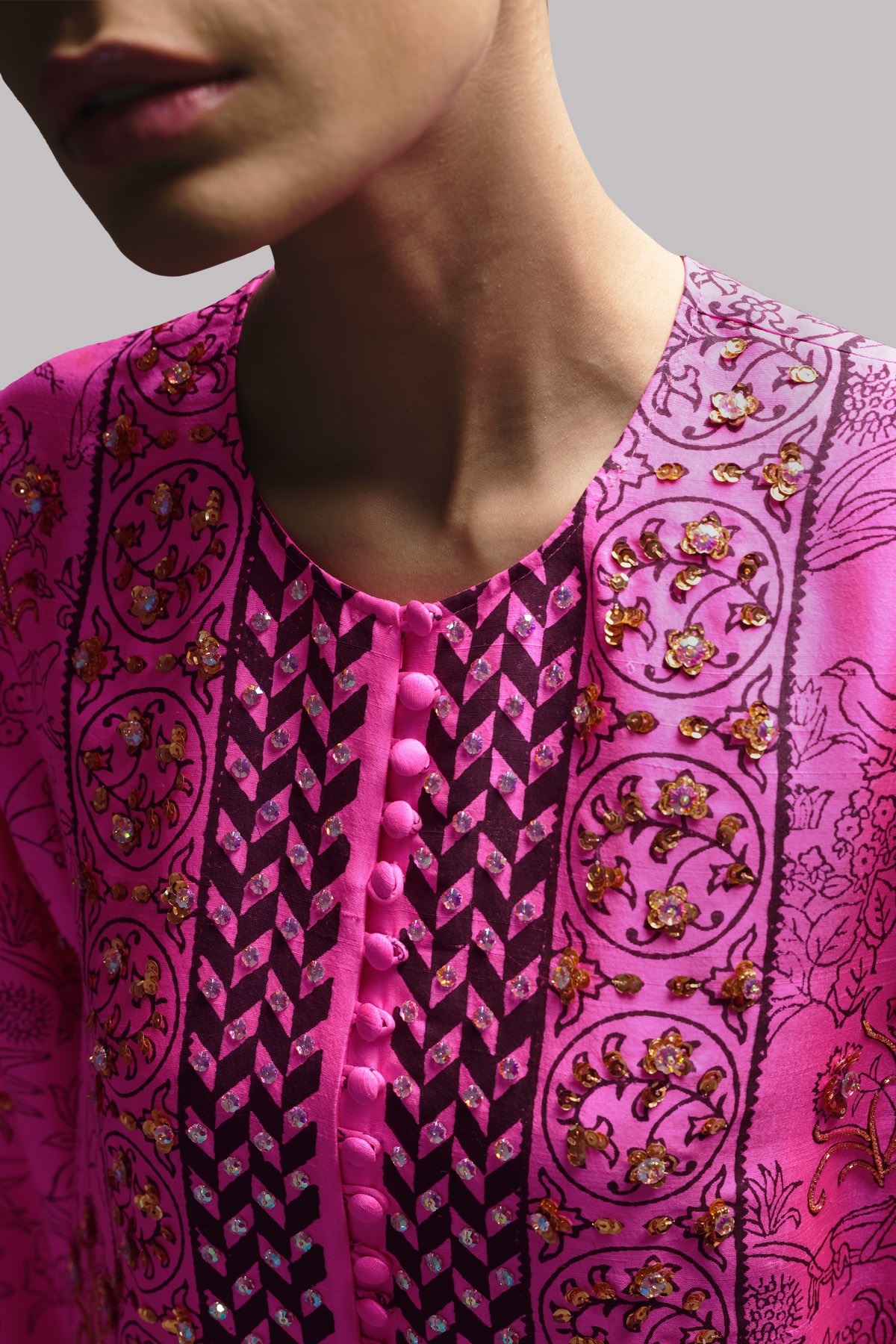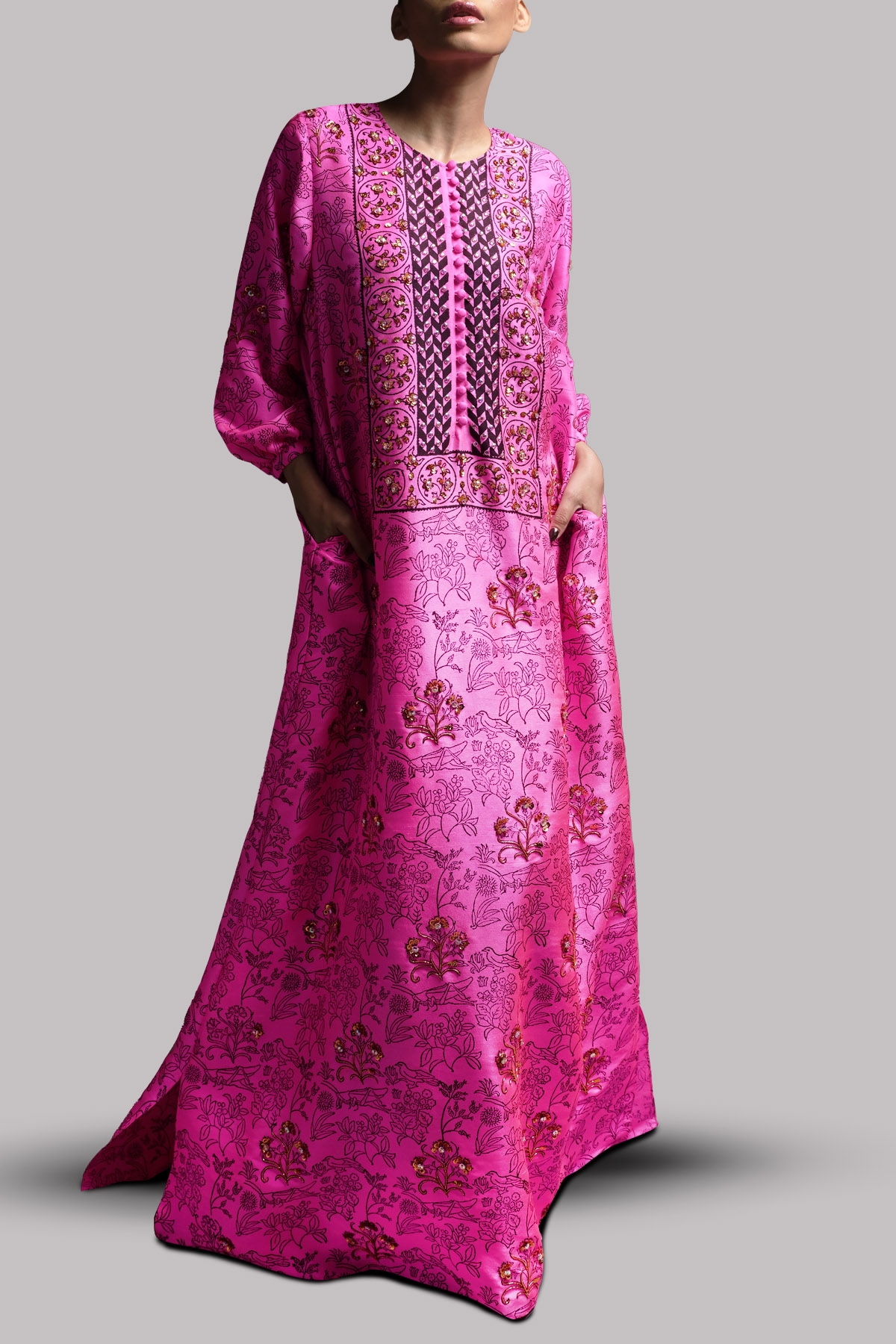 Diva Pink embellished raw silk close neck maxi that’s so chic. Hand Embellished with gold gleaming sequins and sparkling crystals on top.