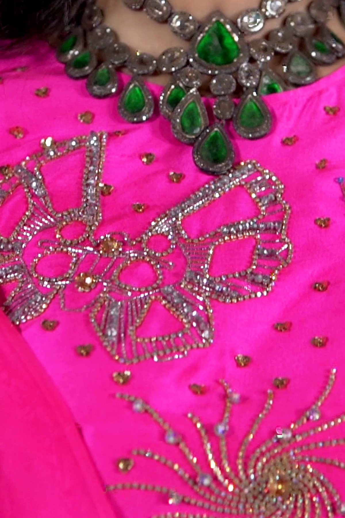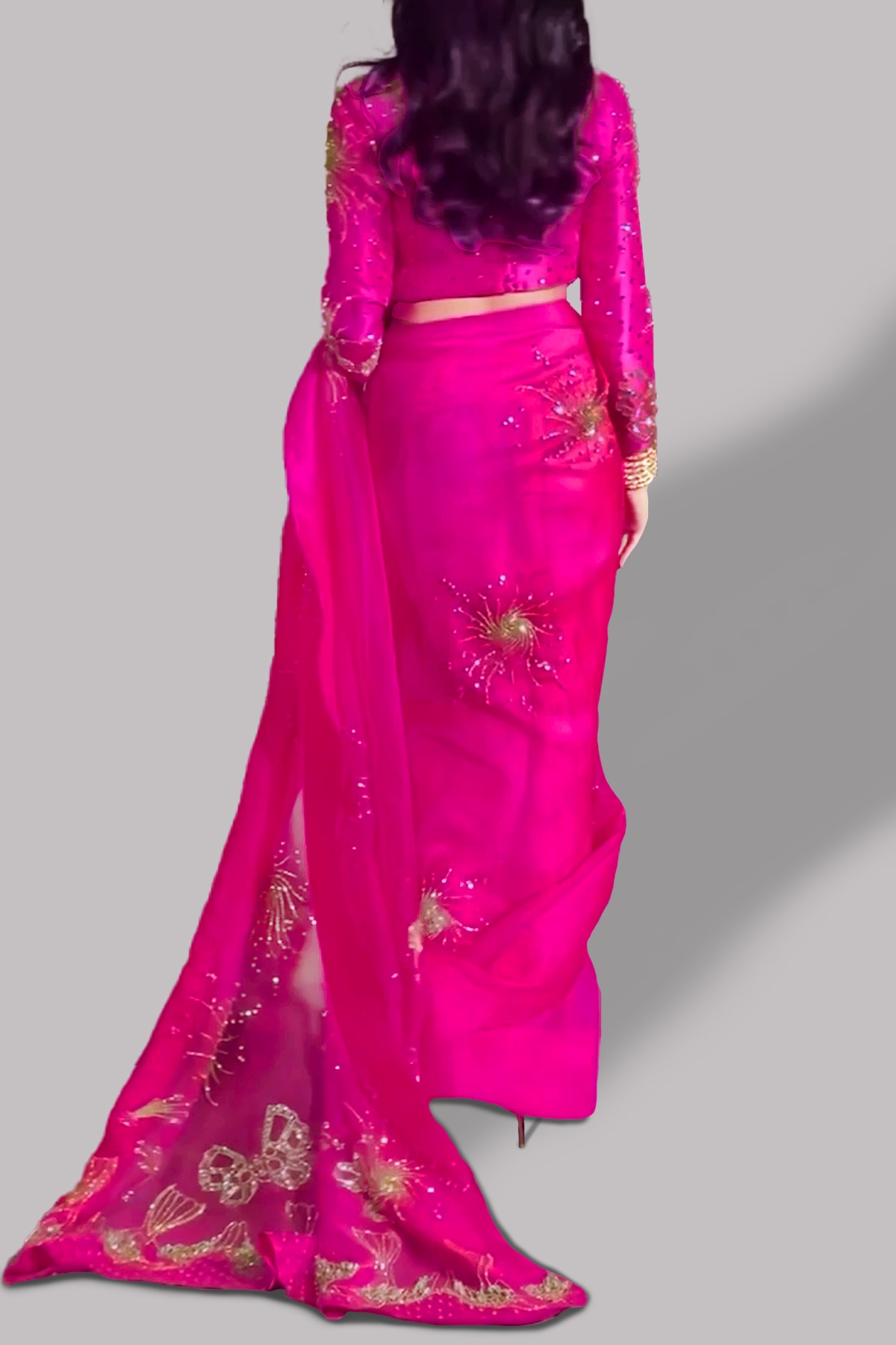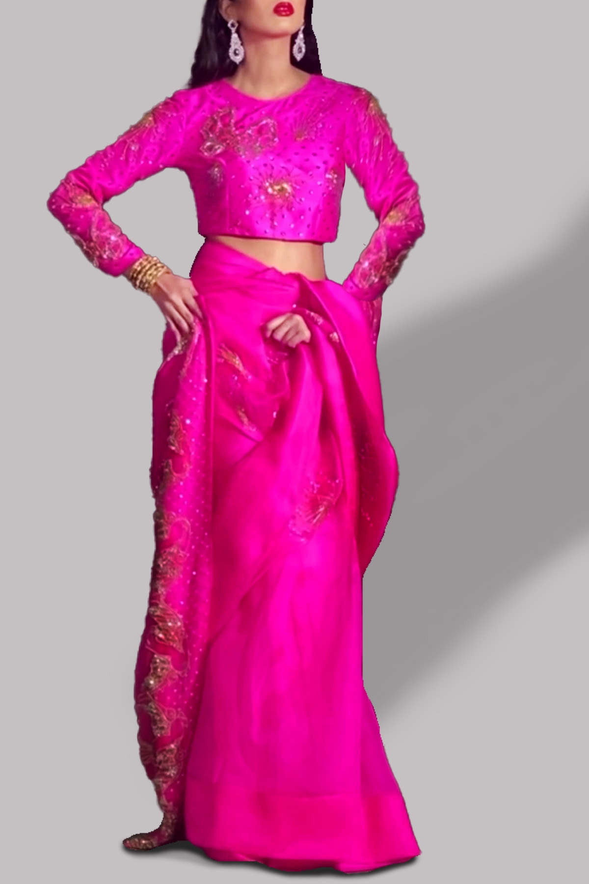 Diva Pink hand embellished organza sari with matching embellished dupion cropped blouse. Hand embellished with freshwater pearls, glittering sequins and gold beads. This sensational sari is no exception. Sari has an adjustable waist ties to ensure the most flattering fit. Silk petticoat included.