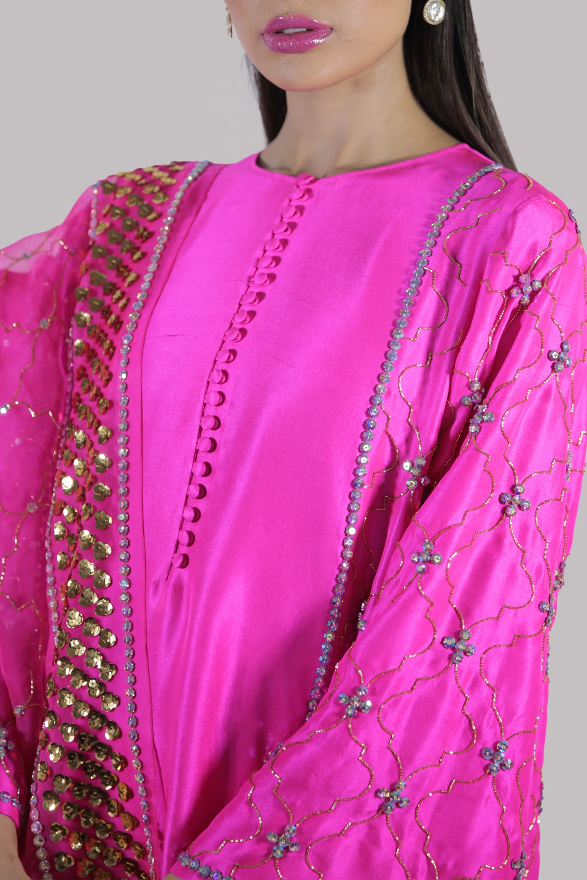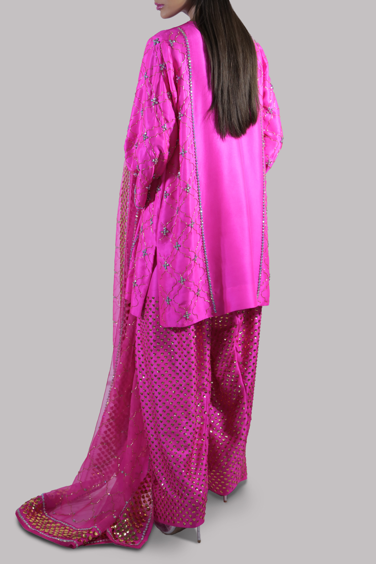 Diva Pink close neck raw silk shirt decorated with shimmering gold threads and sparkling crystals and sequins with perfect cut and extravagant details, It’s impeccably tailored with matching raw silk shalwar pants and organza dupatta.