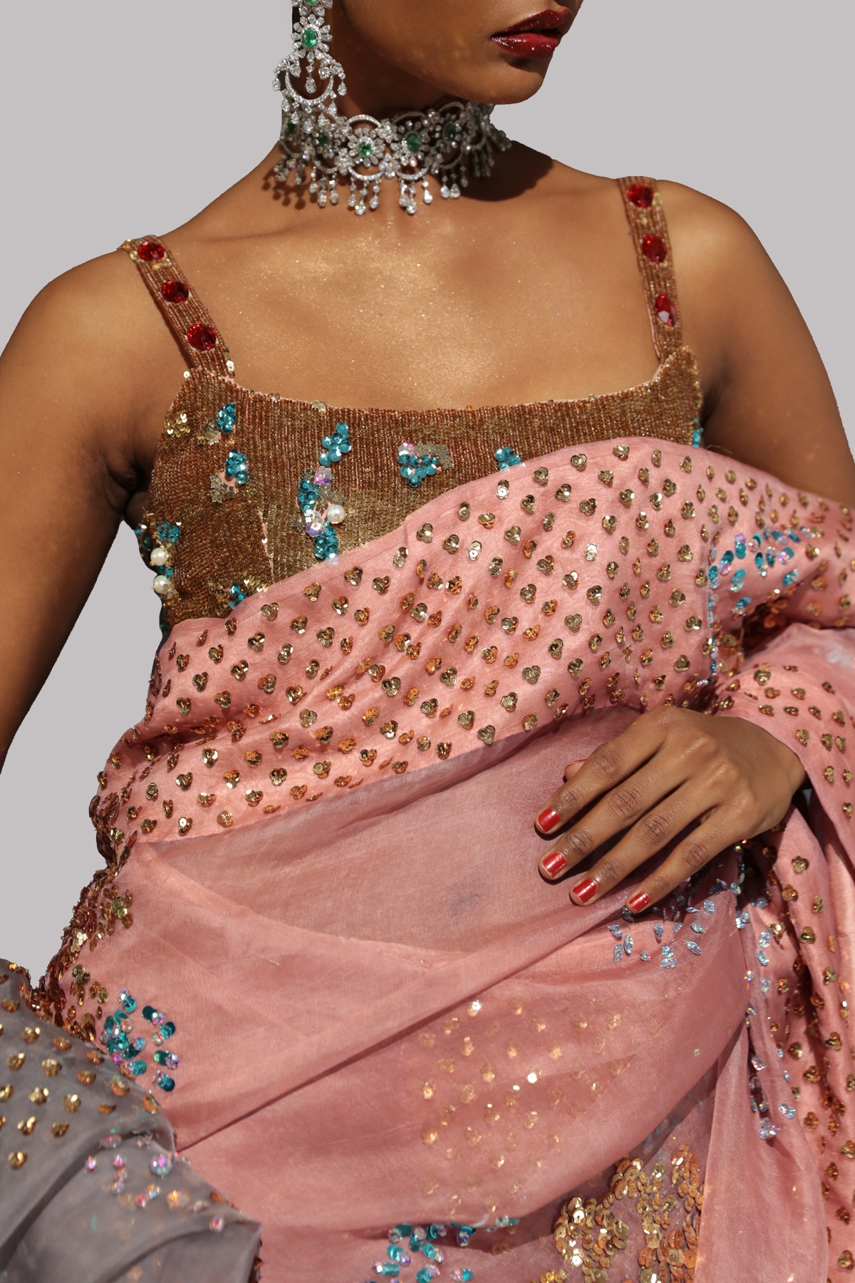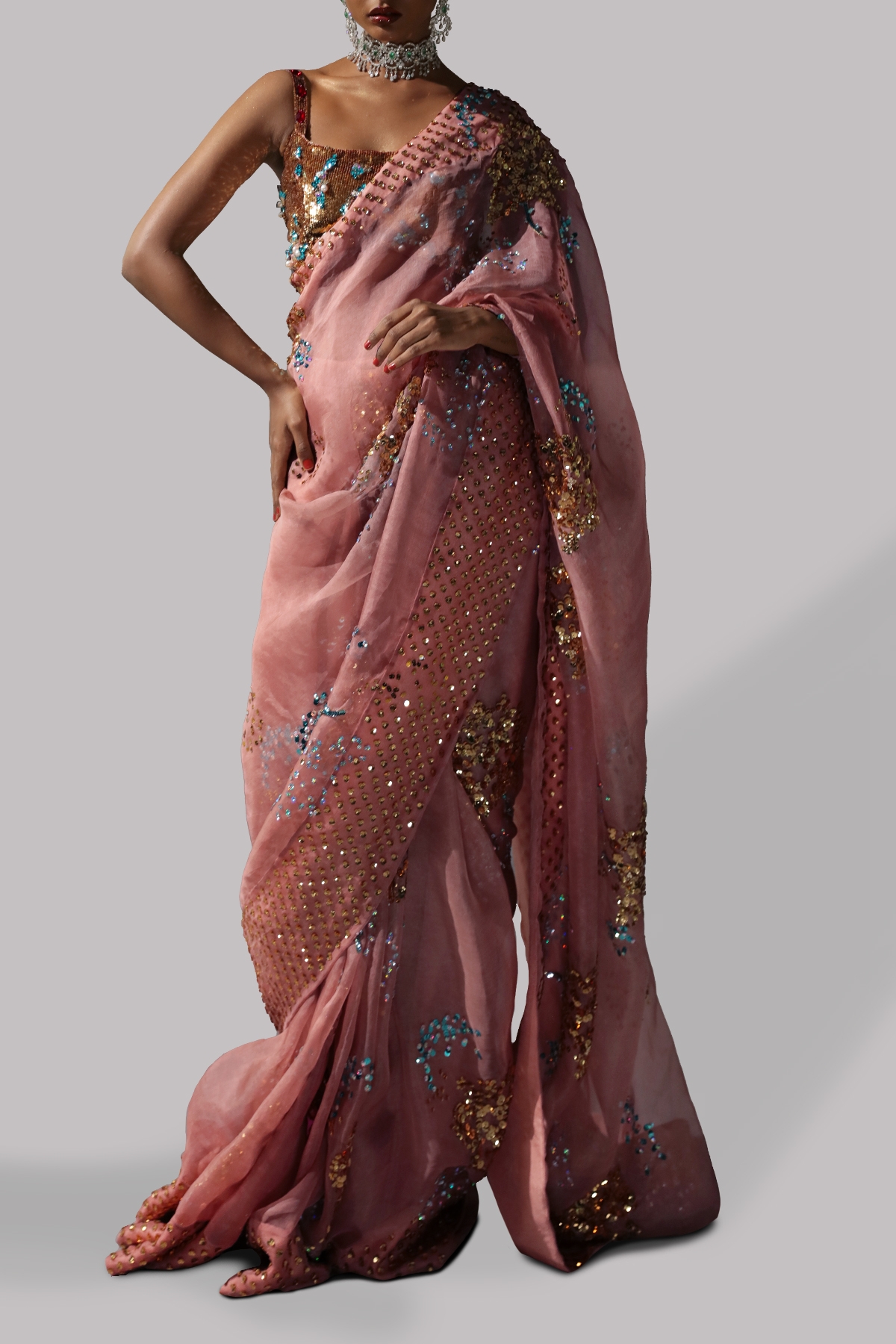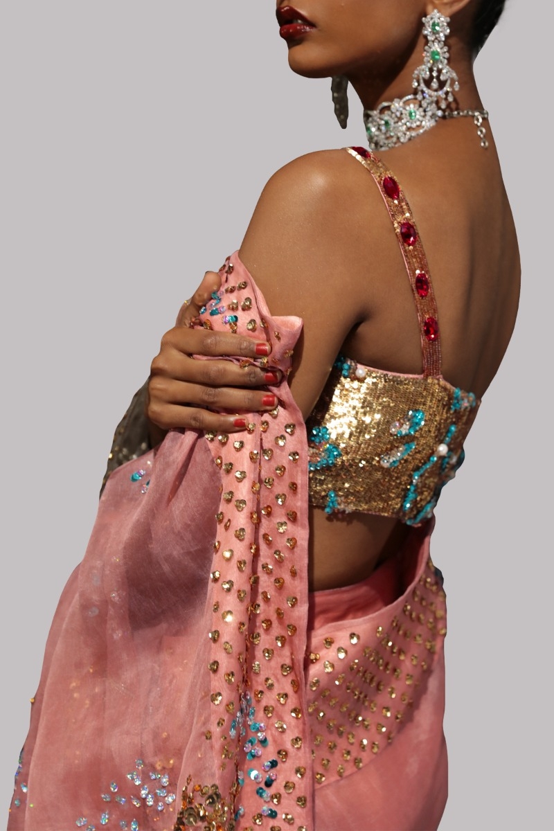 Dusty Pink organza sari with matching embellished dupion cropped blouse adorned with stones. Hand embellished with freshwater pearls, glistening sequins, dazzling crystals and gold beads. This sensational sari is no exception. The sari has stitched pleats for ease of wearing. Silk petticoat included.