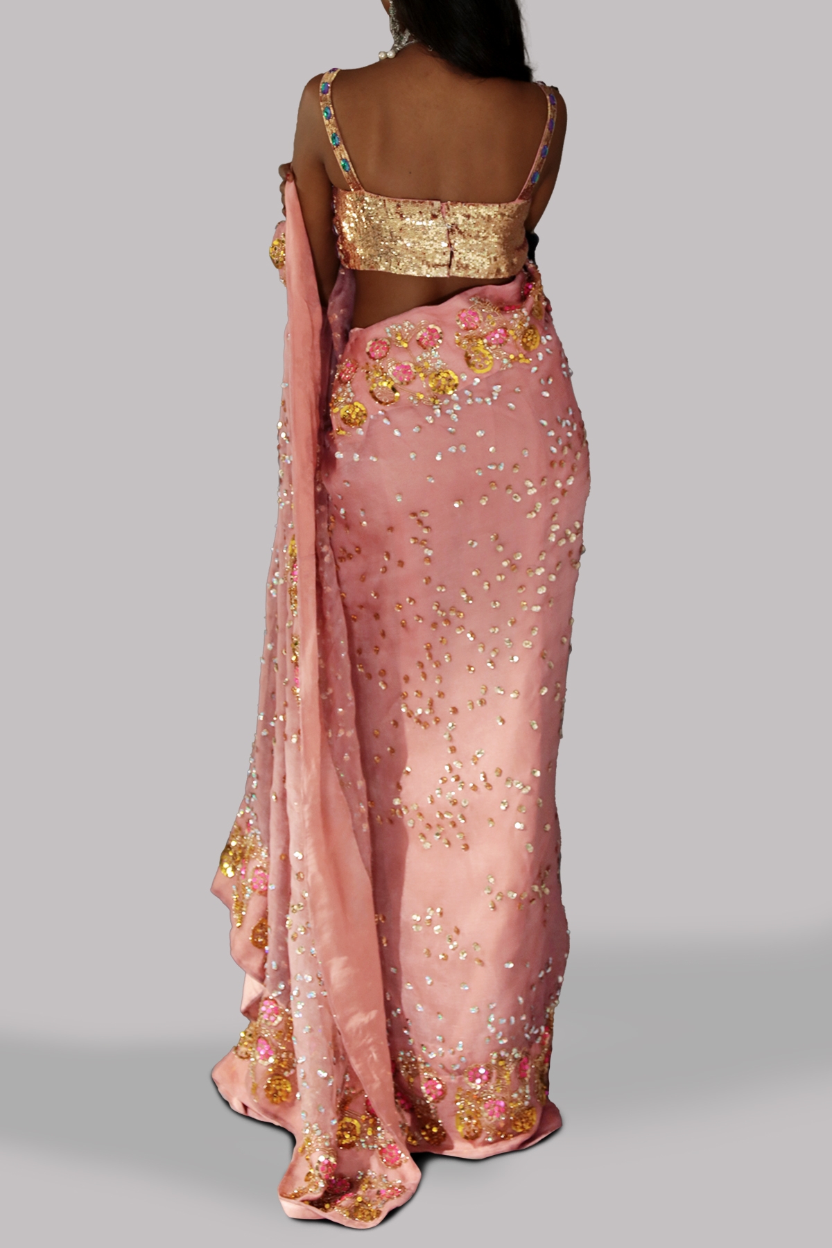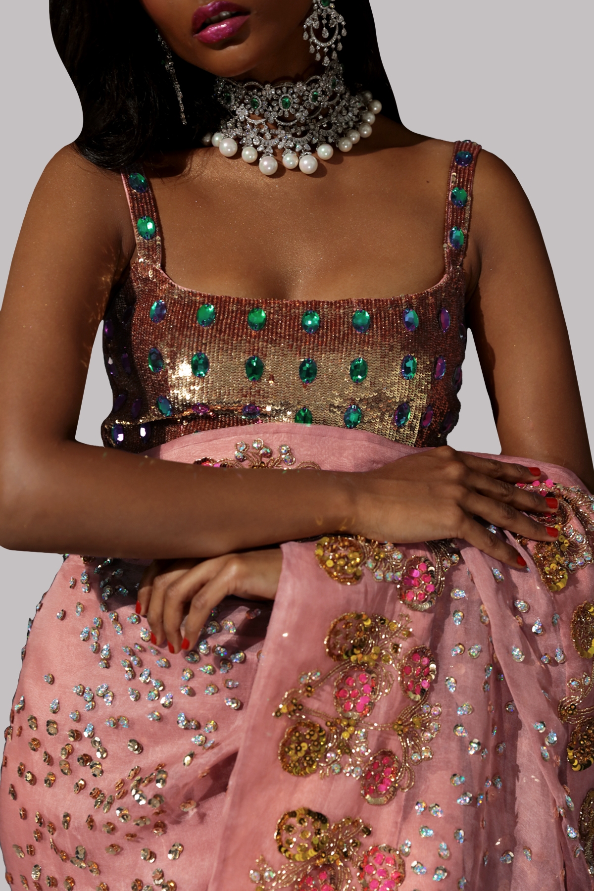 Dusty Pink organza sari with matching embellished dupion cropped blouse adorned with stones. Hand embellished with freshwater pearls, glistening sequins, dazzling crystals and gold beads. This sensational sari is no exception. The sari has stitched pleats for ease of wearing. Silk petticoat included.