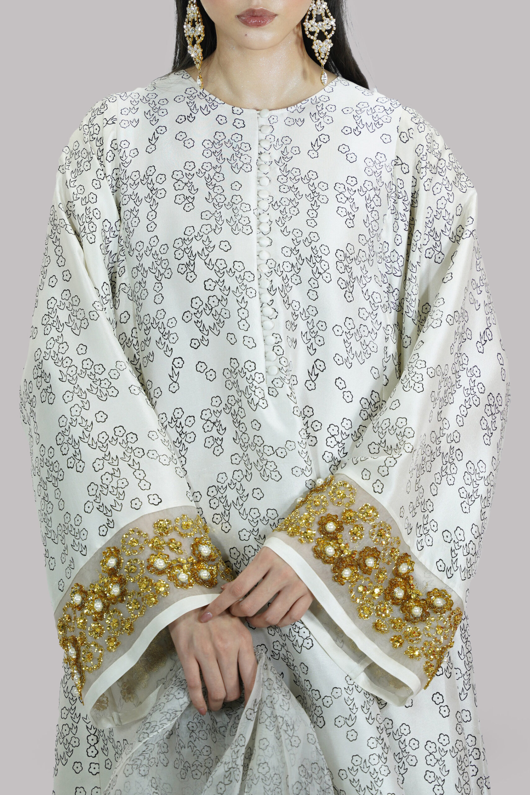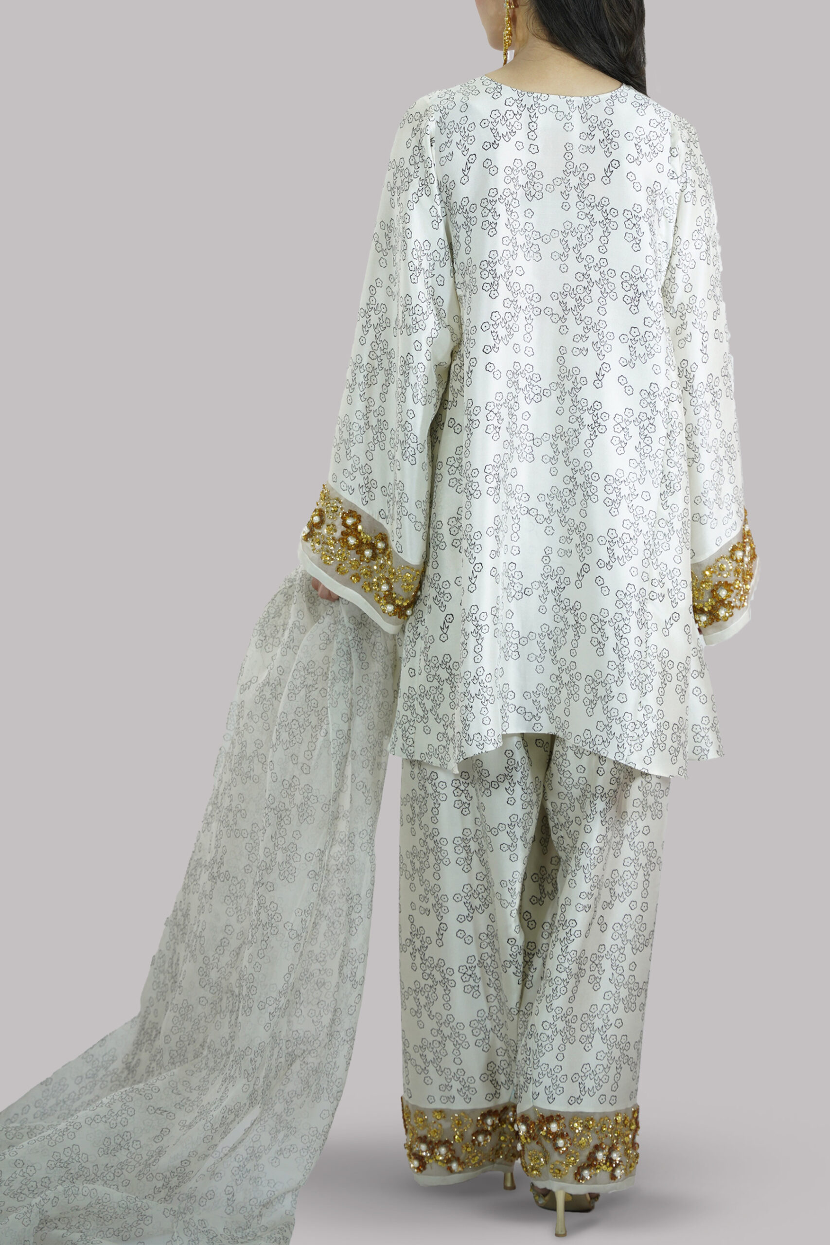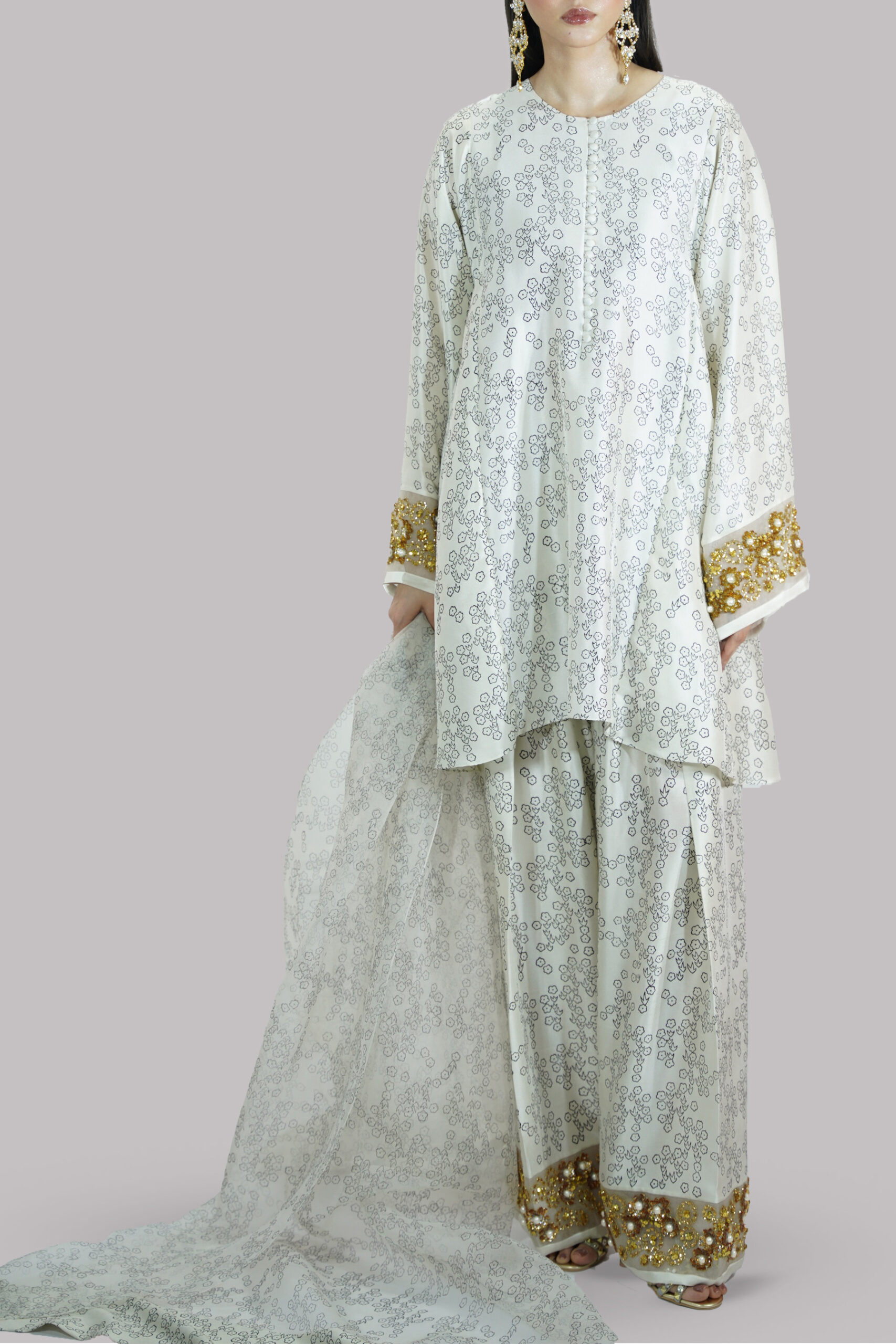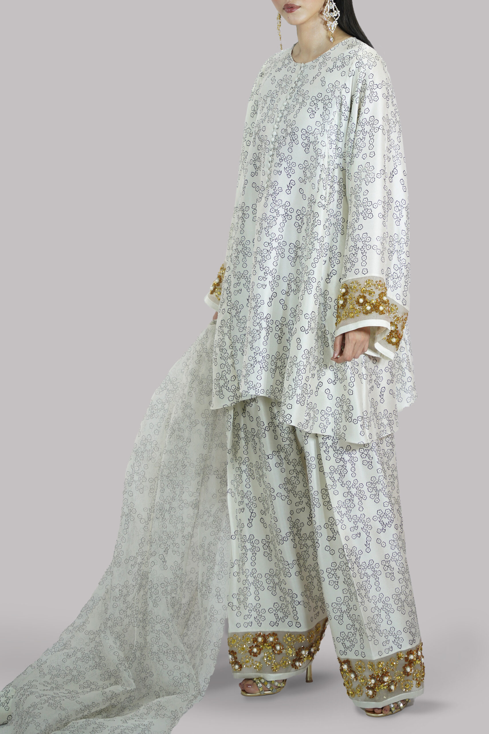 Egret Beige block printed and embellished raw silk tunic with a matching embellished shalwar and organza dupatta. The embroidery is done on organza panels on the sleeves cuff as well as the shalwar hem.