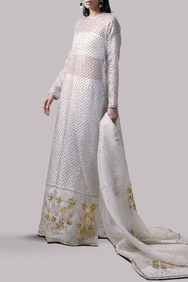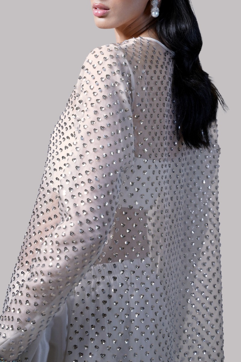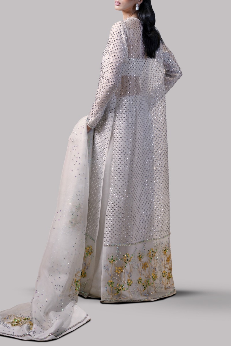 Egret, Oversized and flowing straight organza long maxi with side slit, exquisitely hand embellished with multi-coloured glittering French and Italian sequins. Its impeccably tailored with matching palazzo pants paired with matching embellished organza dupatta.