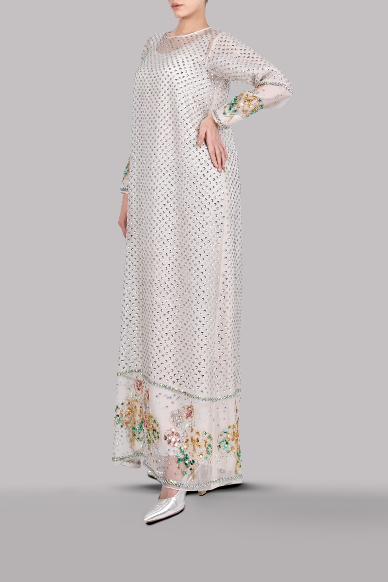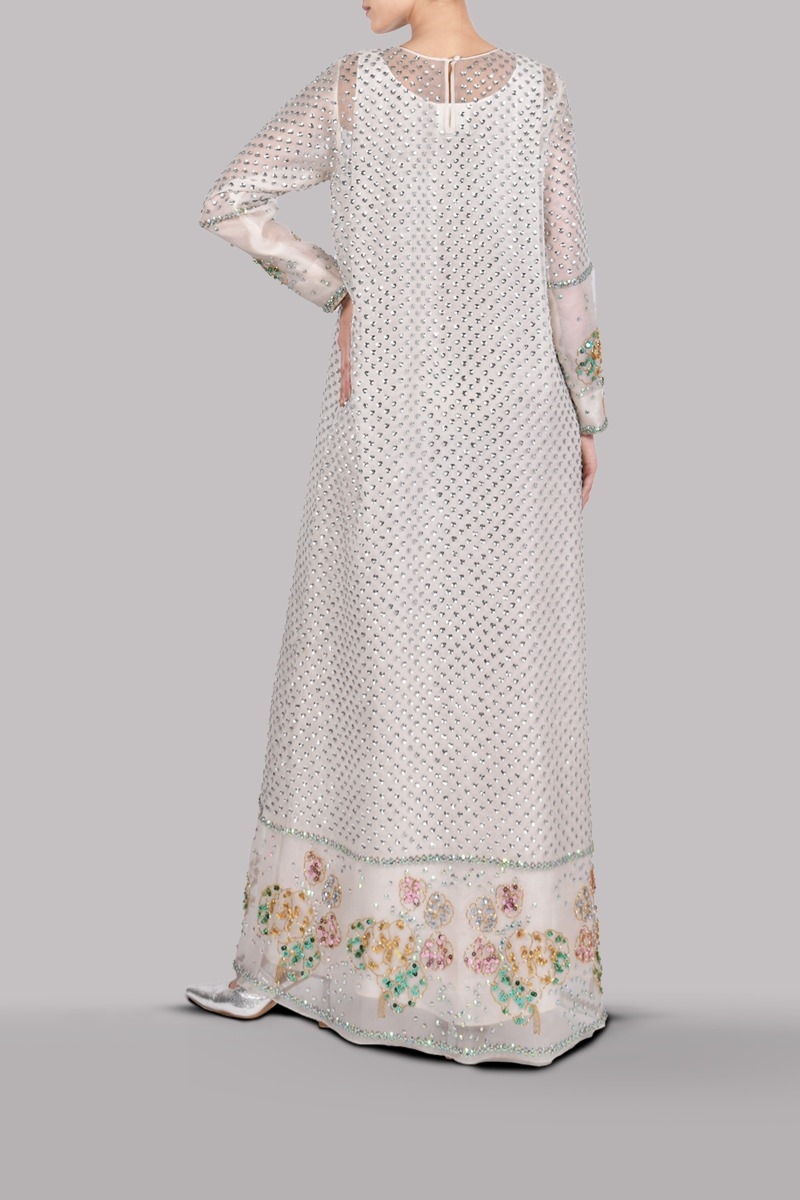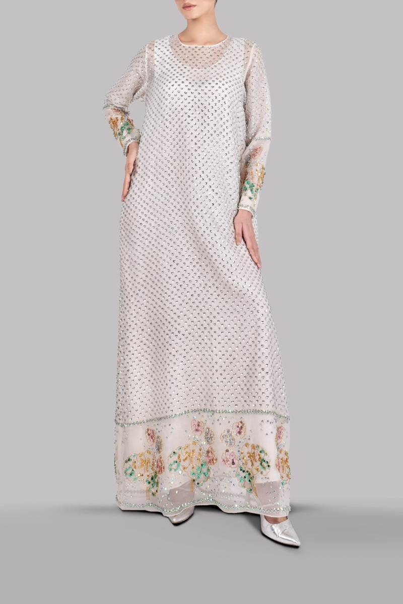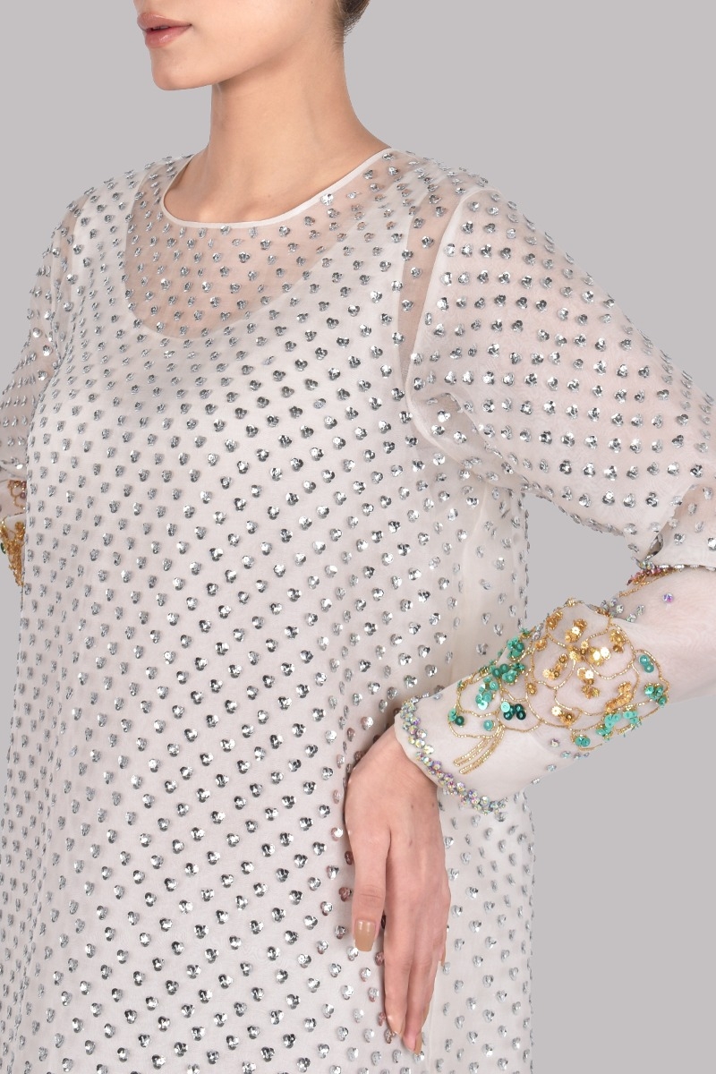 Egret, close neck oversized and flowing straight organza maxi dress, hand embellished with multi-coloured glittering French and Italian sequins.