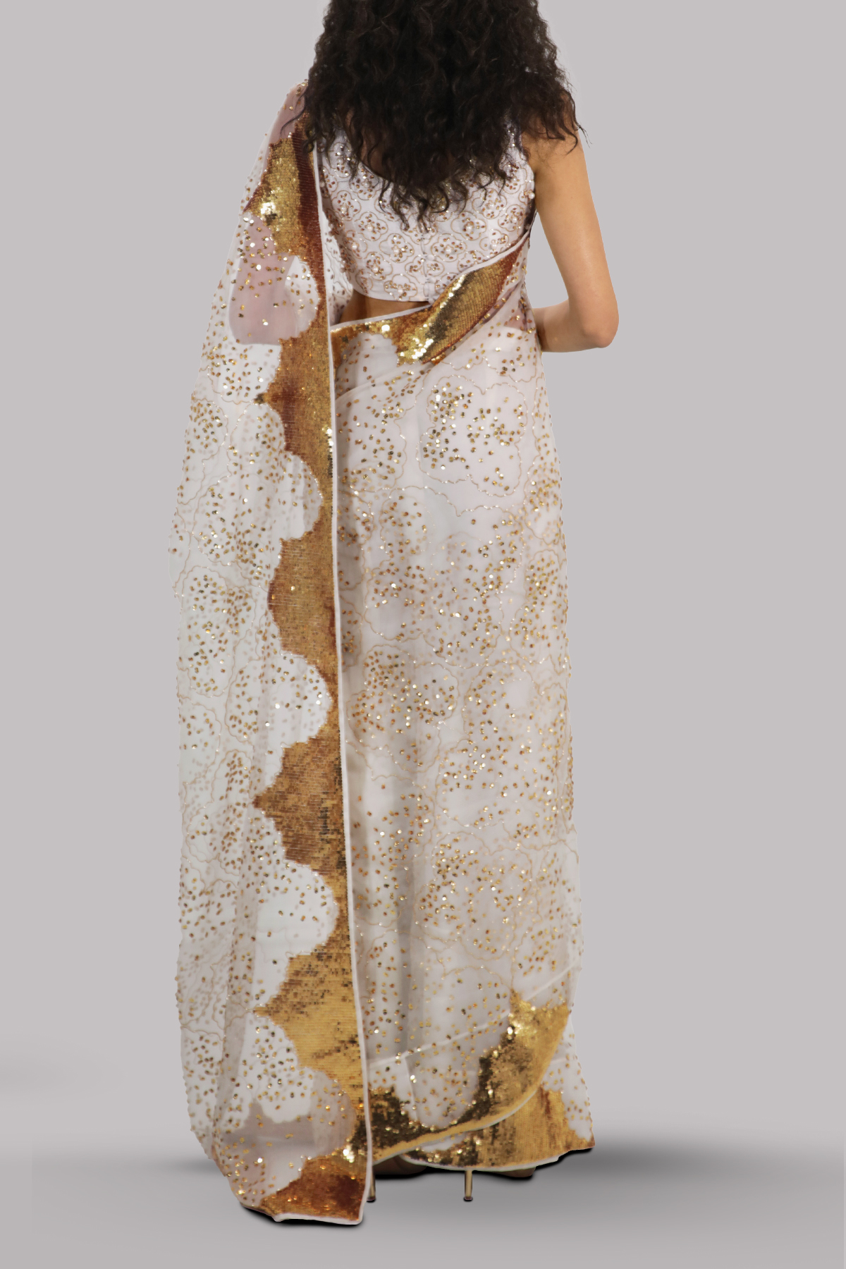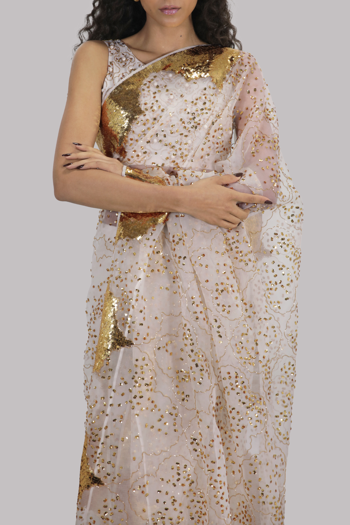 Organza sari with matching hand embellished with our intricate embellishments of sequins on cropped blouse. Hand embellished with freshwater pearls, gold coloured glittering sequins. This sensational sari is no exception. This is a stylish and perfect three piece look. The sari has stitched pleats for ease of wearing. Matching stitched underskirt included.