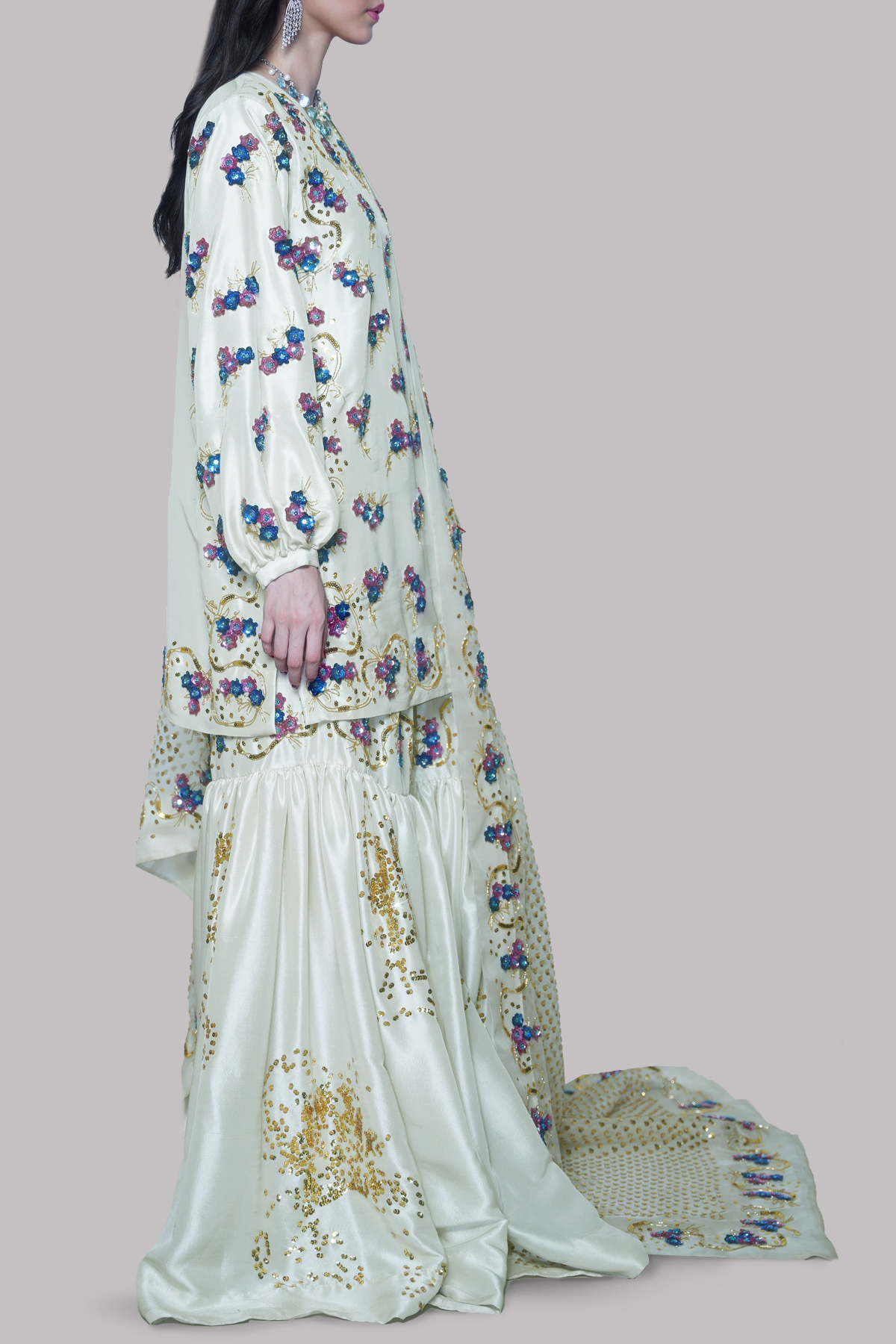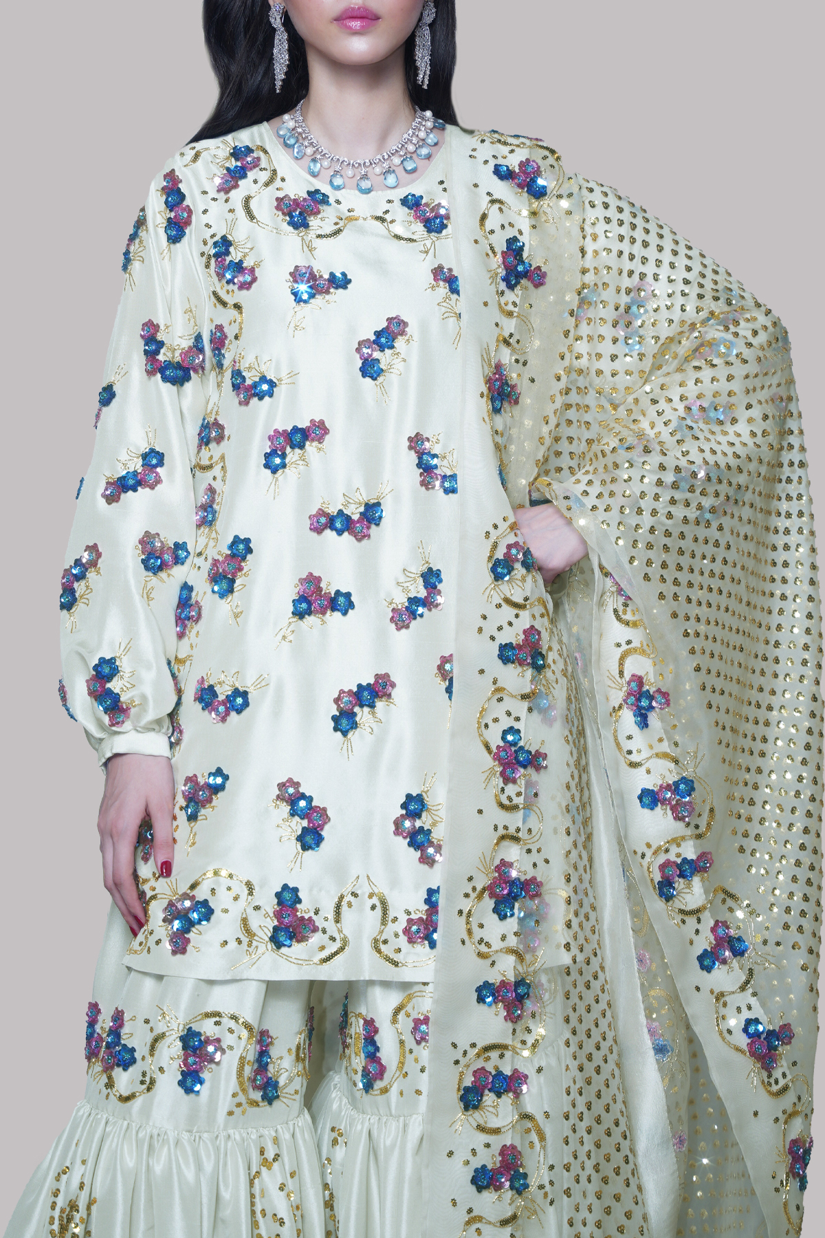 Step into timeless elegance with this Egret Embellished Tunic Set, crafted in a soft, graceful hue. The tunic features delicate French sequins, adding a subtle shimmer to its refined silhouette. Paired with a beautifully embellished gharara, the look exudes traditional charm with a modern touch. Completing the ensemble is a heavily embellished organza dupatta, cascading with intricate detailing that catches the light with every movement.