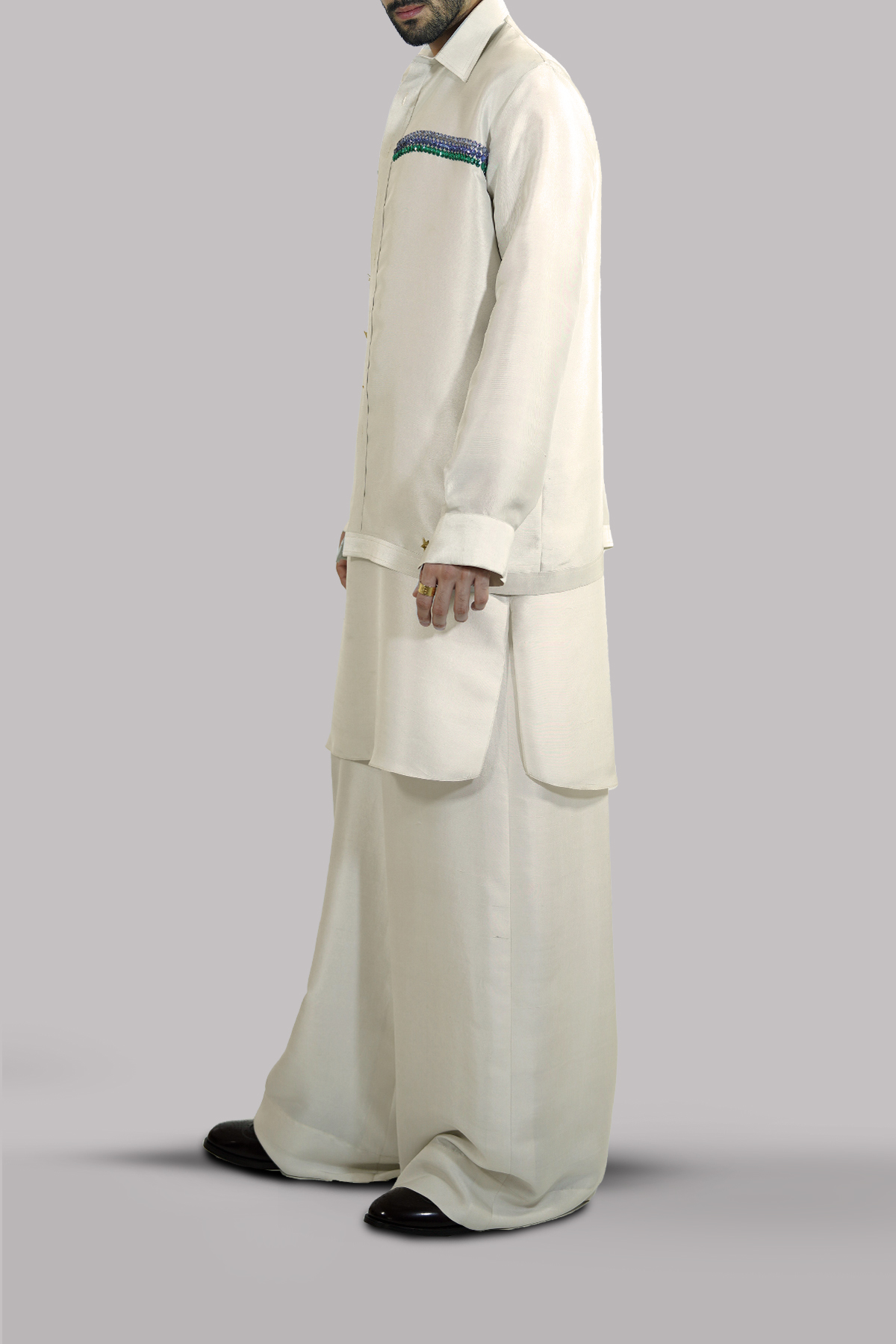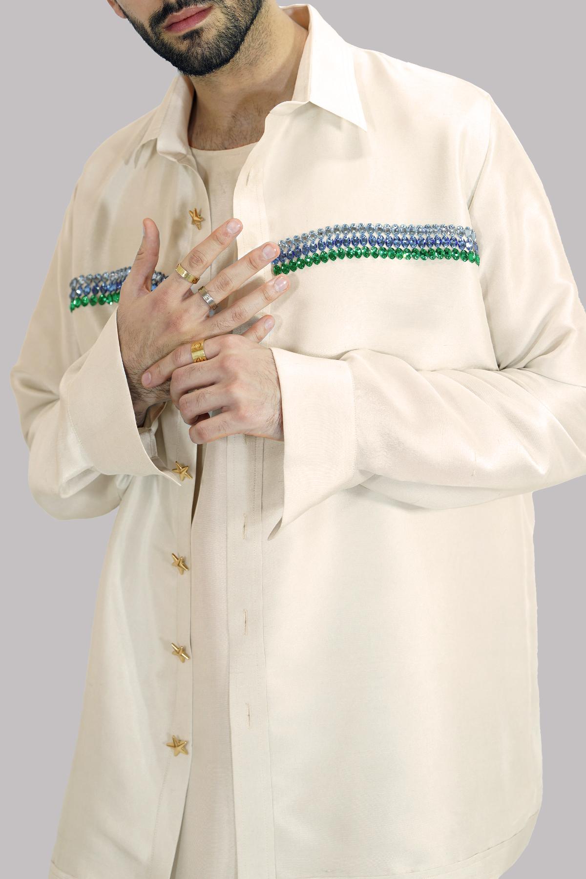 Oversized embellished raw silk jacket embellished with multi coloured stones appealingly shiny and smooth, elevated with perfect cut and extravagant details. Paired with impeccably tailored undershirt and trousers made from silk feels so luxurious.