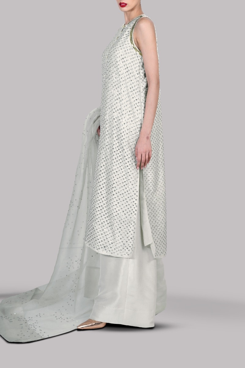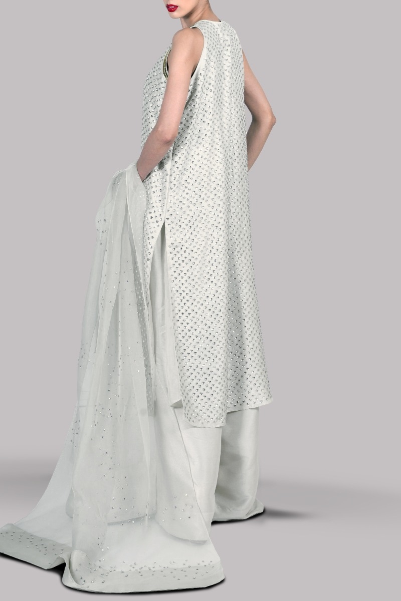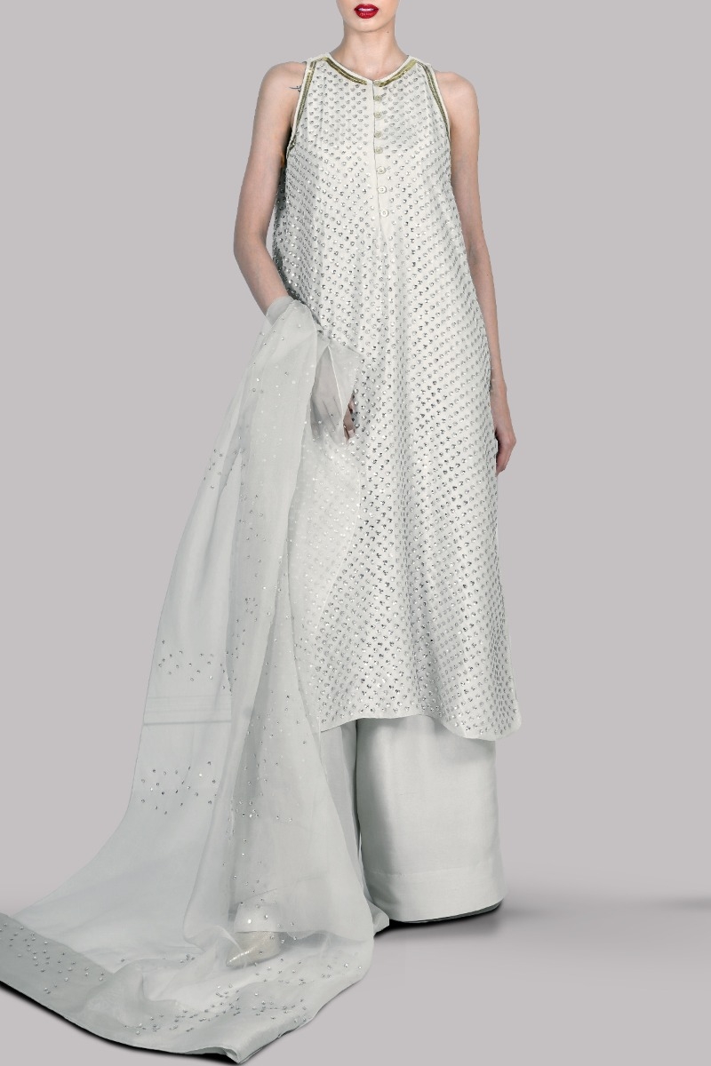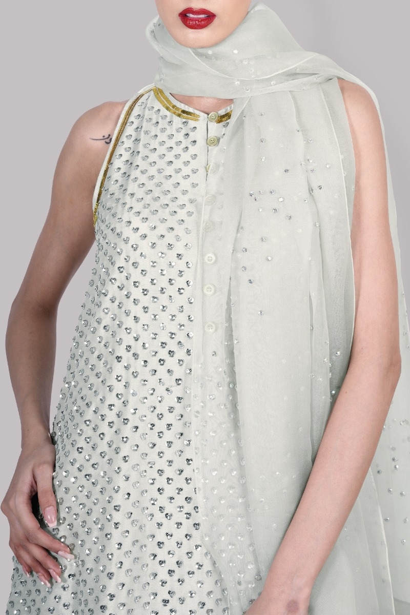 Egret close neck raw silk shirt decorated with gold and silver sparkling sequins with perfect cut and extravagant details, It’s impeccably tailored with matching raw silk palazzo pants, paired with crystal embellished organza dupatta.