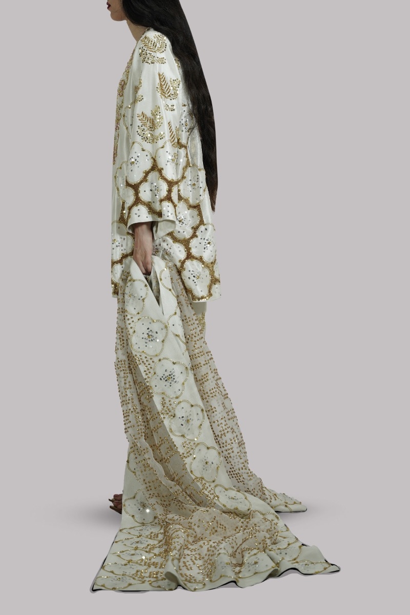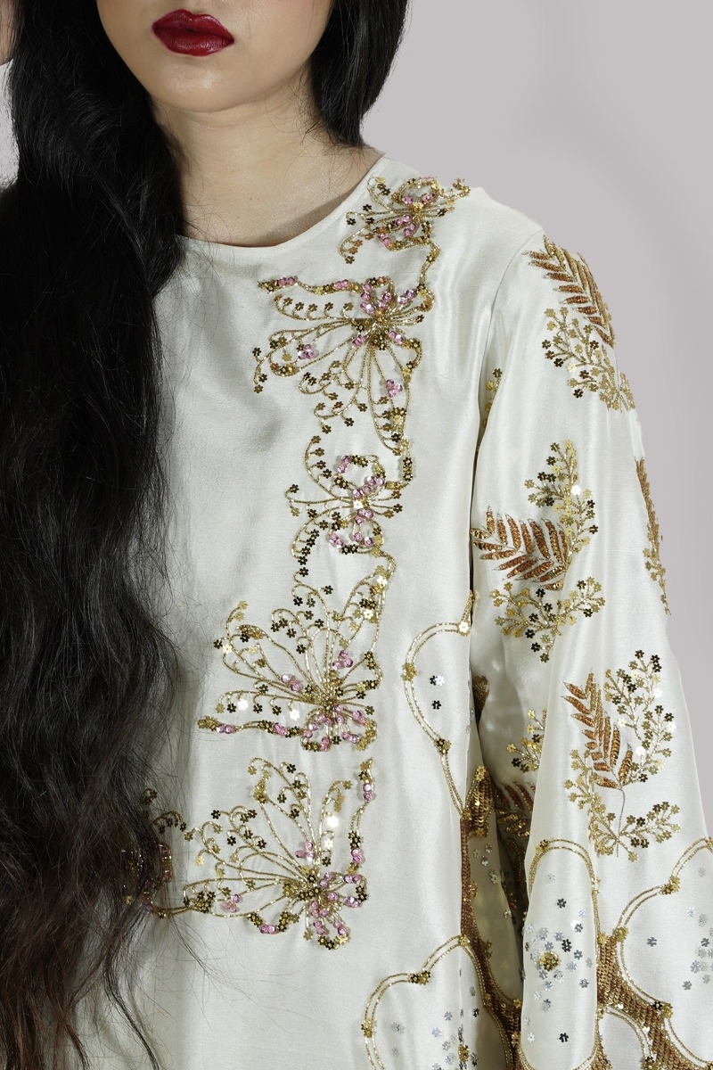 Egret embellished tunic with gold and multi coloured sequins. Impeccably tailored with matching egret embellished shalwar pants and detailed embellished organza dupatta.