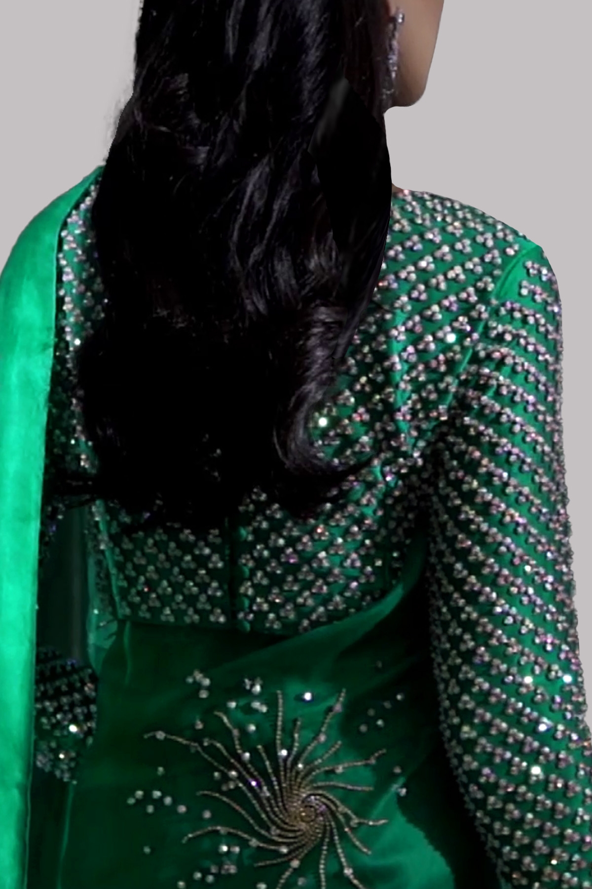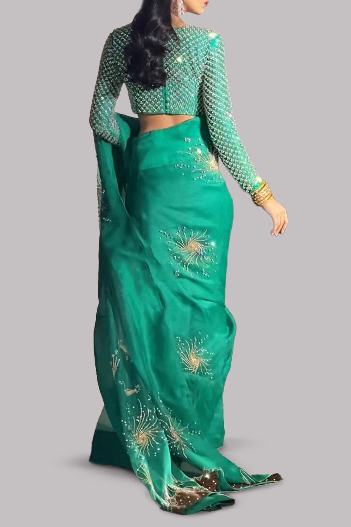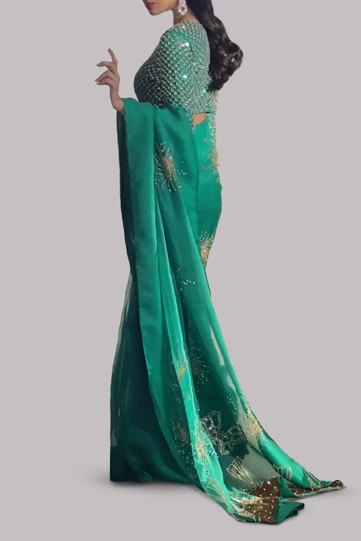 Emerald Green hand embellished organza sari with matching embellished dupion cropped blouse. Hand embellished with freshwater pearls, glittering sequins and gold beads. This sensational sari is no exception. Sari has an adjustable waist ties to ensure the most flattering fit. Silk petticoat included.
