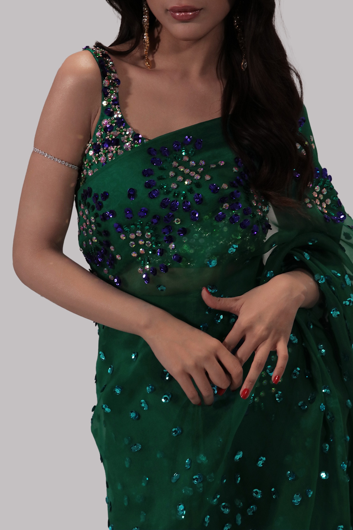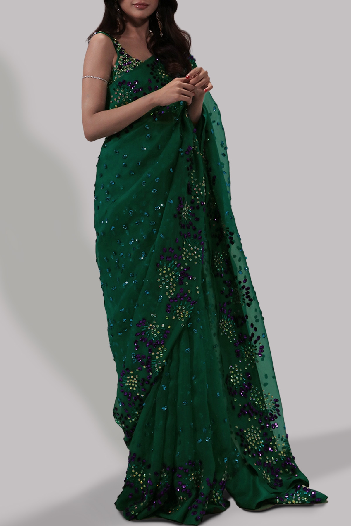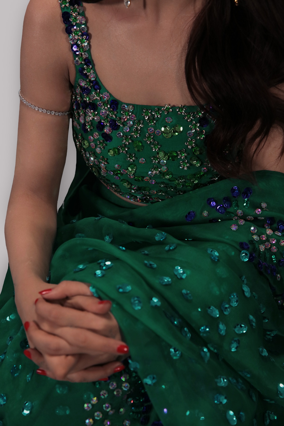 Emerald Green hand embellished organza sari with matching embellished dupion cropped blouse. Hand embellished with, glittering sequins and crystals. The sari has stitched pleats for ease of wearing. Silk petticoat included.