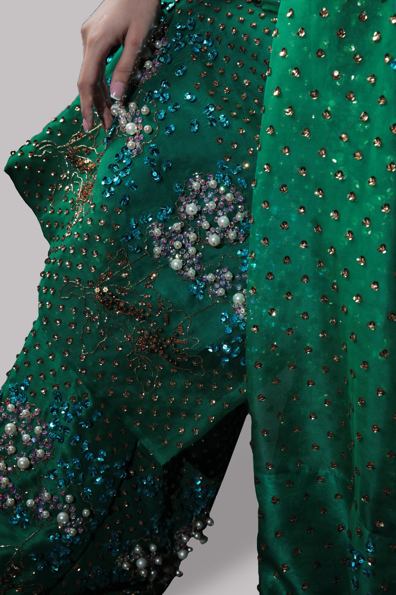 Emerald Green medium neckline straight organza shirt, the shirt is beautifully decorated with multi-coloured French and Italian sequins. Matching embellished raw silk wide legged pants that are expertly tailored in a flattering silhouette with matching embellished organza dupatta.