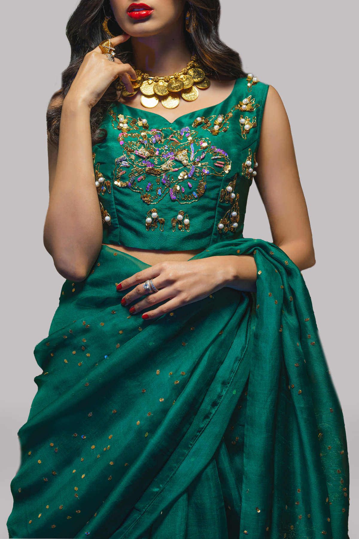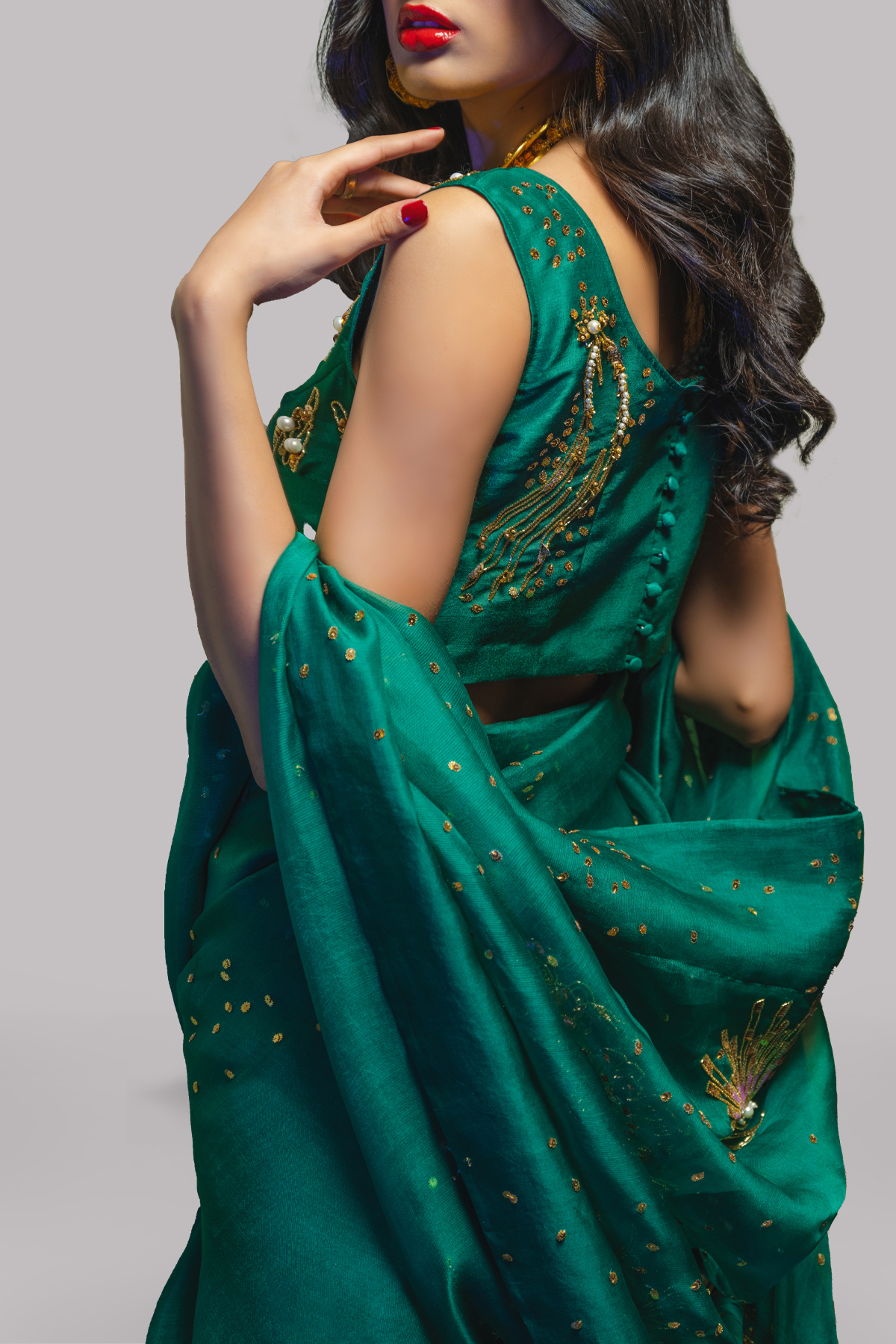 Grace meets glamour in this Evergreen embellished sari, crafted from lightweight fabric for an elegant drape. Paired with a richly adorned raw silk blouse, featuring intricate embroidery and sequin detailing.