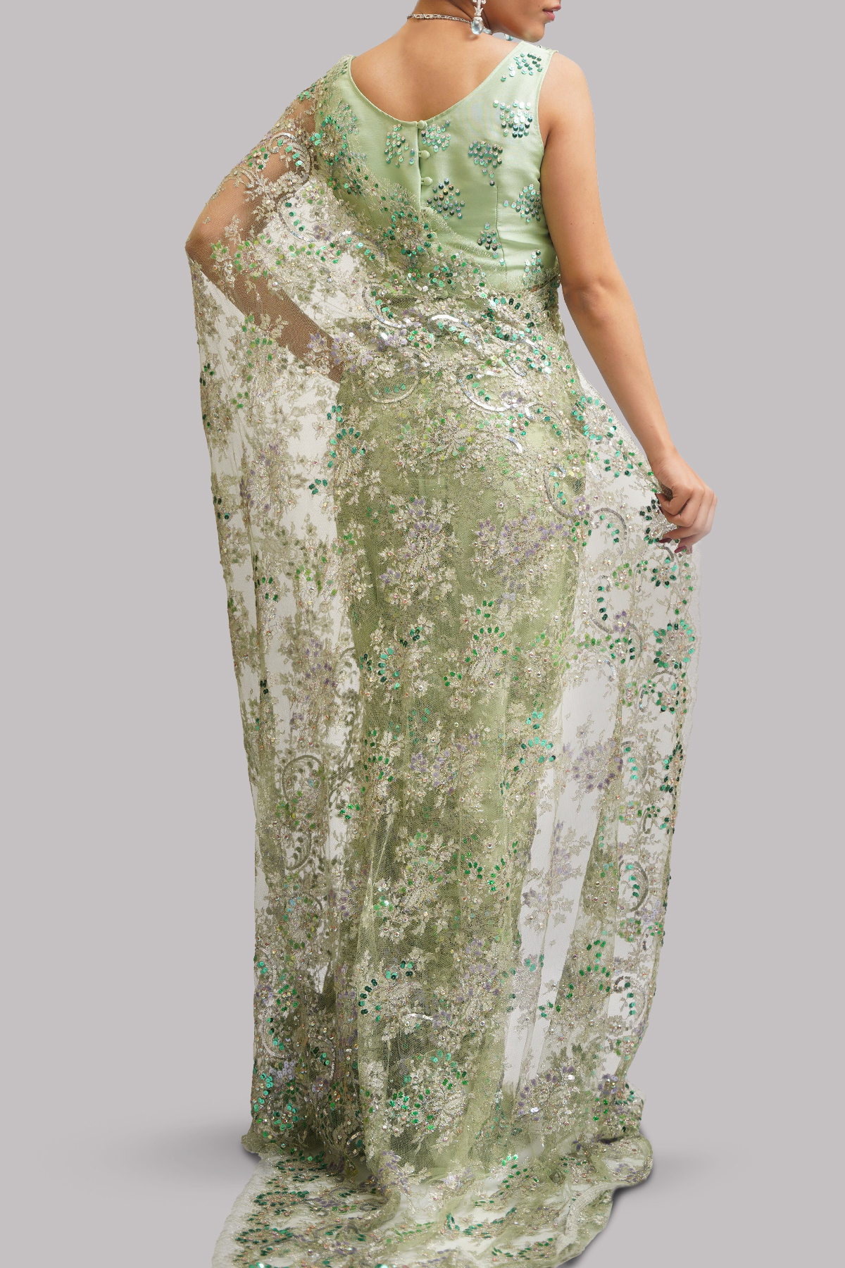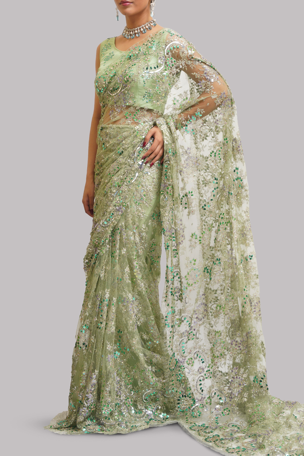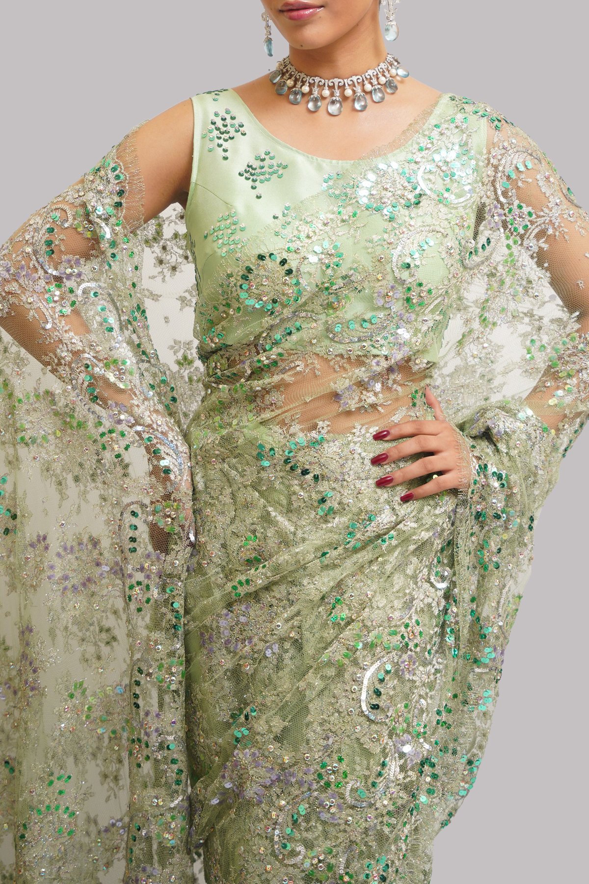 Ethereal and refined, this Fog Green Chantilly lace sari is delicately embellished to create a soft, luminous texture. Paired with a raw silk blouse featuring matching embellishments, the ensemble exudes understated elegance and modern grace.