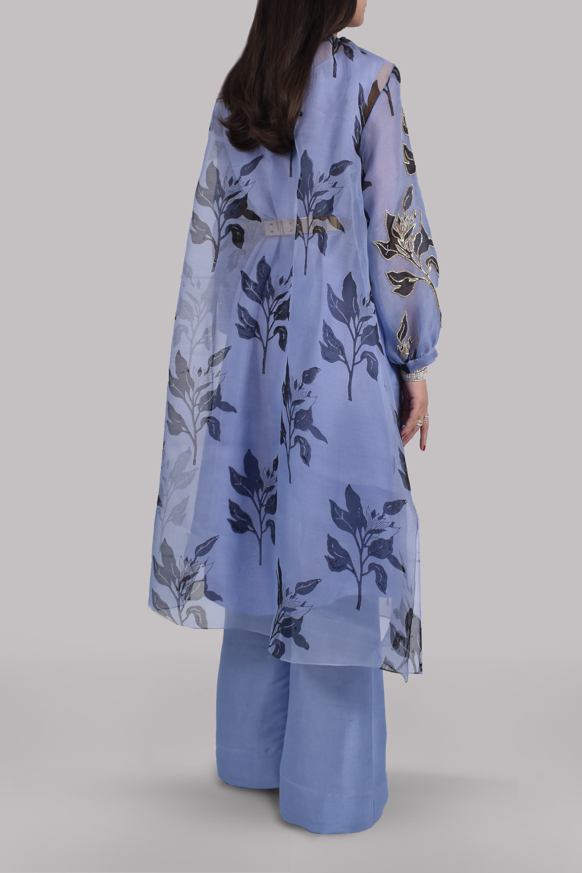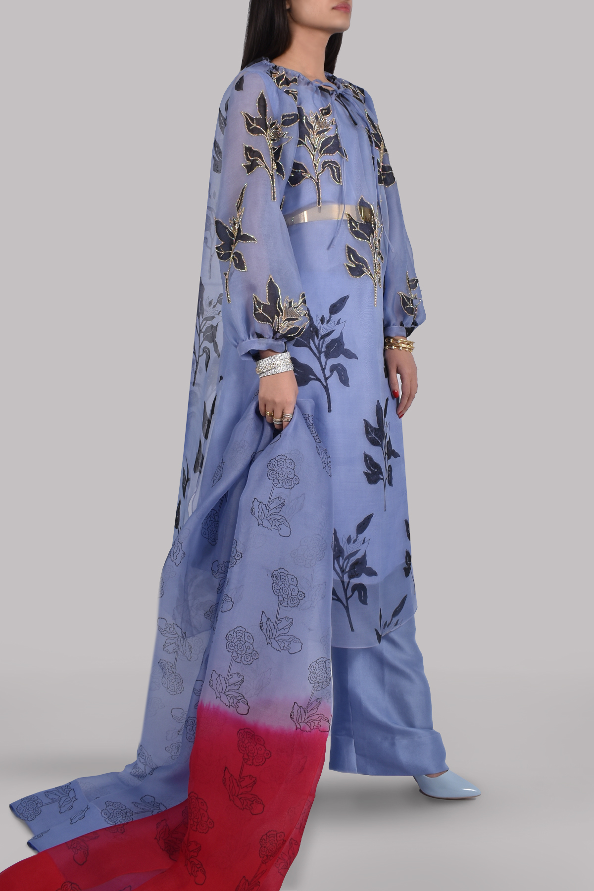 Soft and luxurious oversized organza block printed tunic, hand-embellished with crystals in a beautiful lilac colour. Silk slip included. Matching block printed dupatta. Matching wide-legged full length pants.