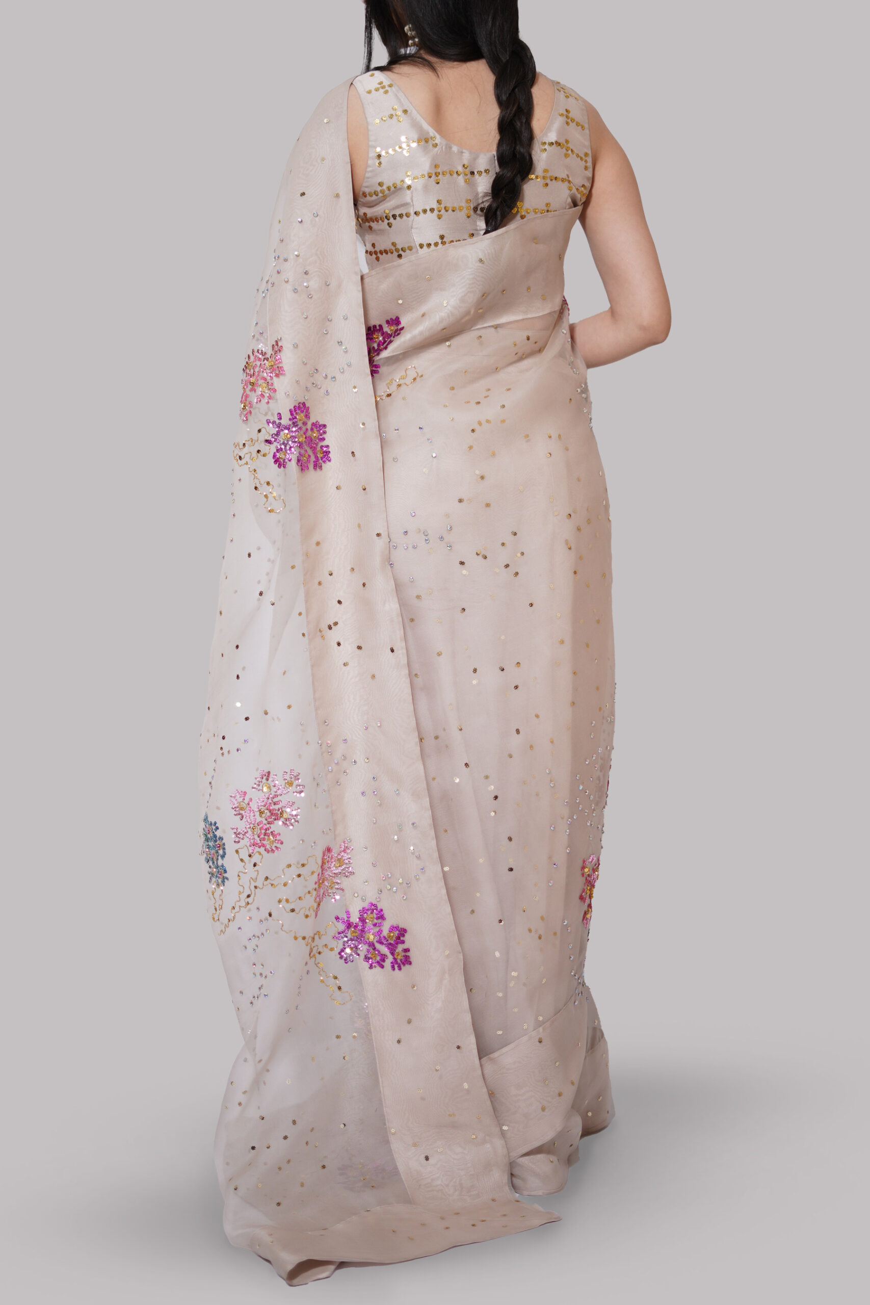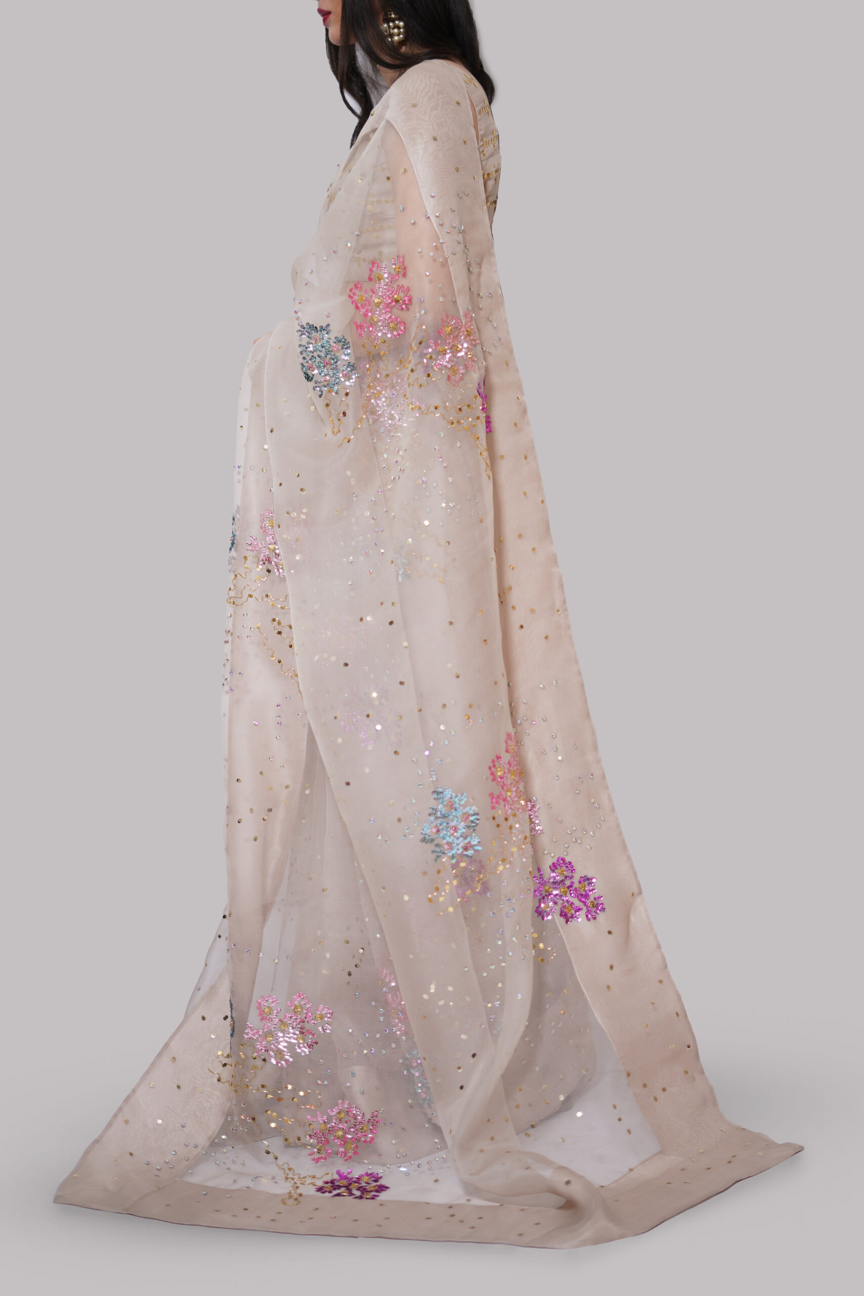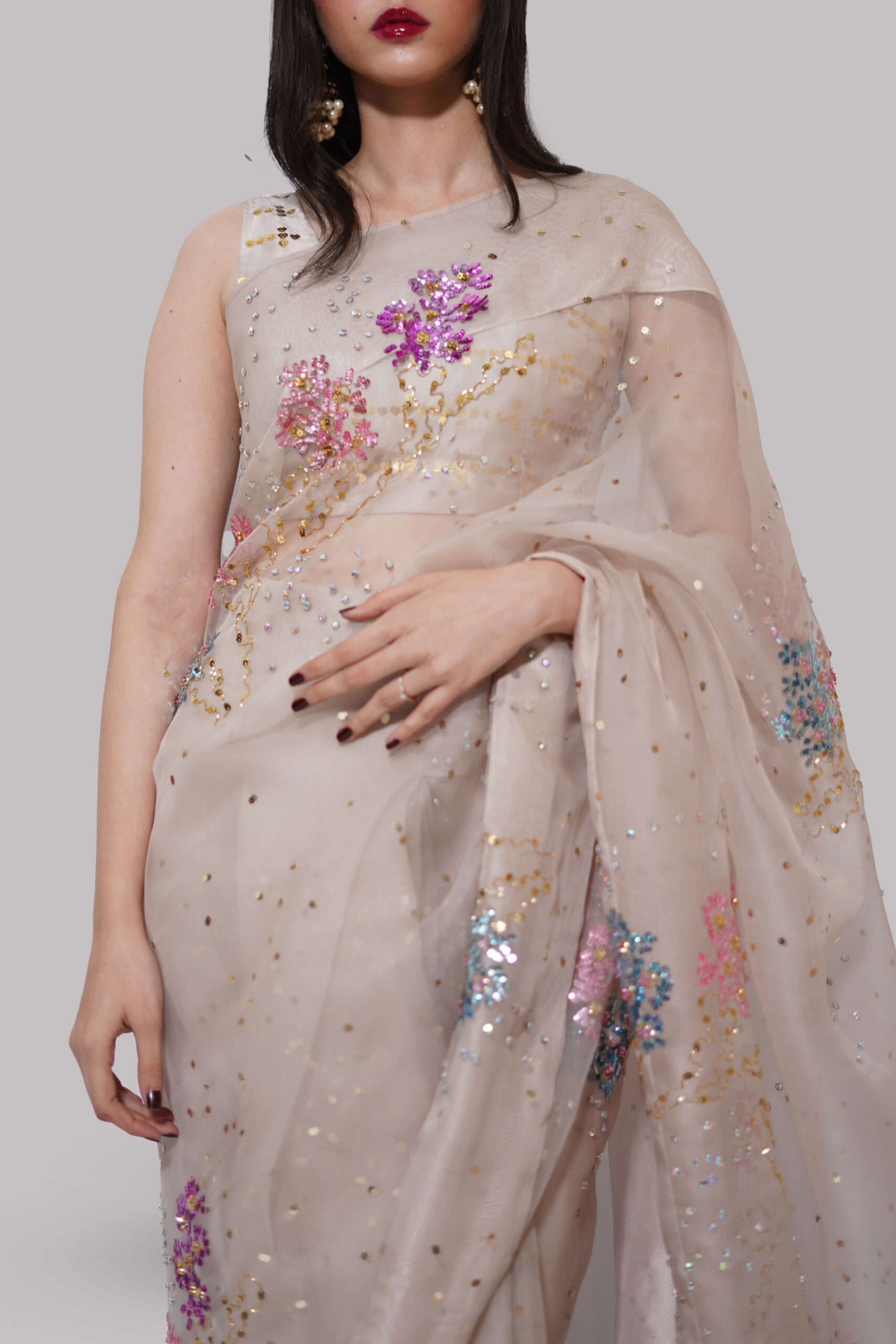 French Oak Embellished Organza Sari