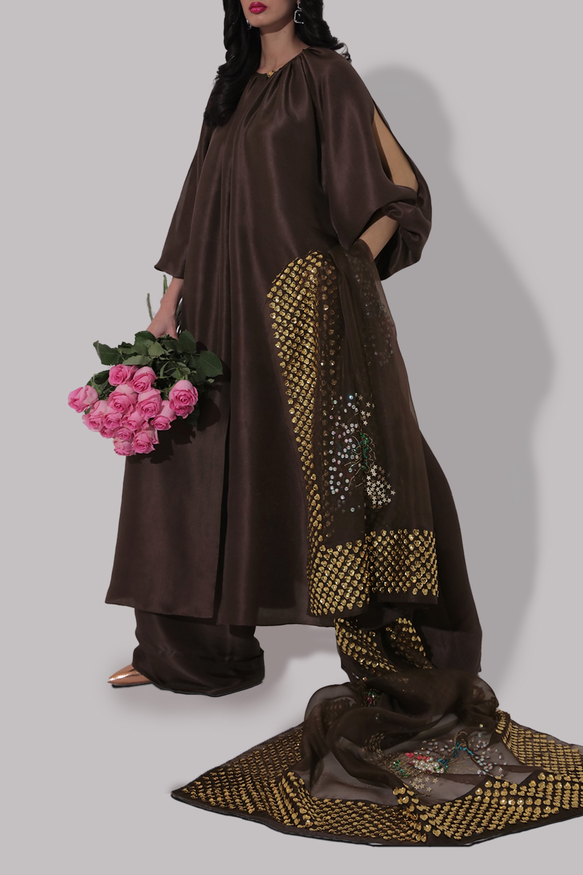 French Roast, oversized raw silk dress with gathers on neck, adorned with gold French buttons. Matching raw silk wide legged pants and embellished organza dupatta with sequins.