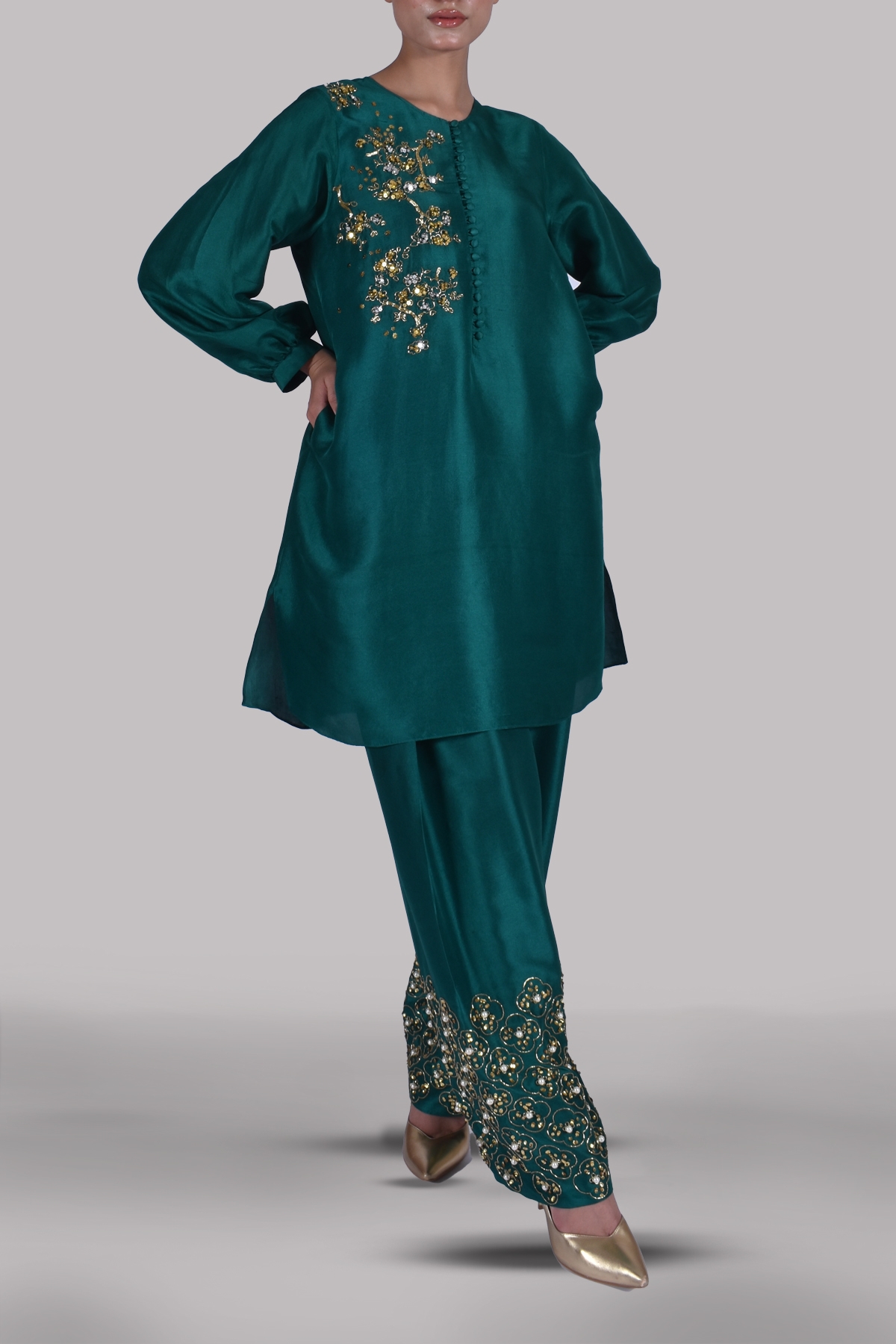 Galapagos Green close neck raw silk shirt adorned with front button opening with perfect cut and extravagant details. It’s impeccably tailored with matching embellished raw silk shalwar pants with glittering sequins.