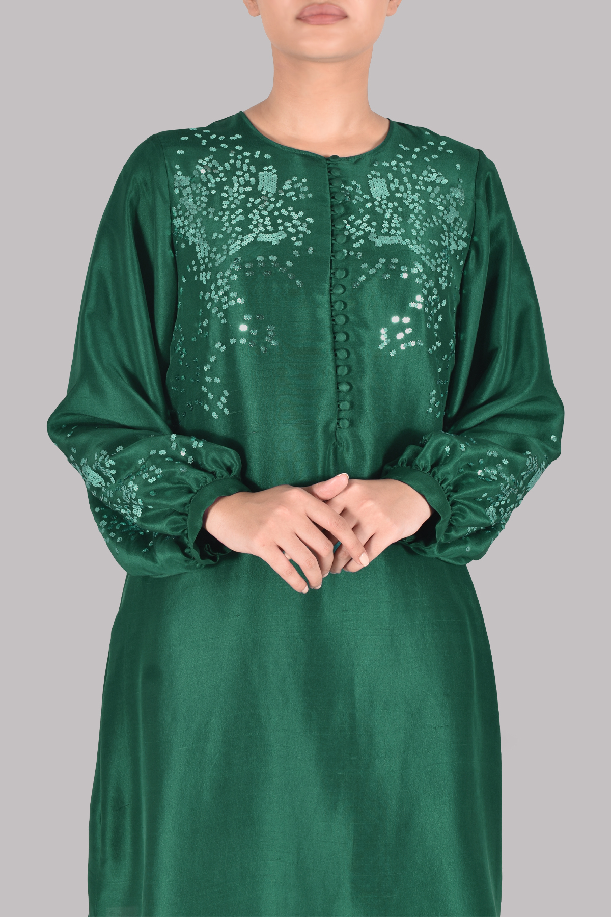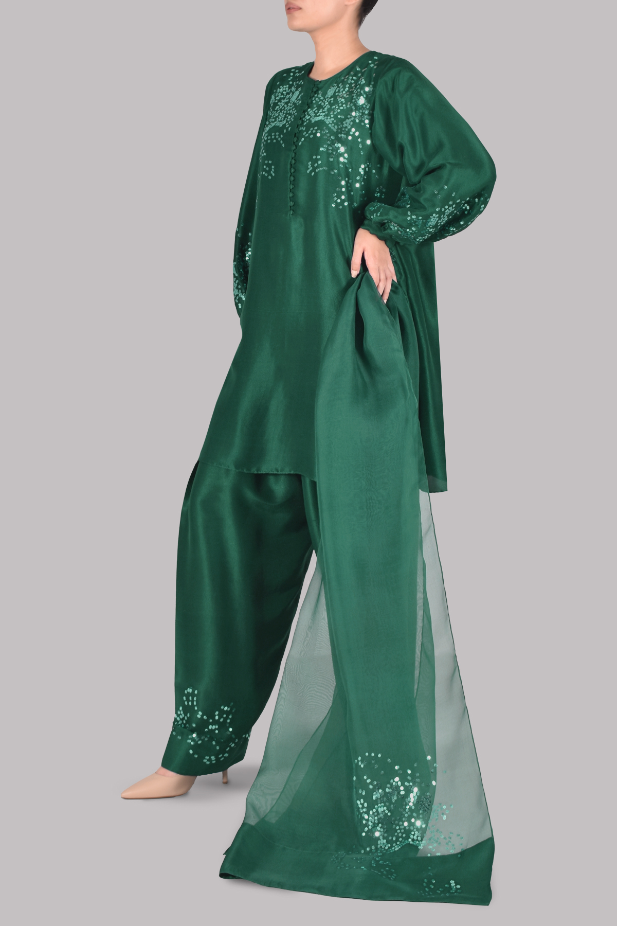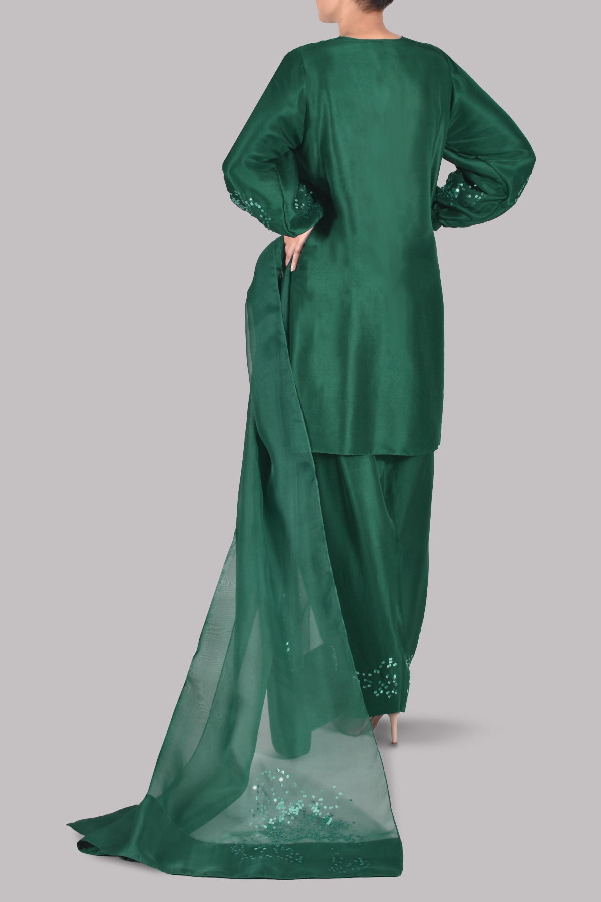 this Galapagos Green raw silk ensemble, richly embellished with delicate sequins for a sophisticated shimmer. The matching shalwar mirrors the tunic’s elegance, while the embellished organza dupatta adds a graceful finishing touch.