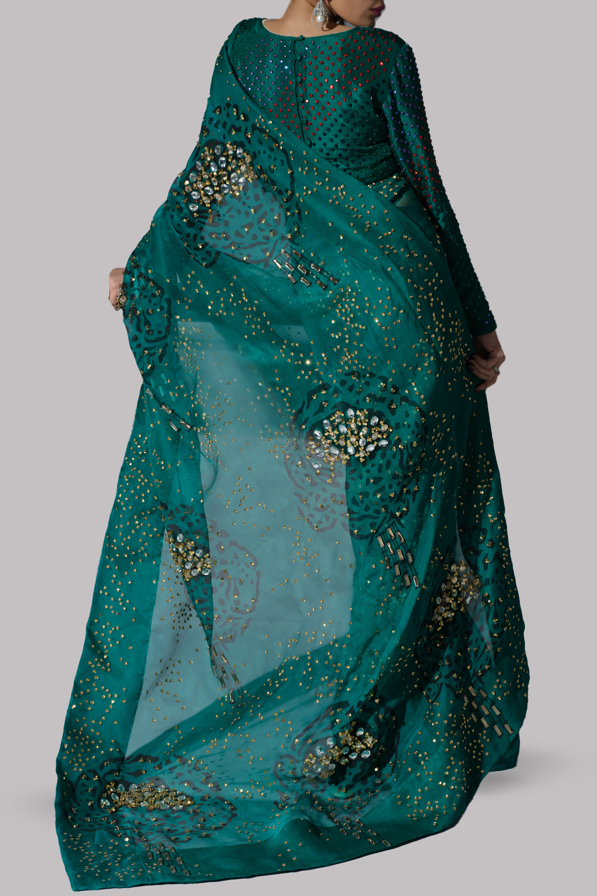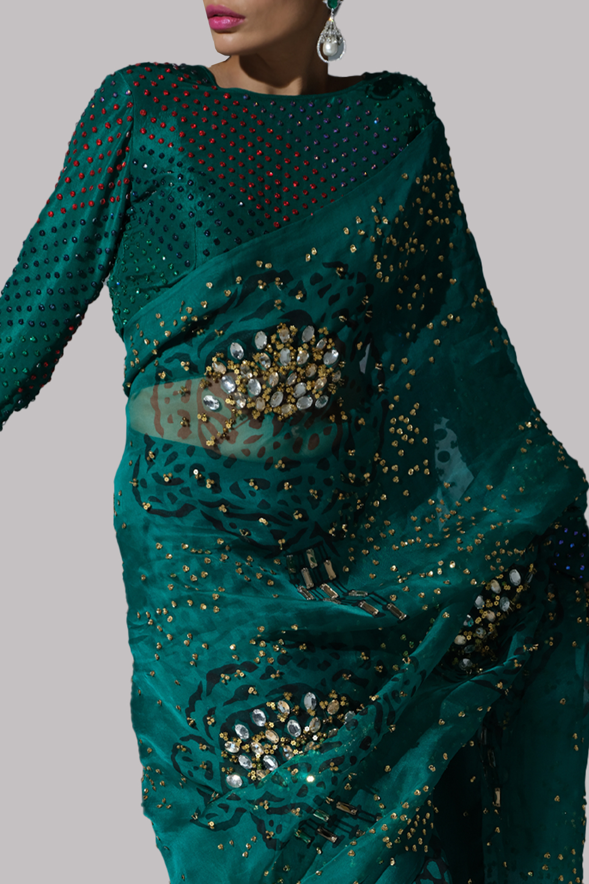 Turn heads in this stunning Galapagos green organza sari, delicately embellished for a soft, shimmering effect. Paired with a rich raw silk blouse, adorned with multi-coloured swarovski stones, this ensemble strikes the perfect balance between elegance and modern sparkle.