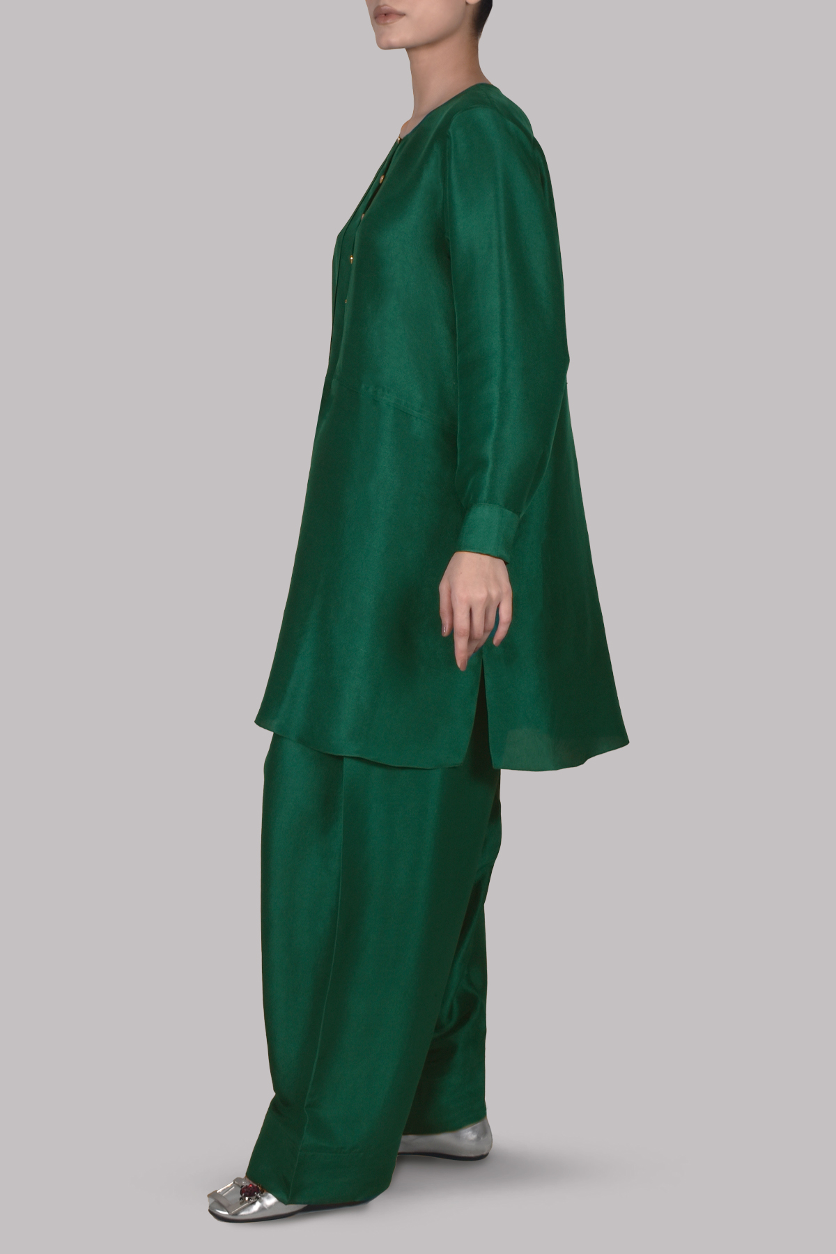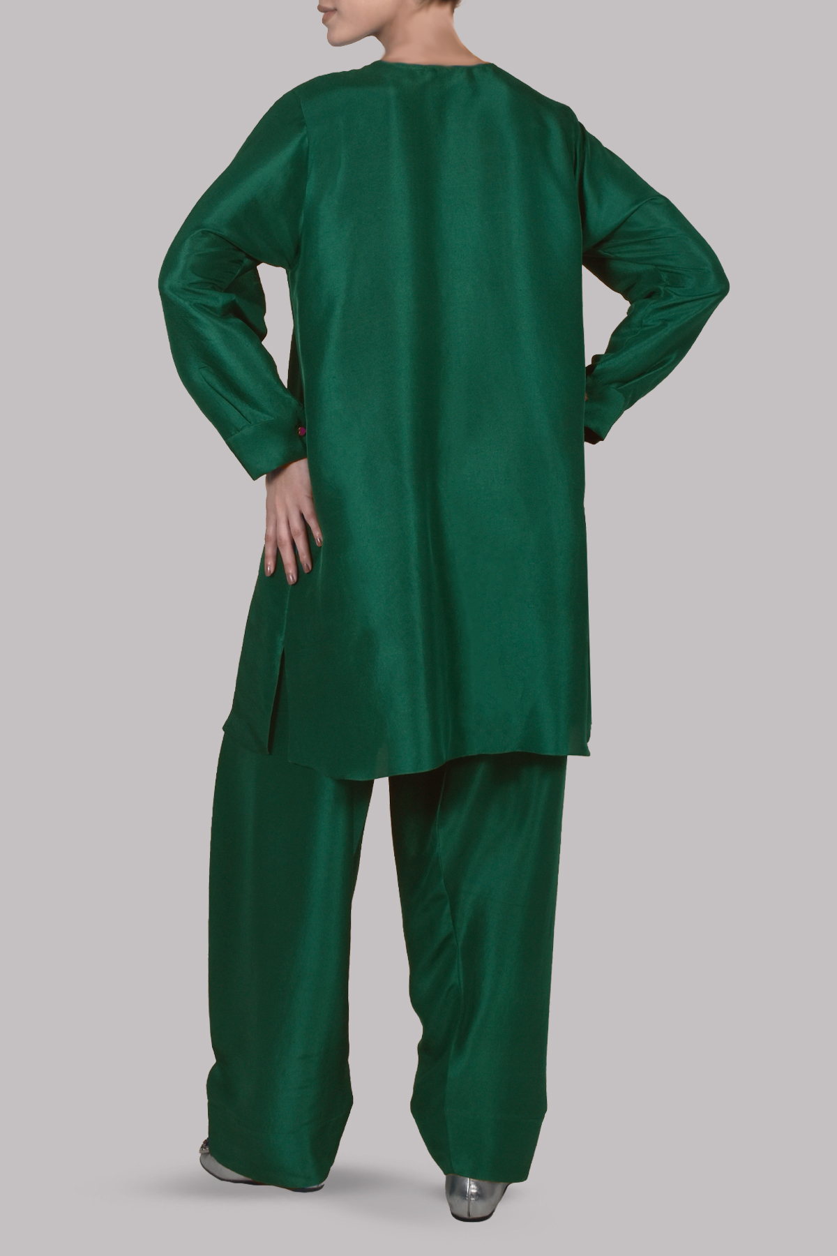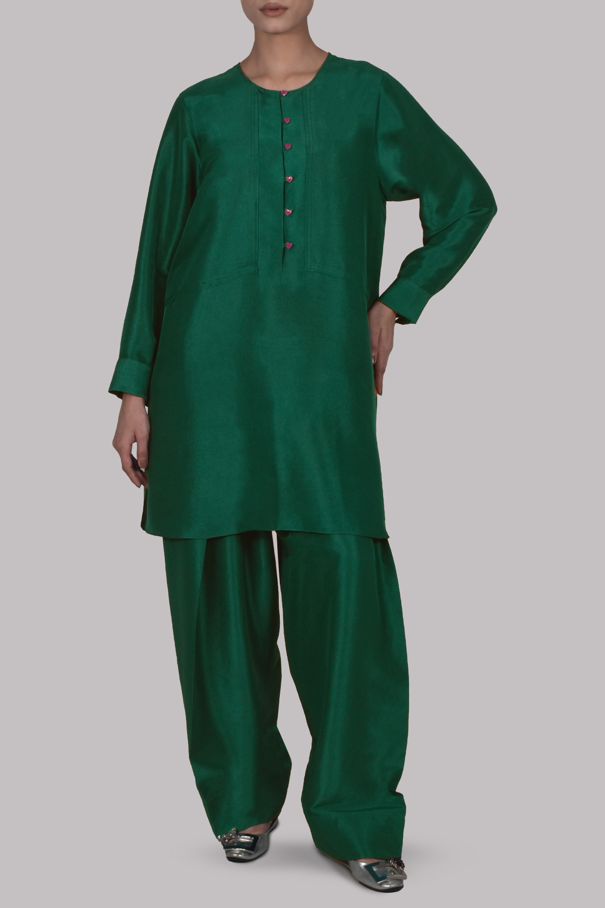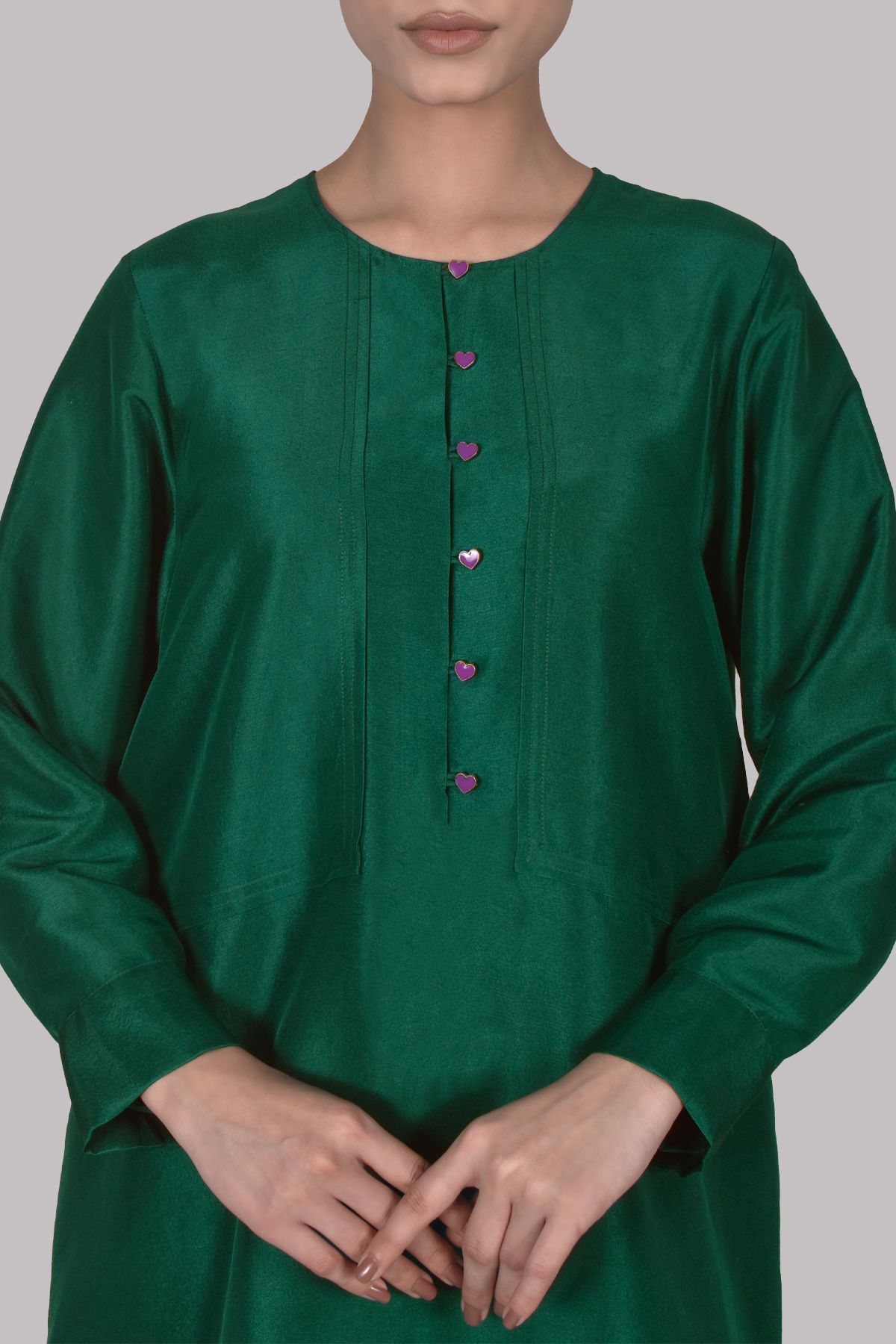 Rendered in a rich Galapagos Green hue, this raw silk tunic is elevated with delicate detailing along the front and finished with French heart buttons, a subtle nod to romantic craftsmanship. The tailored cuff sleeves bring structure, while the matching raw silk shalwar completes the ensemble with timeless elegance.