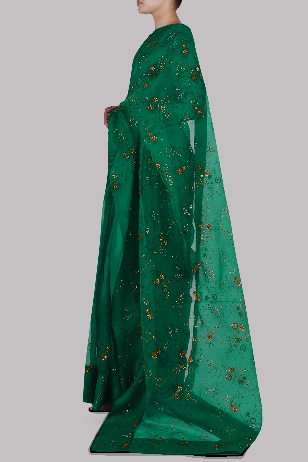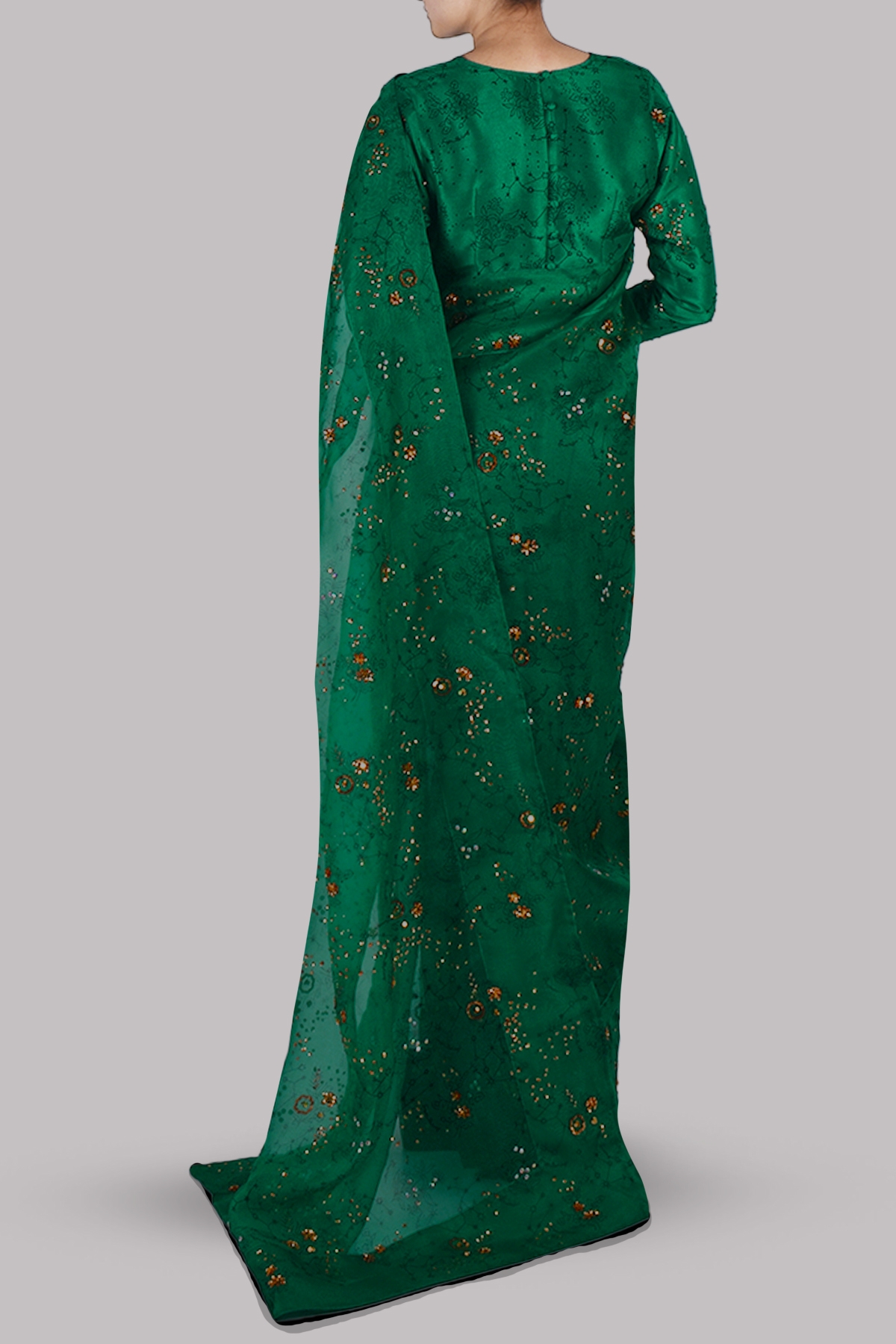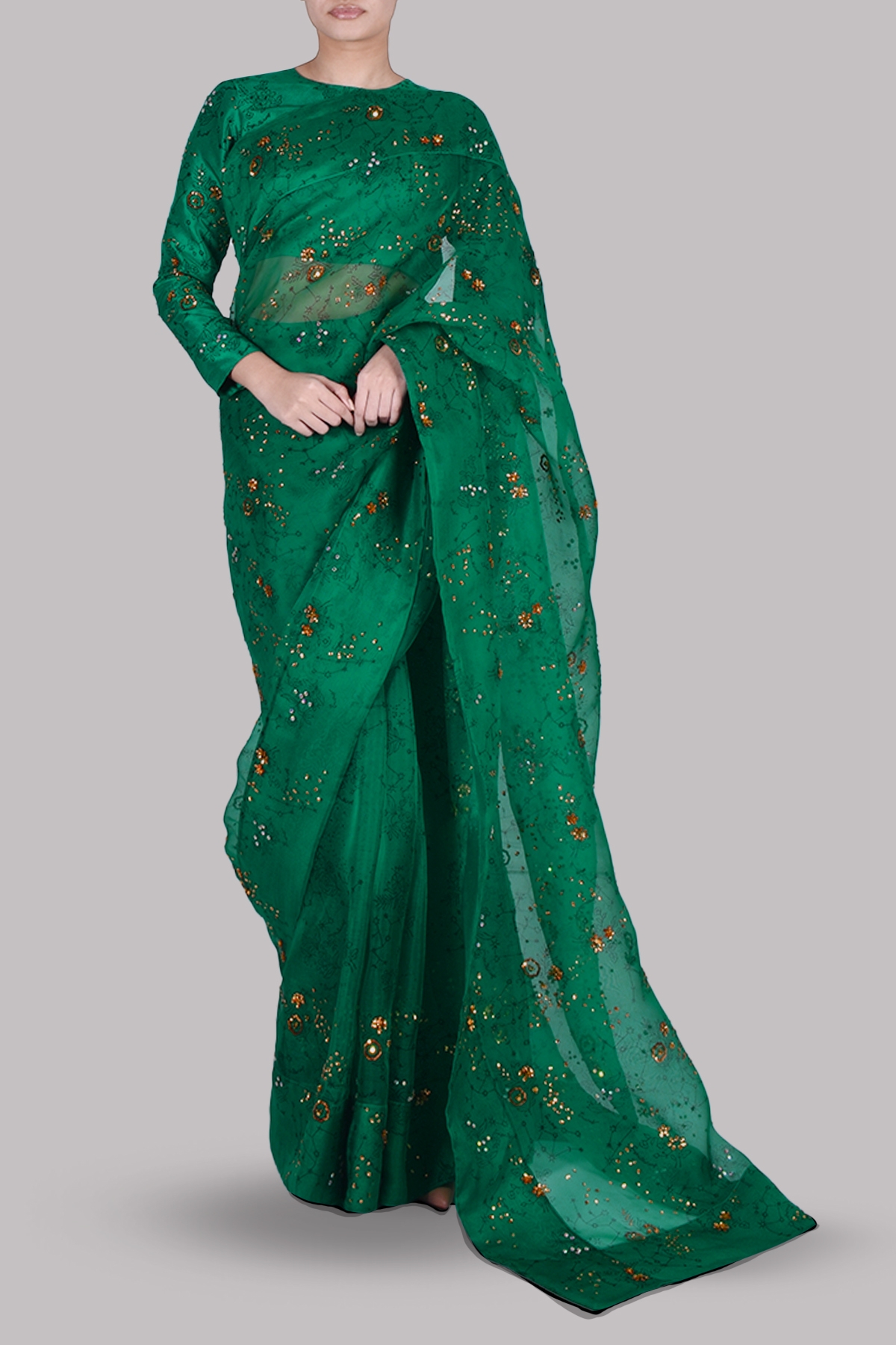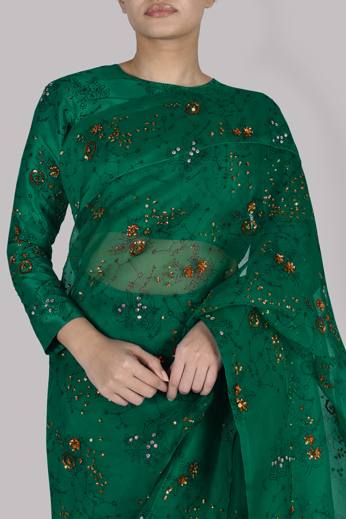 Golf green block-printed embellished organza sari adorned with gold sequins and sparkling crystals. Impeccably tailored with matching block printed and embellished blouse with straight sleeves.