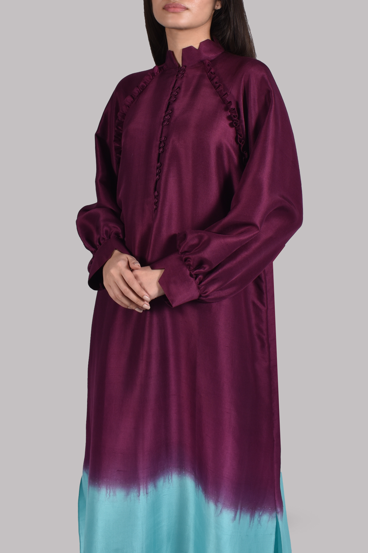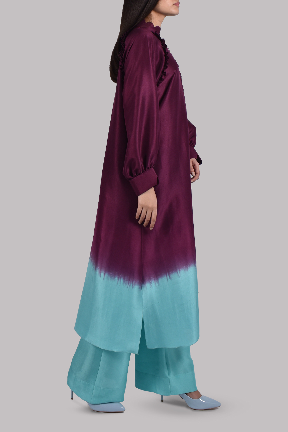 Grape Wine and blue radiance ombre dupion raglan sleeved silk tunic set with frill and notch collar detailing. Matching full length bootcut trousers.