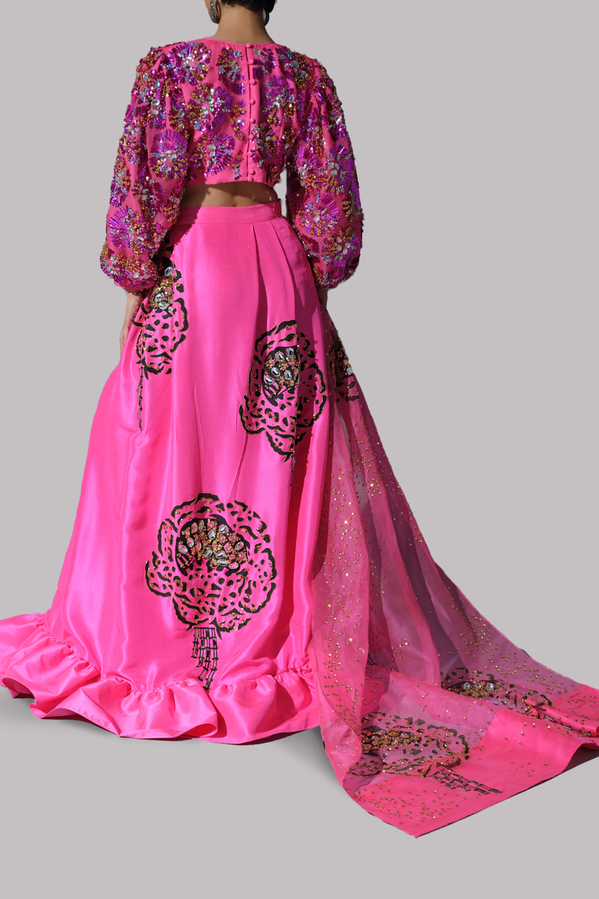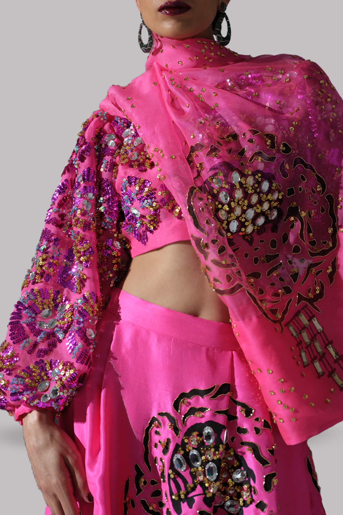 A vibrant Fandango Pink organza blouse with statement bell sleeves and delicate embellishments, paired with a lightly embellished raw silk skirt and a matching embellished organza dupatta.