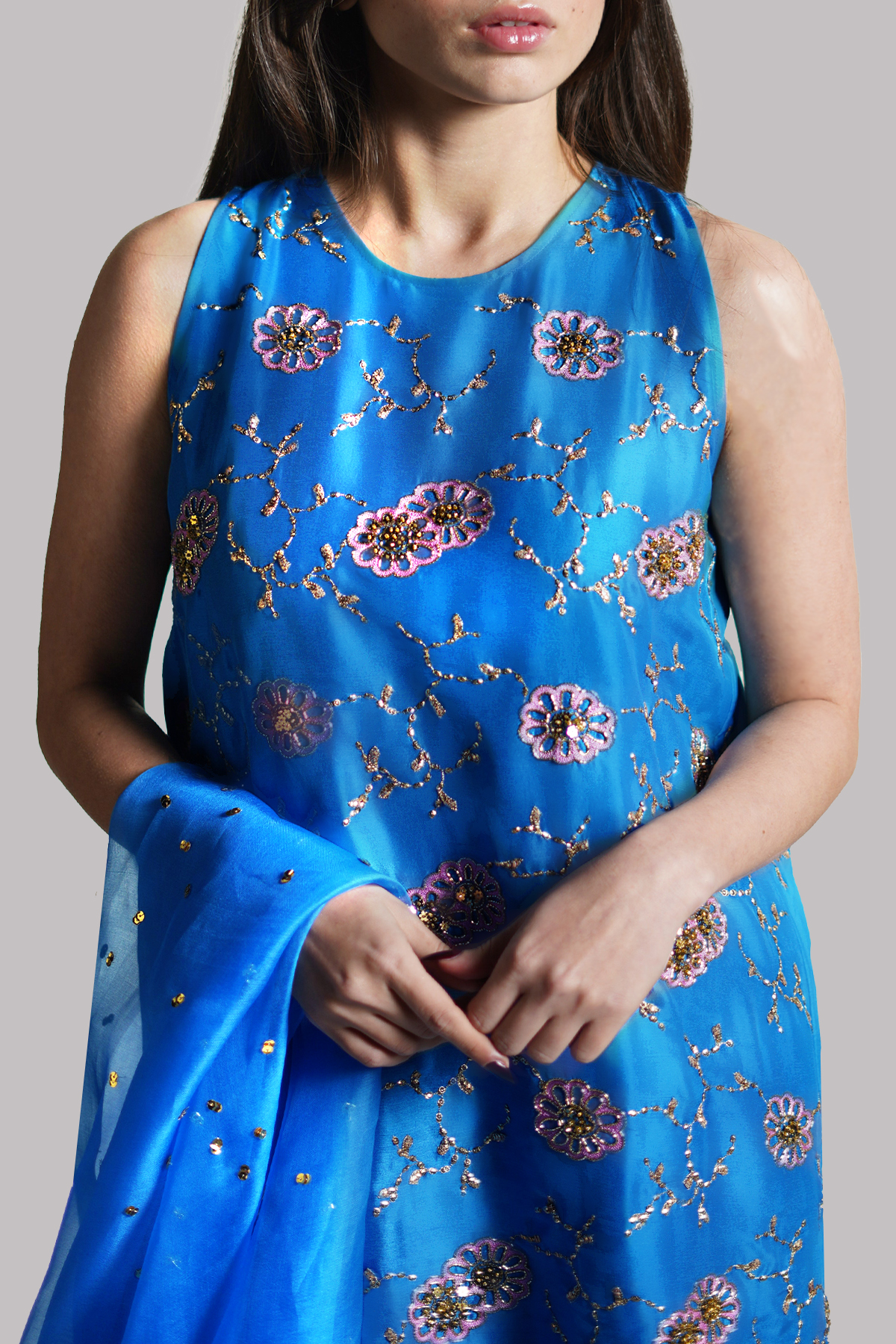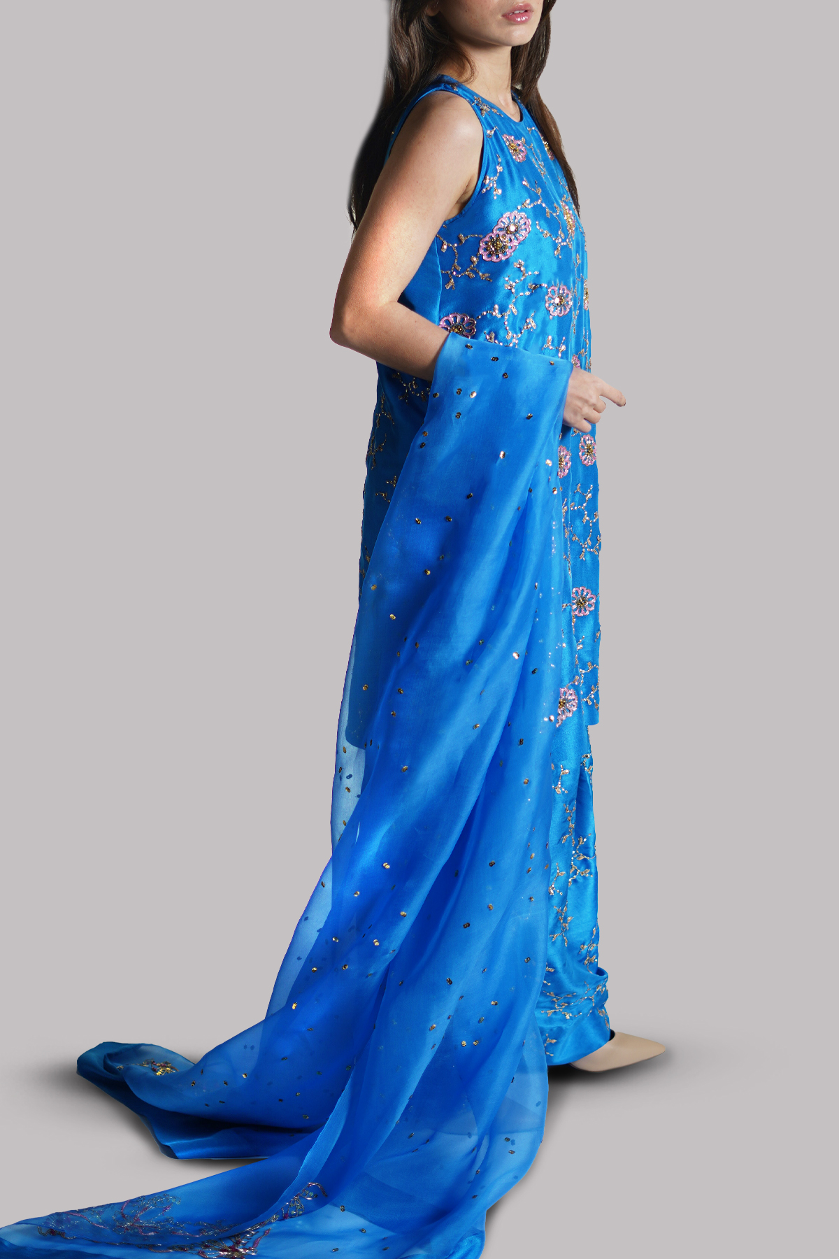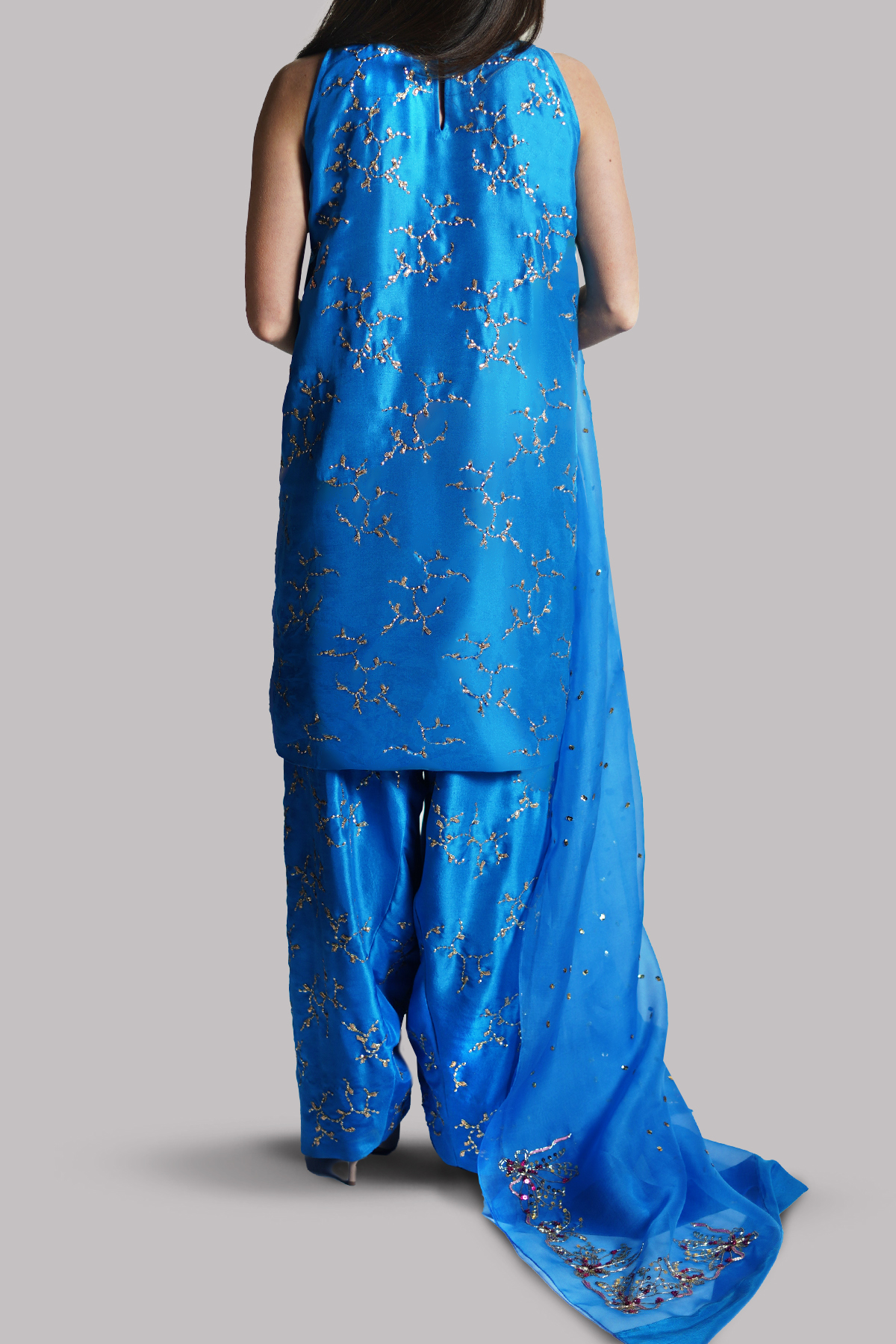 An Indigo Bunting raw silk sleeveless tunic, exquisitely embellished to highlight its rich texture and clean silhouette. Paired with a matching embellished shalwar for a refined statement, the ensemble is completed with an embellished organza dupatta.