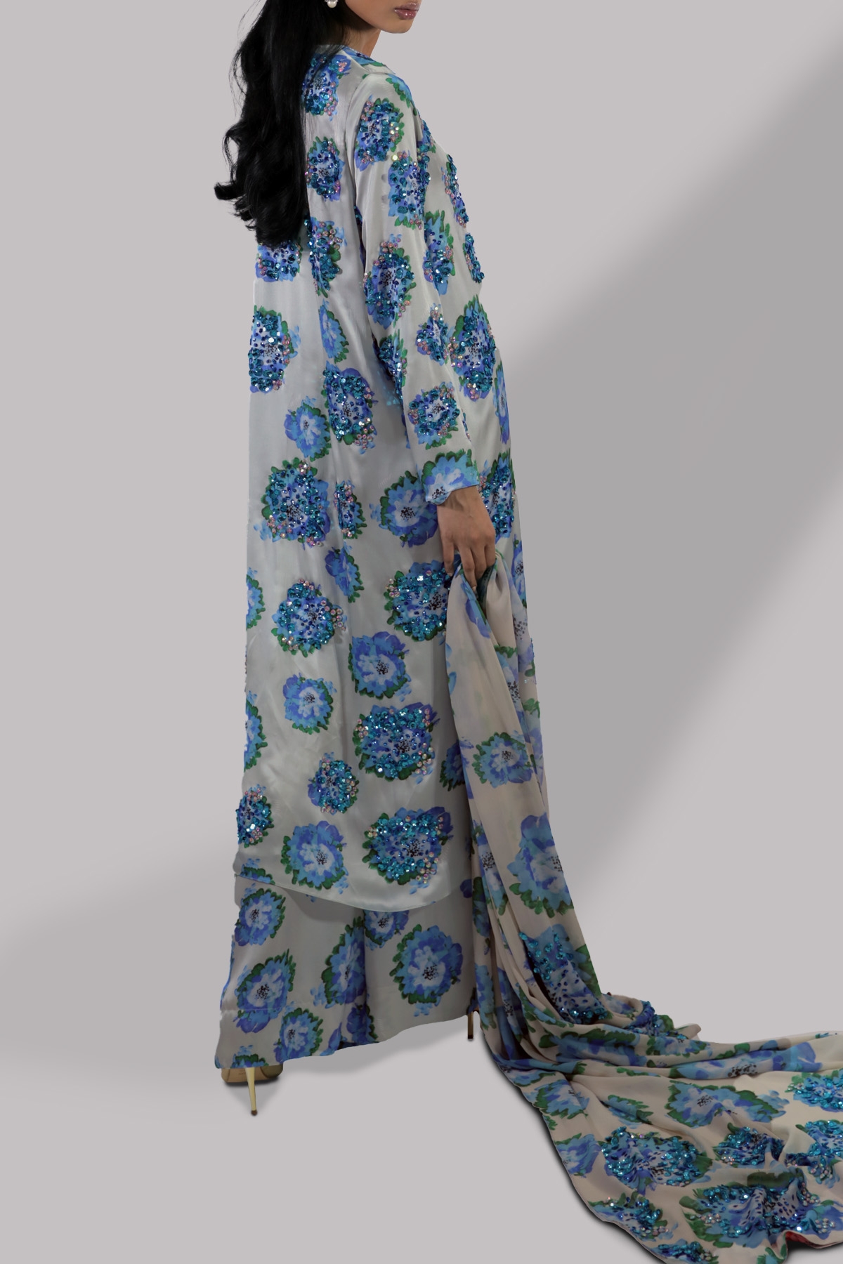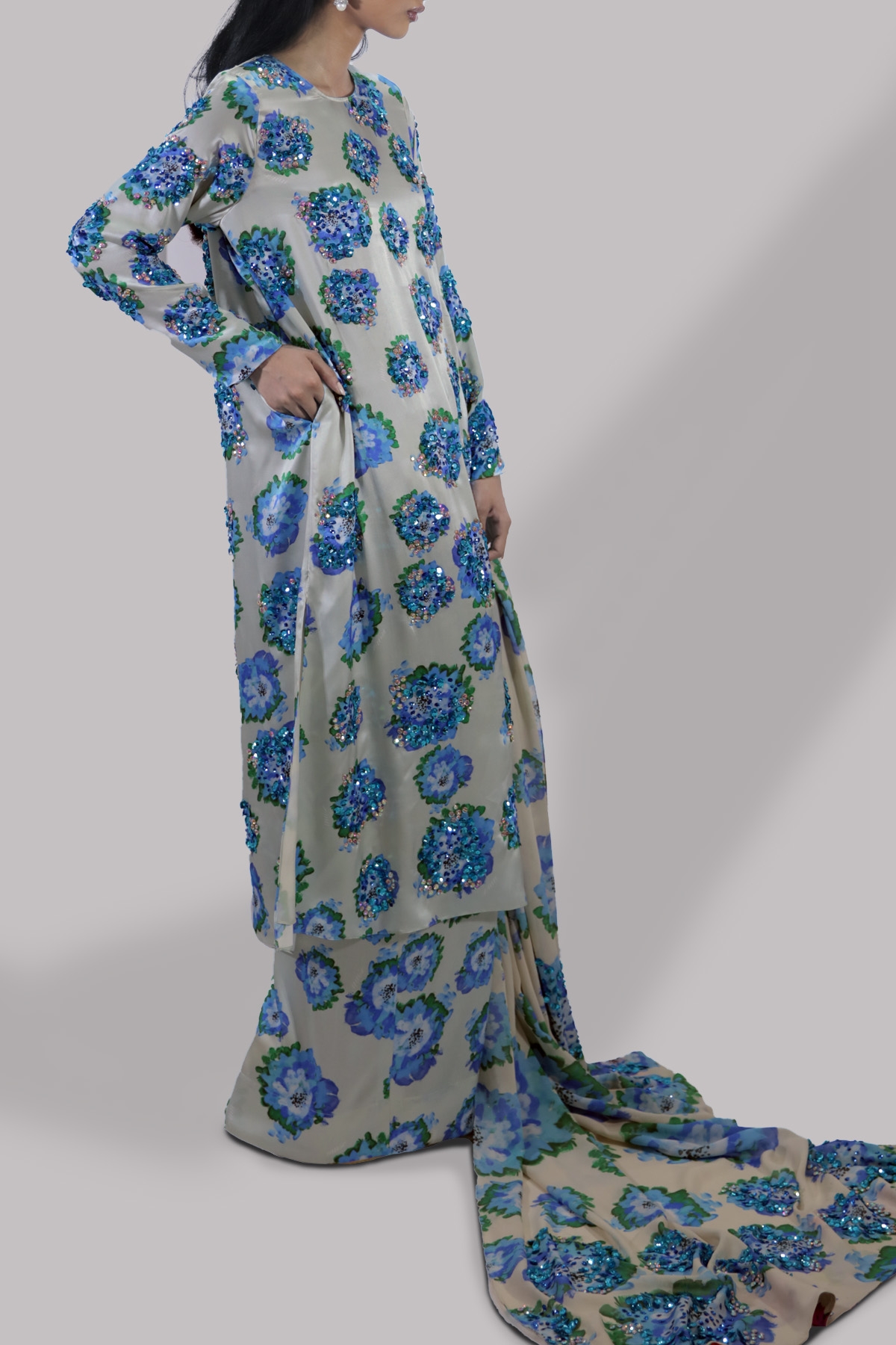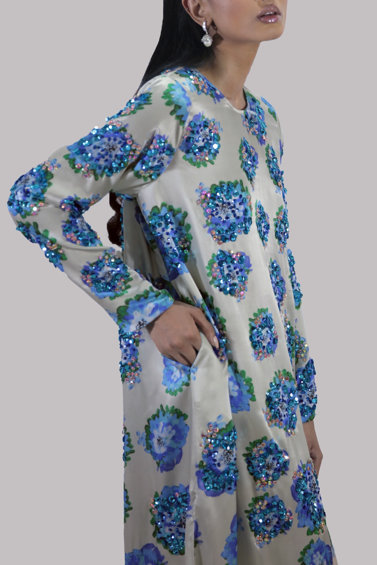 Jadeite & Blue Digital Print, oversized close neck satin silk top, hand embellished with multi-colored French and Italian sequins. Matching satin silk wide legged pants and embellished georgette dupatta.
