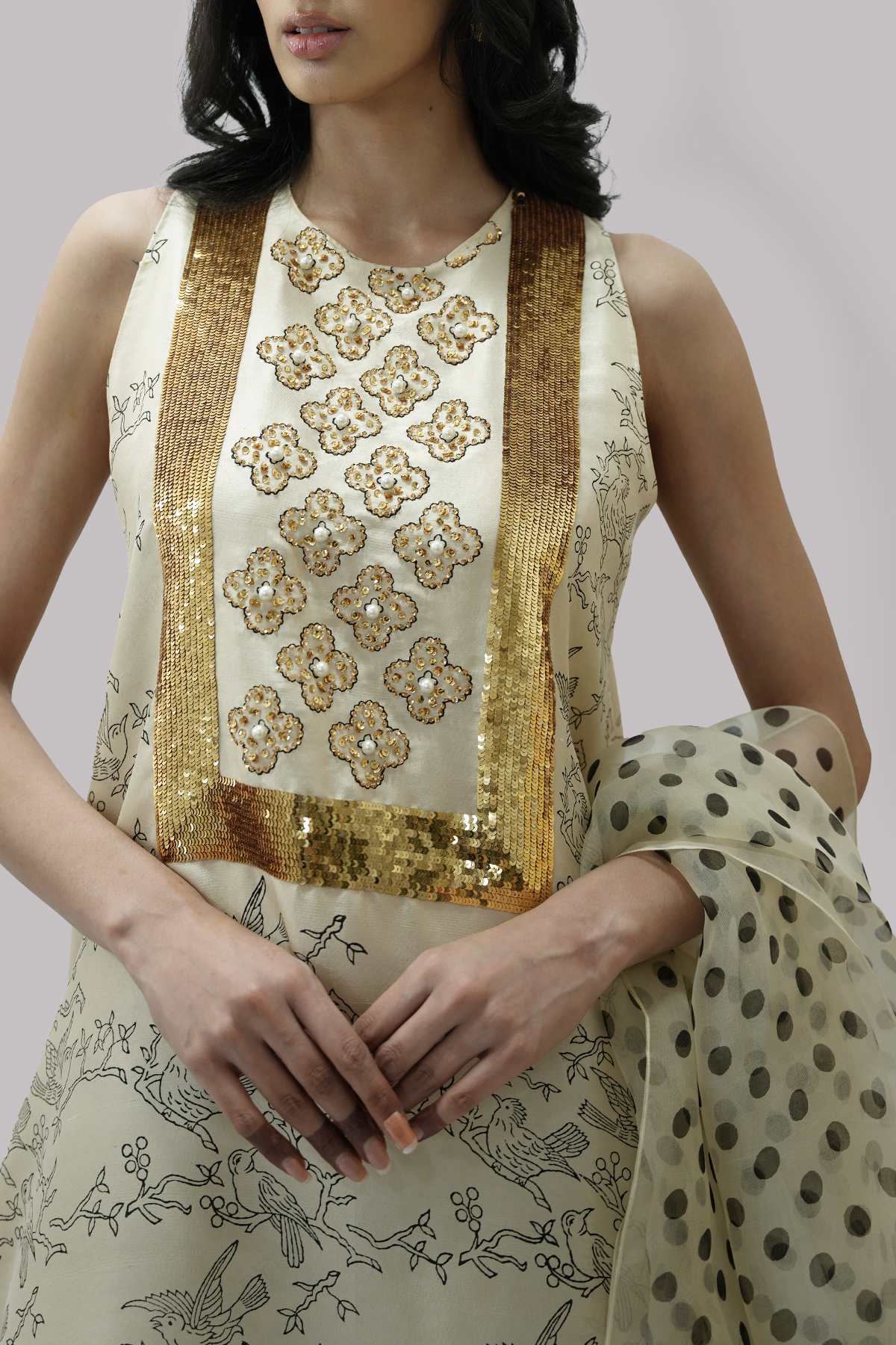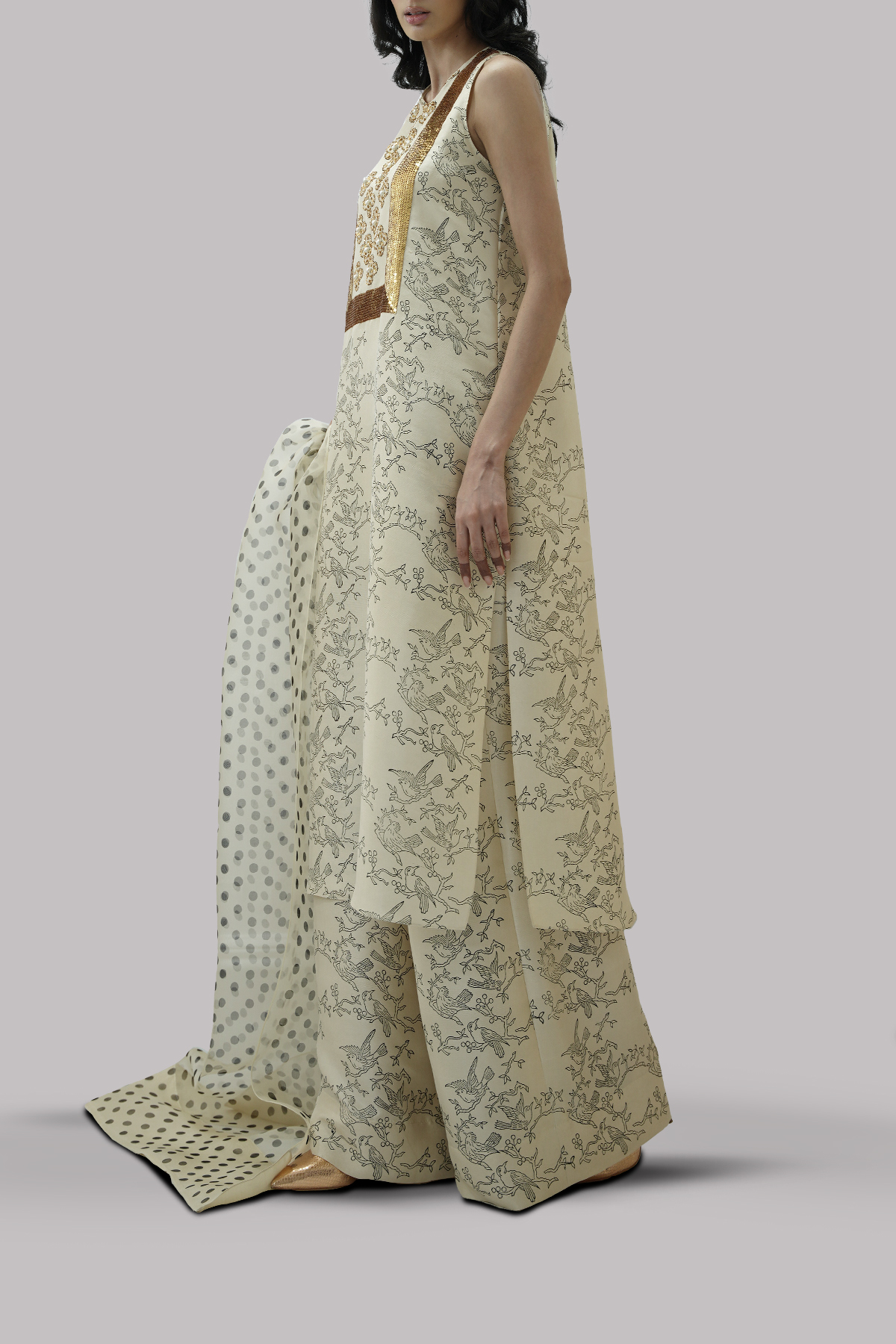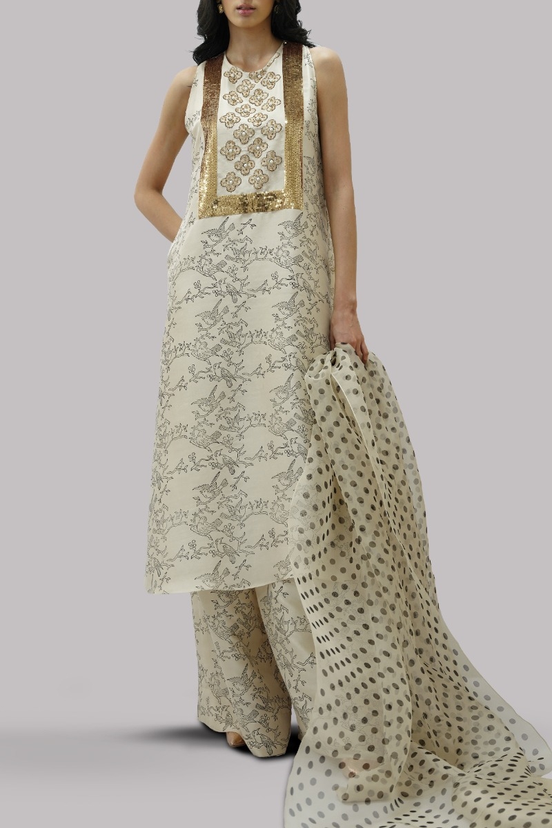 Lamb’s Wool close neck raw silk shirt decorated with white pearls gold sparkling sequins with perfect cut and extravagant details, It’s impeccably tailored with matching block printed raw silk palazzo pants, paired with embellished block printed organza dupatta.
