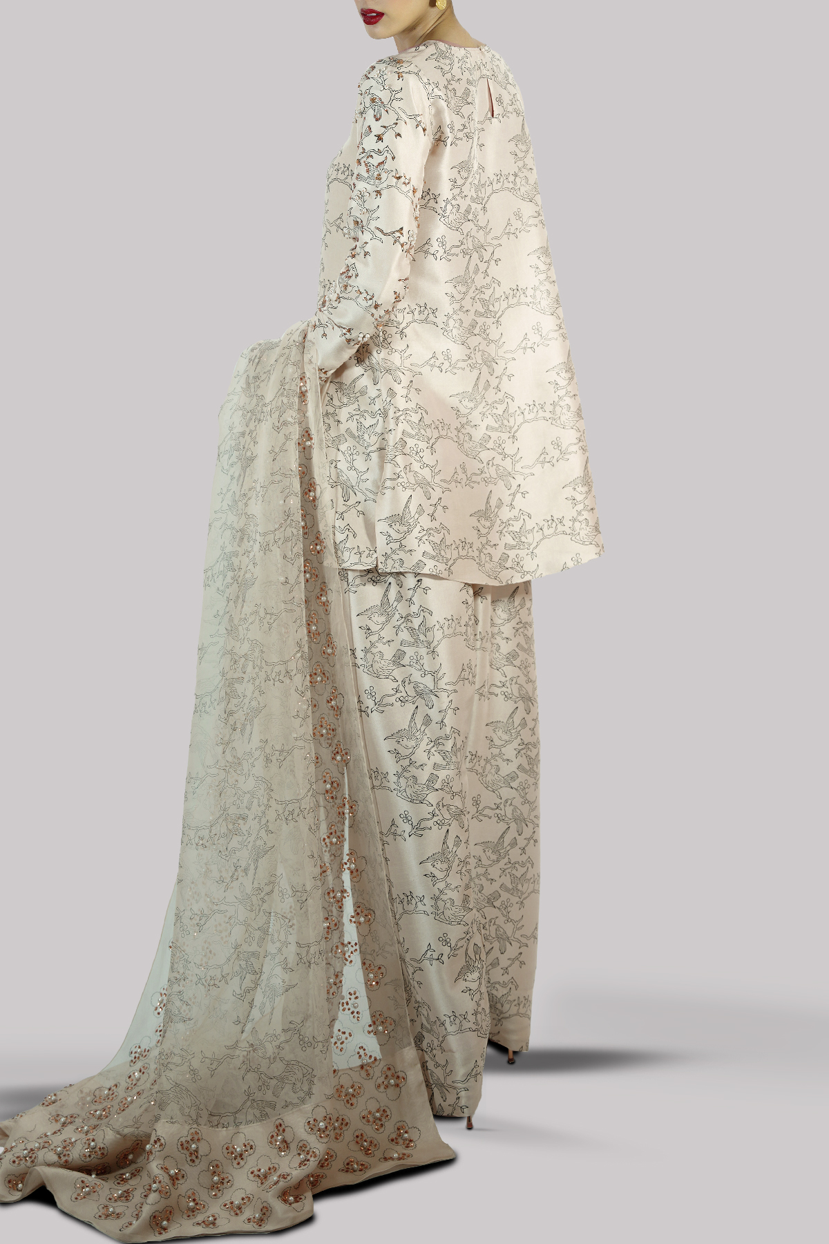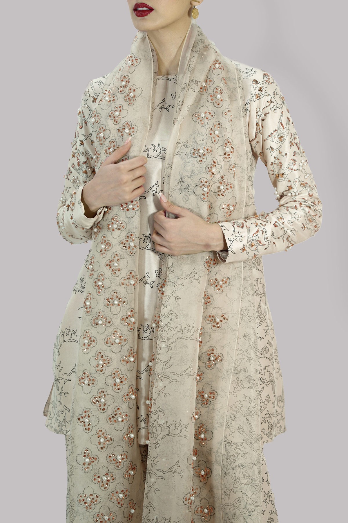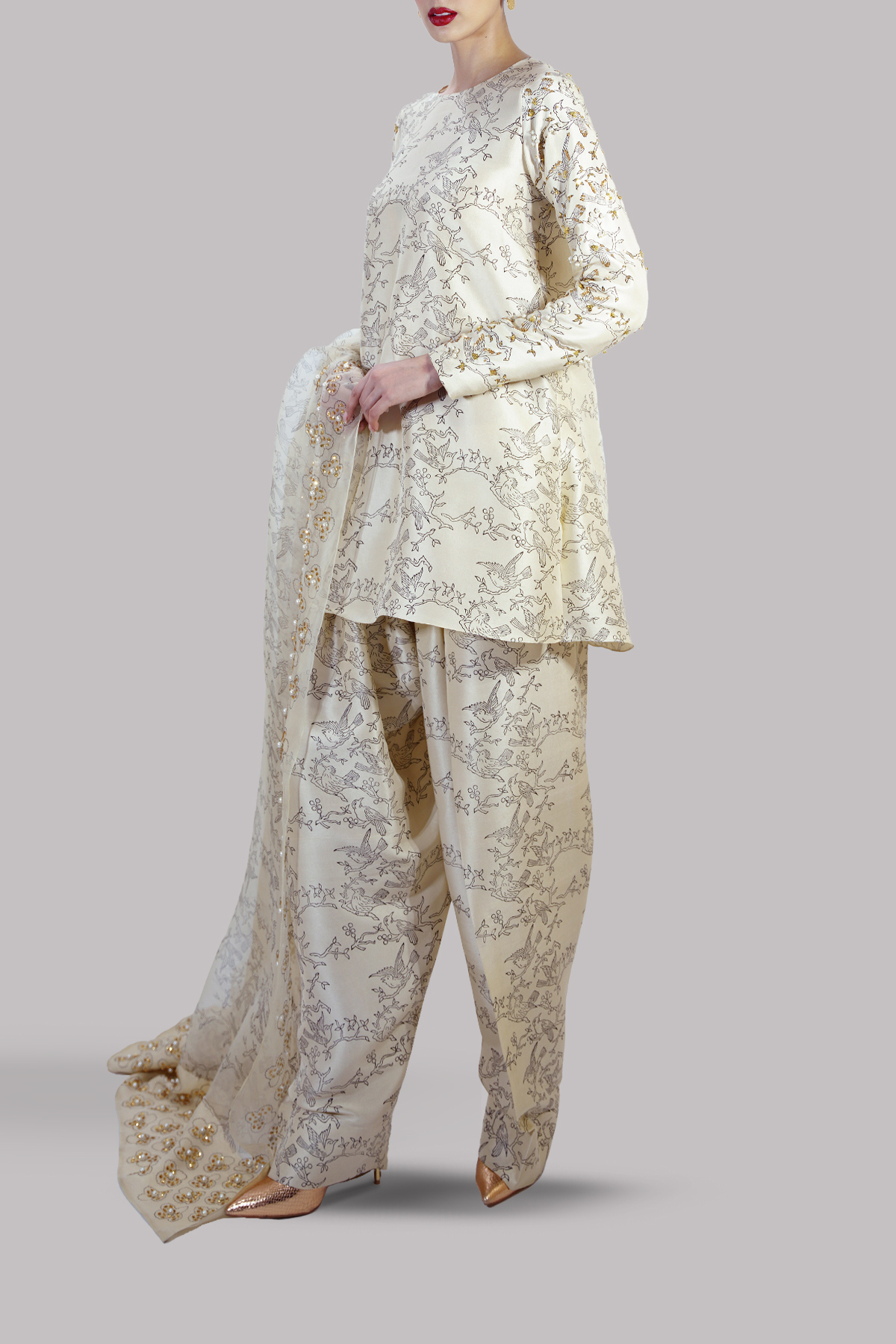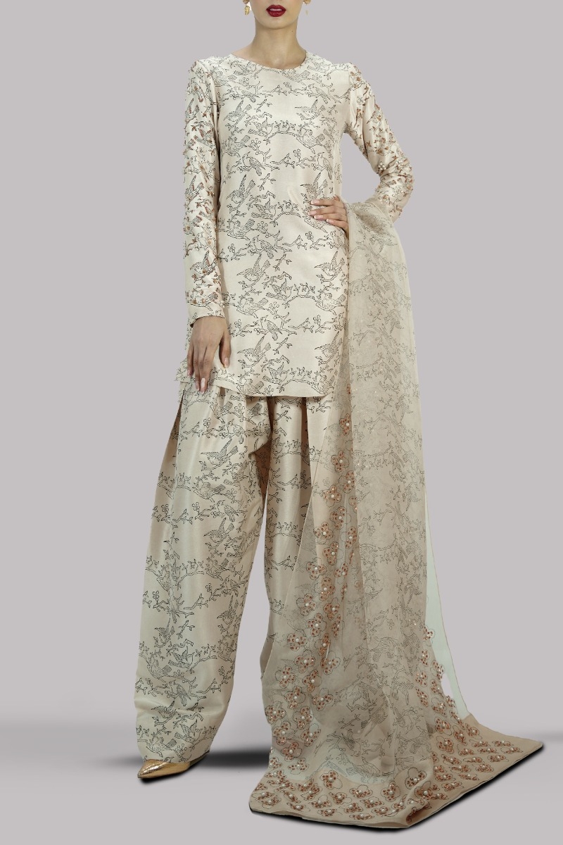 Lamb’s Wool close neck raw silk shirt decorated with white pearls gold sparkling sequins with perfect cut and extravagant details, It’s impeccably tailored with matching block printed raw silk shalwar pants, paired with embellished block printed organza dupatta.
