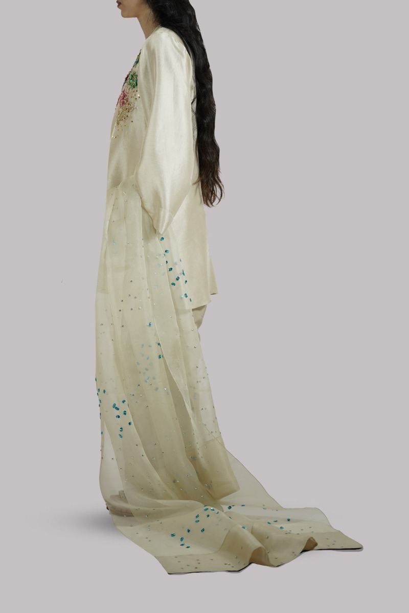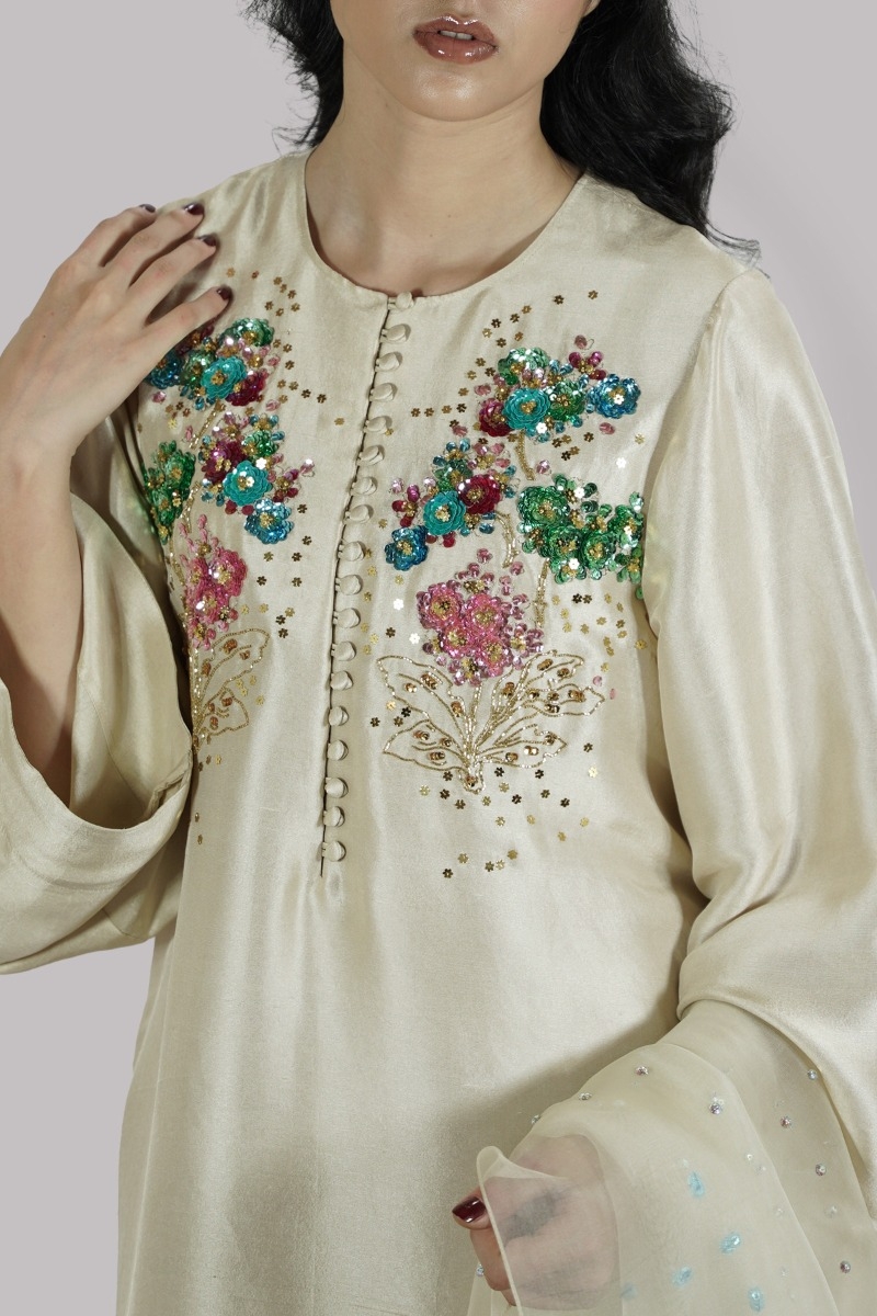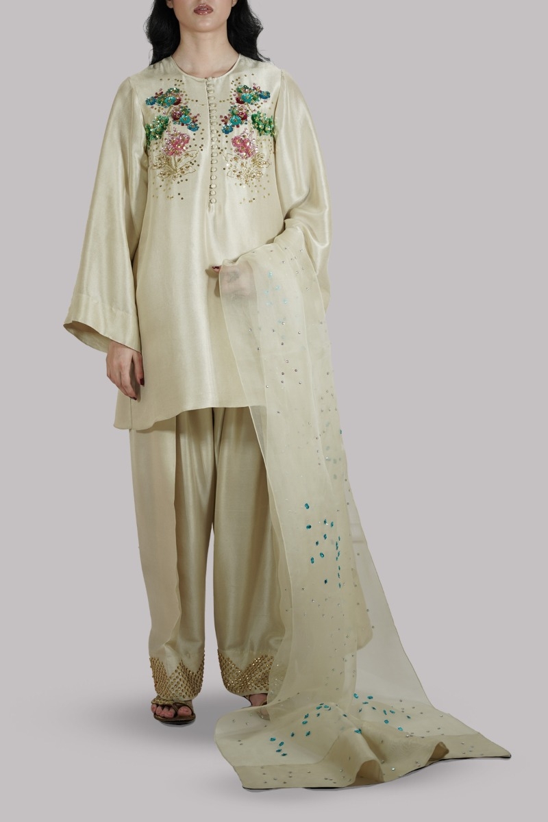 Lamb’s wool embellished raw silk tunic having front button details paired with impeccably tailored shalwar pants and detailed embellished organza dupatta.