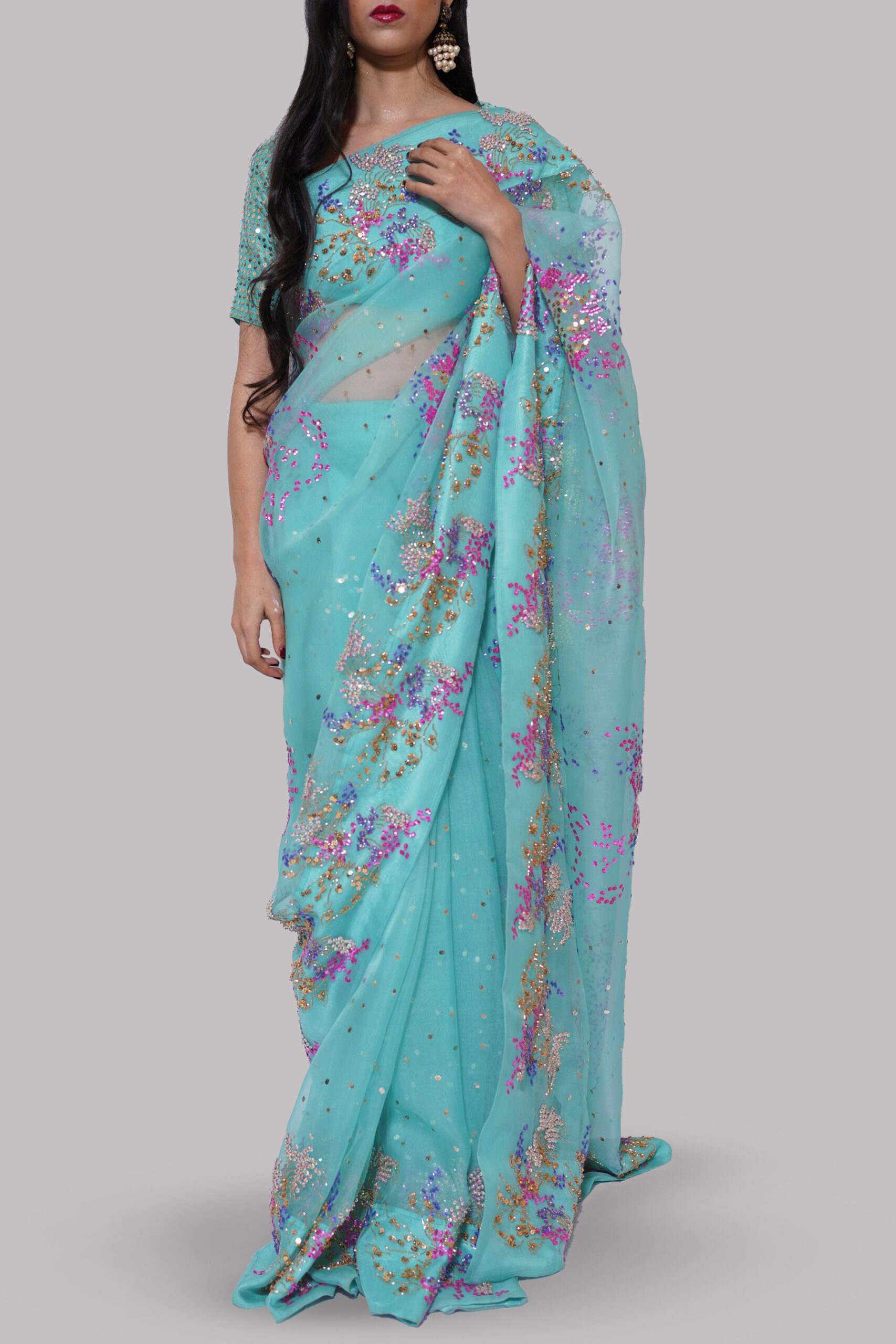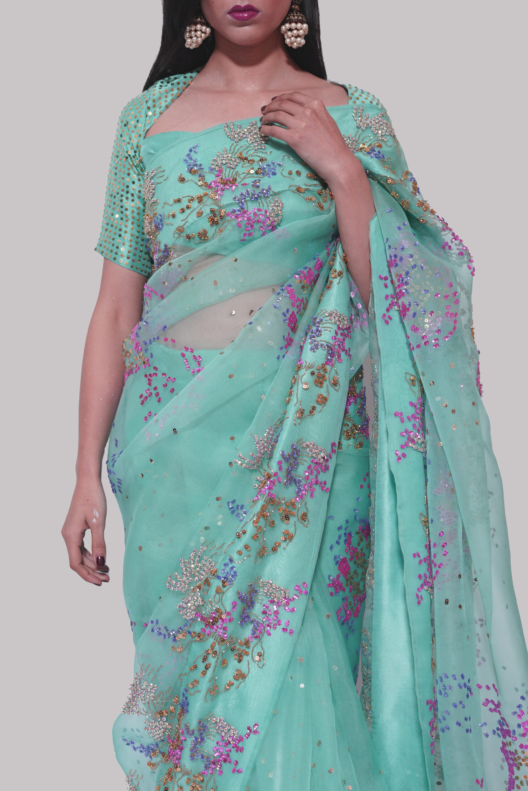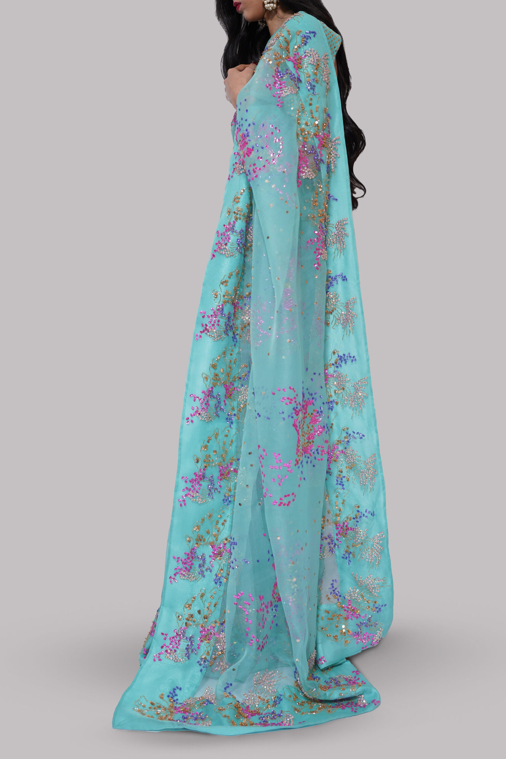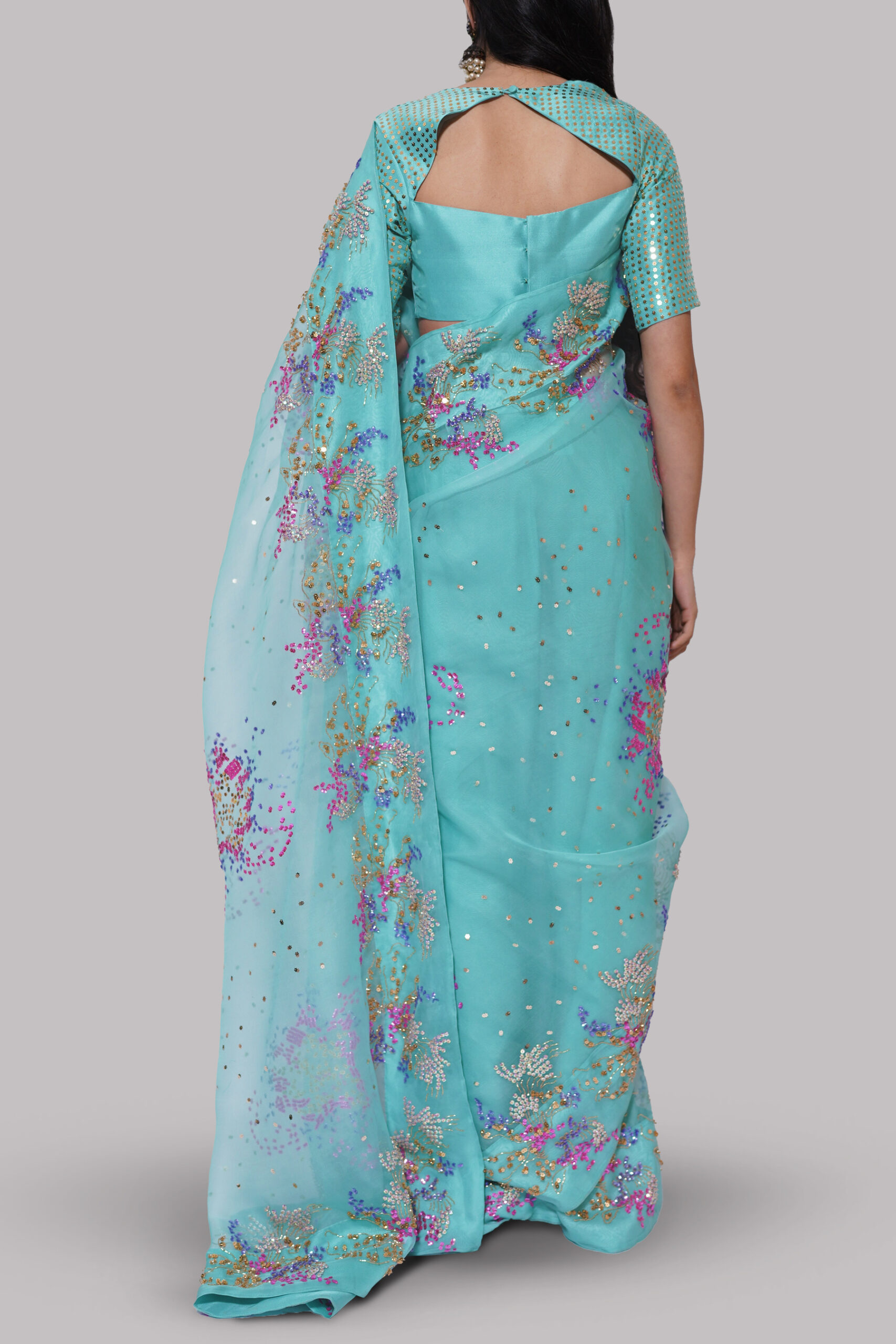 Elegant and serene, the Leisure Time Cyan Embellished Organza Sari is crafted from soft, sheer organza and embellished with subtle beadwork. It comes with a mid-length sleeve raw silk blouse featuring matching embellishments.