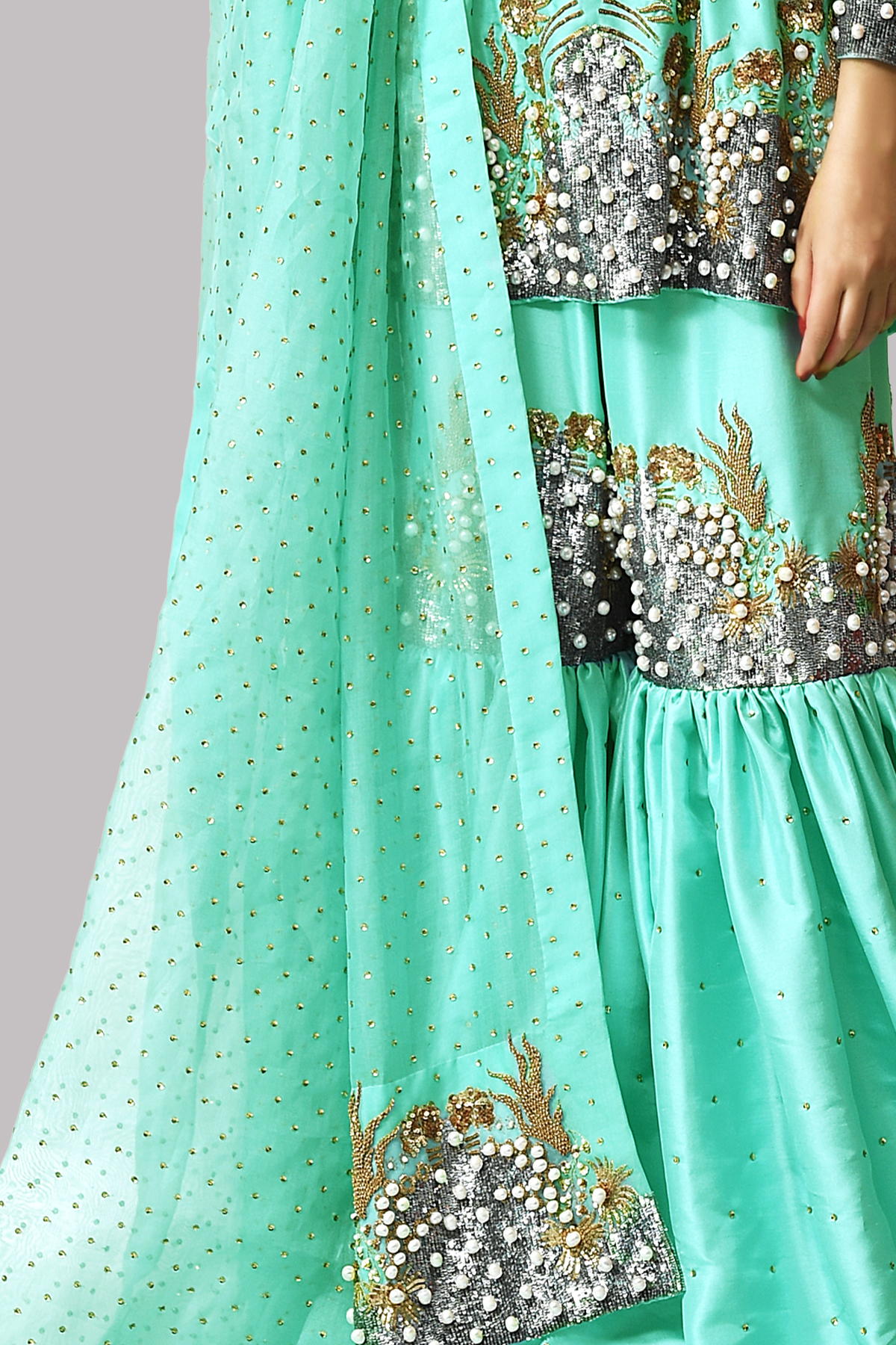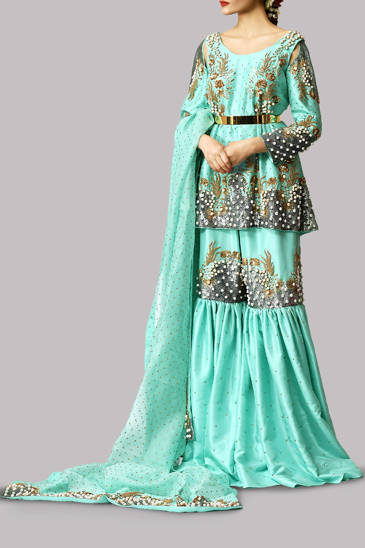 Radiating opulence, this Leisure Time tunic is exquisitely hand-embellished with gold and silver sequins and delicate pearls, creating a luminous interplay of light and texture. Paired with a matching gharara, richly adorned to echo the tunic’s detailing, the ensemble exudes grandeur and sophistication.
