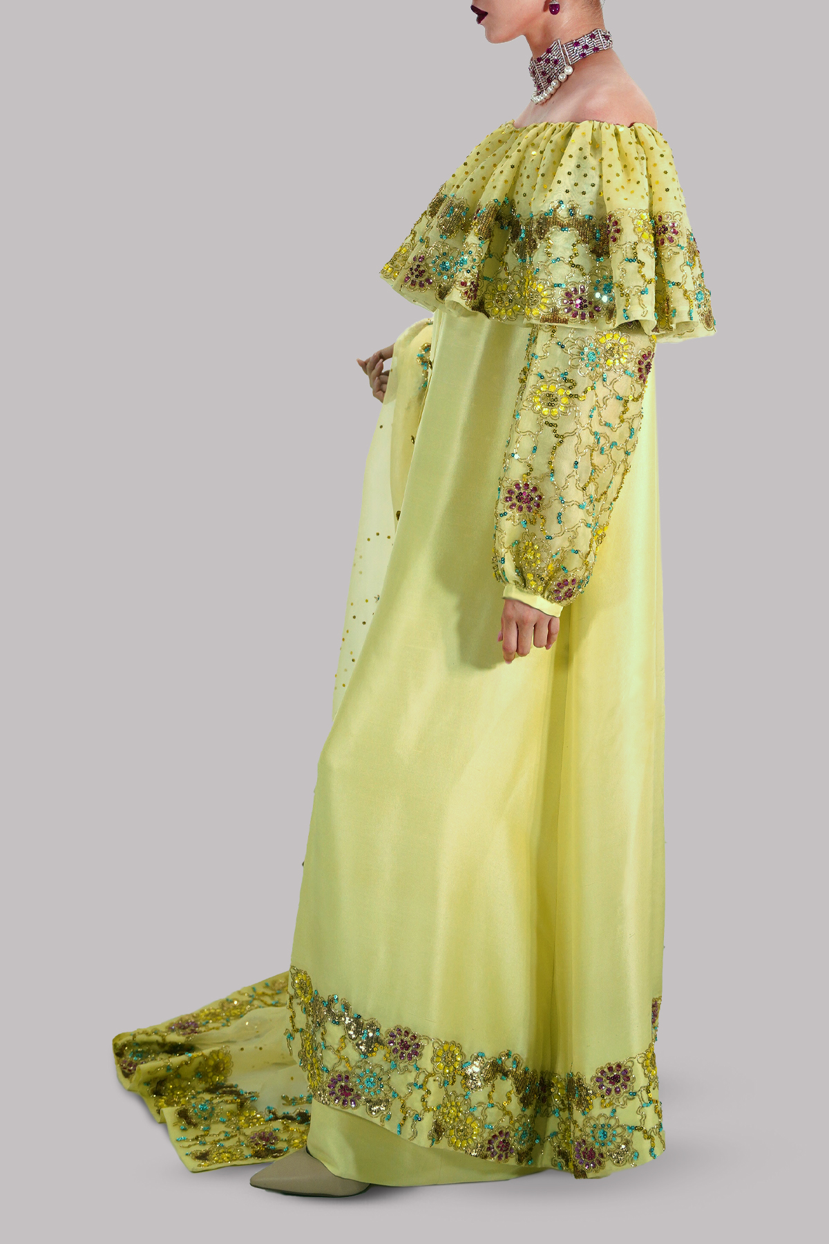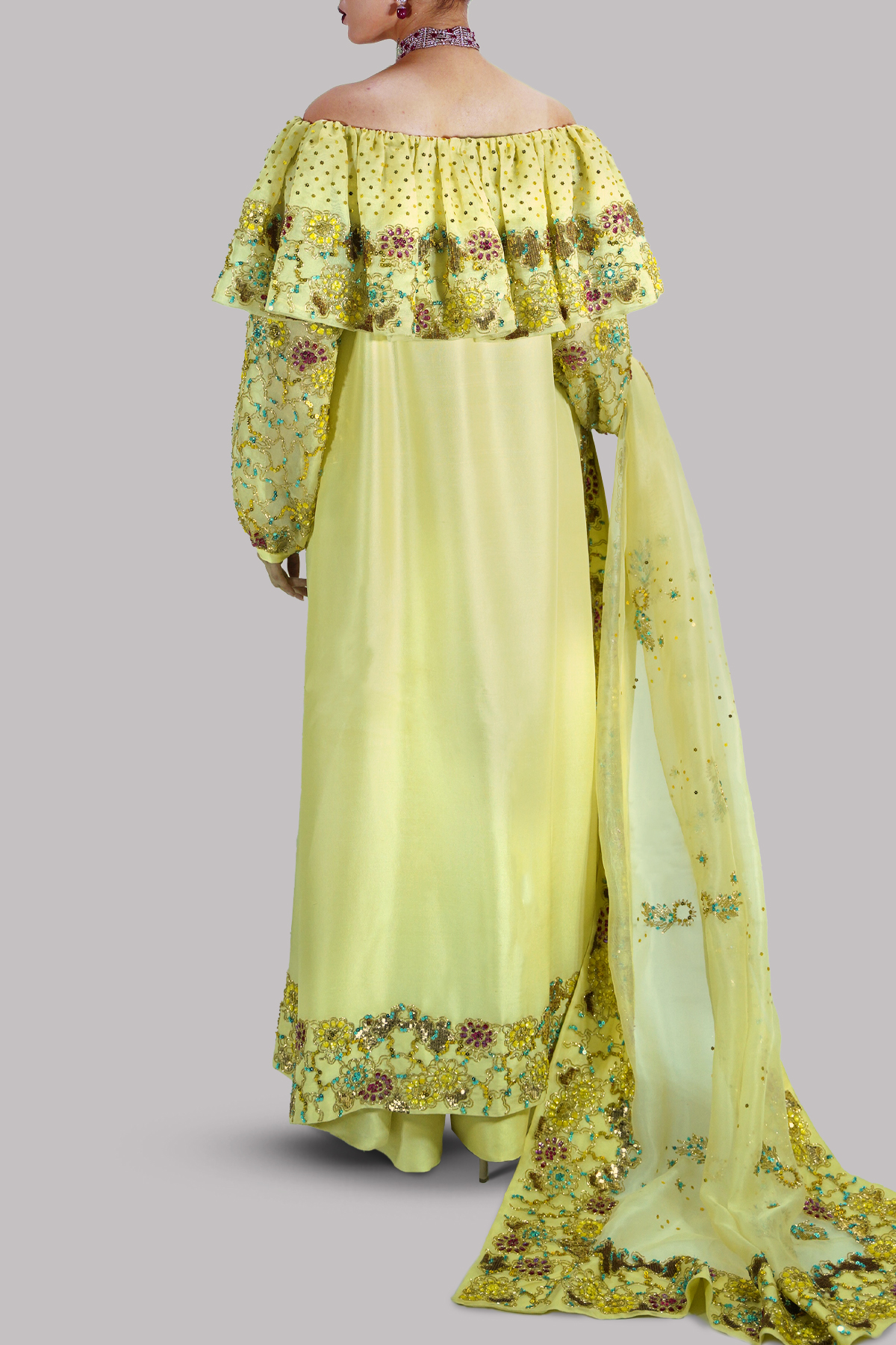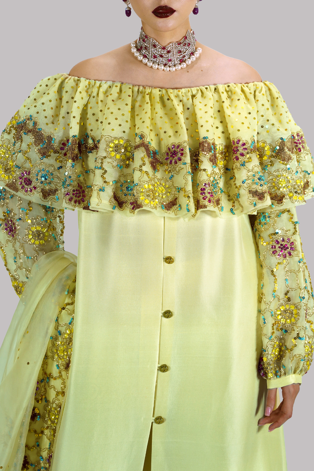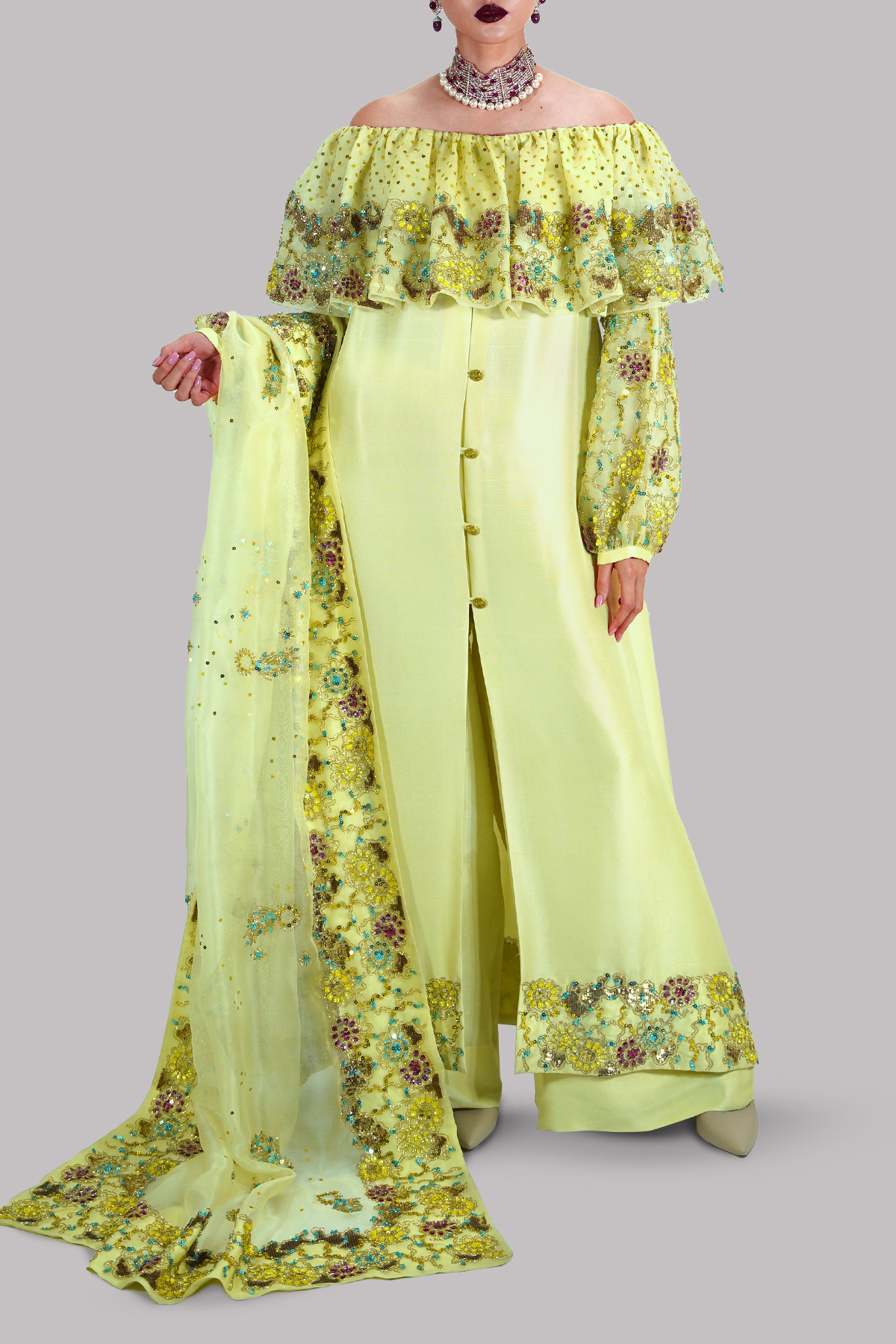 A Lemon Verbena off-shoulder raw silk long shirt featuring a softly frilled neckline with delicate embellishment and front open button detail, paired with a wide legged trouser and finished with an embellished organza dupatta.