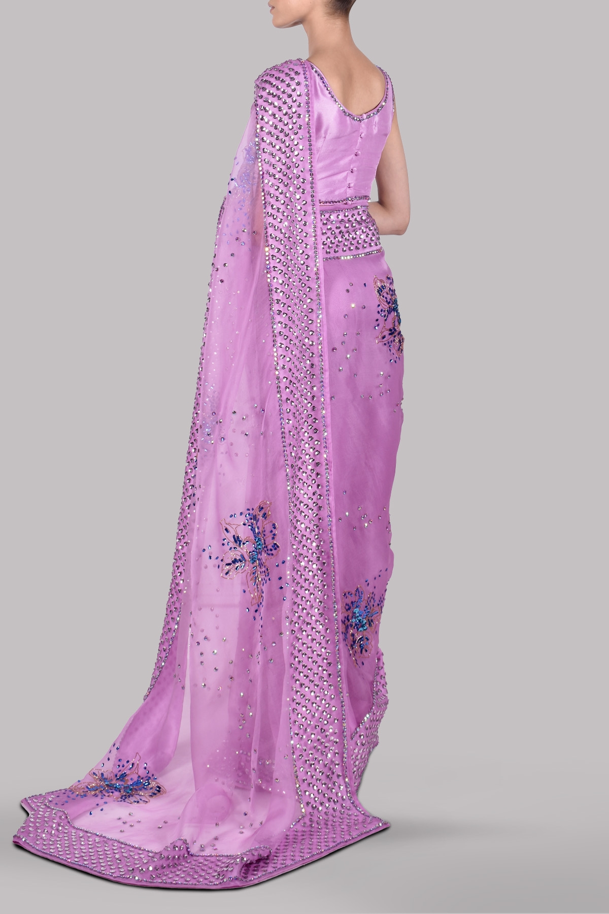 Lilac Chiffon organza sari with matching embellished cropped blouse. Hand embellished with freshwater pearls, Intricate glistening sequin work, dazzling crystals and gold beads. This sensational sari is no exception. The sari has stitched pleats for ease of wearing. Matching stitched underskirt included.