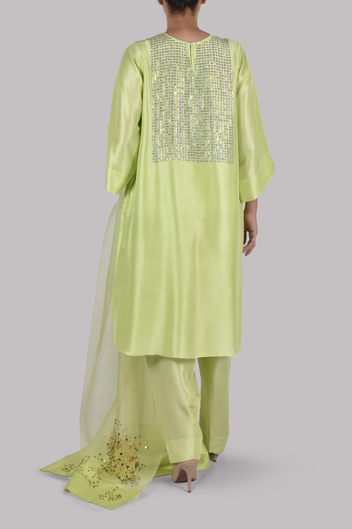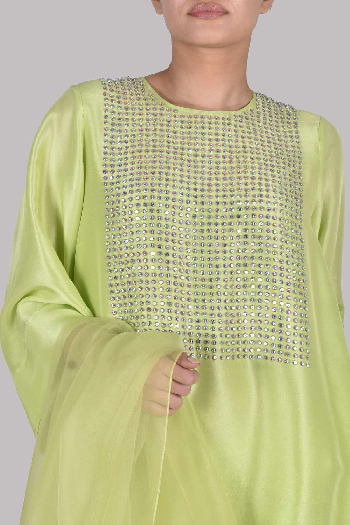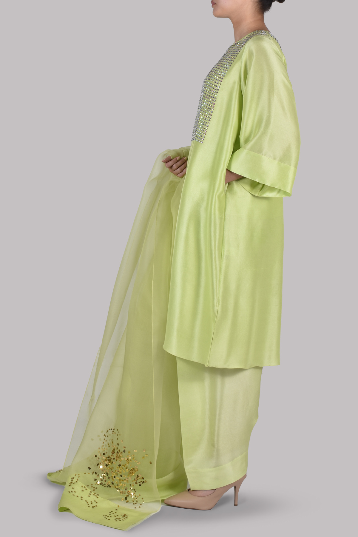 Lime Punch embellished raw silk tunic with a close neck delicately adorned with sparkling crystals along the neckline on front and back, paired with a matching shalwar and embellished organza dupatta.