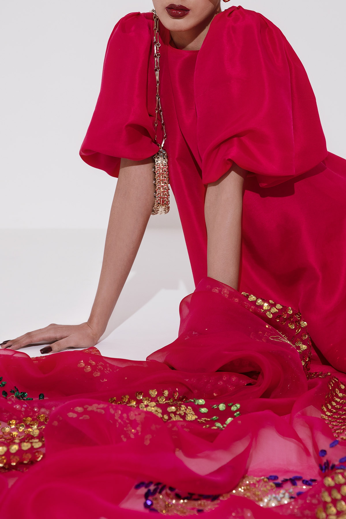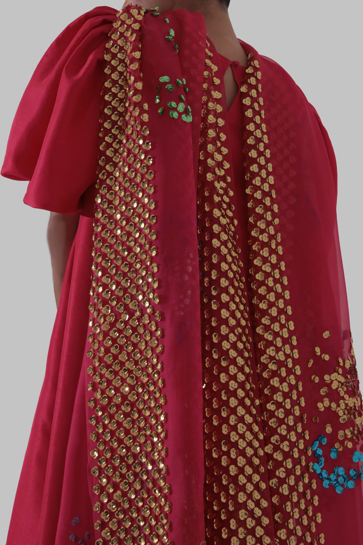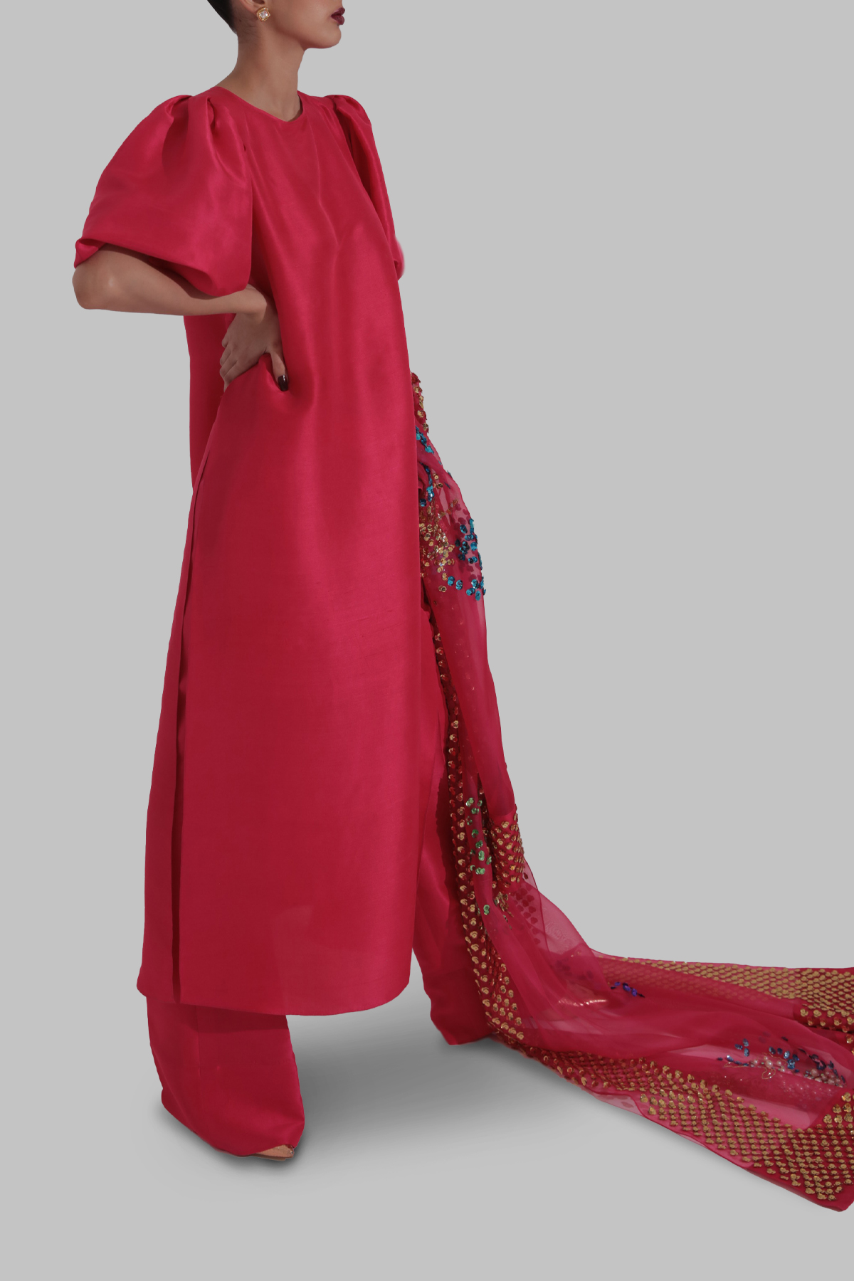 Azalea red oversized raw silk top with voluminous box-pleated sleeves. Matching raw silk wide legged pants and organza dupatta hand embellished with gold and multi-coloured sequins.