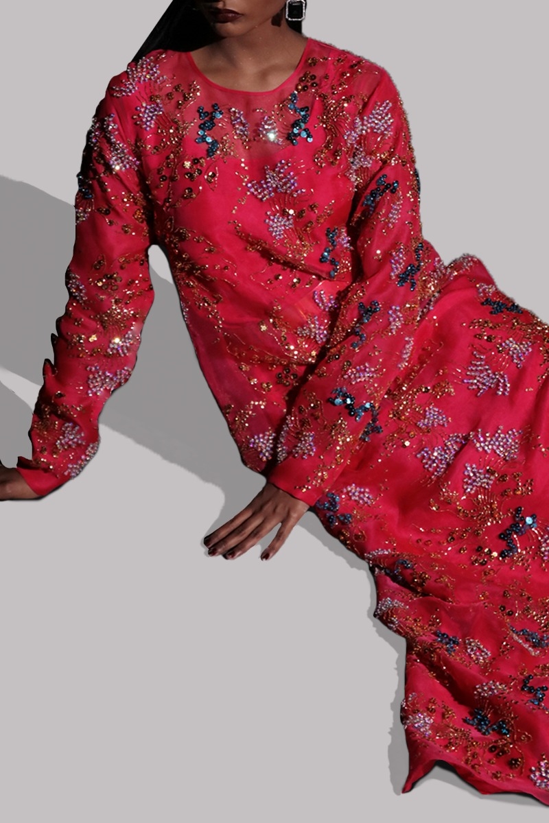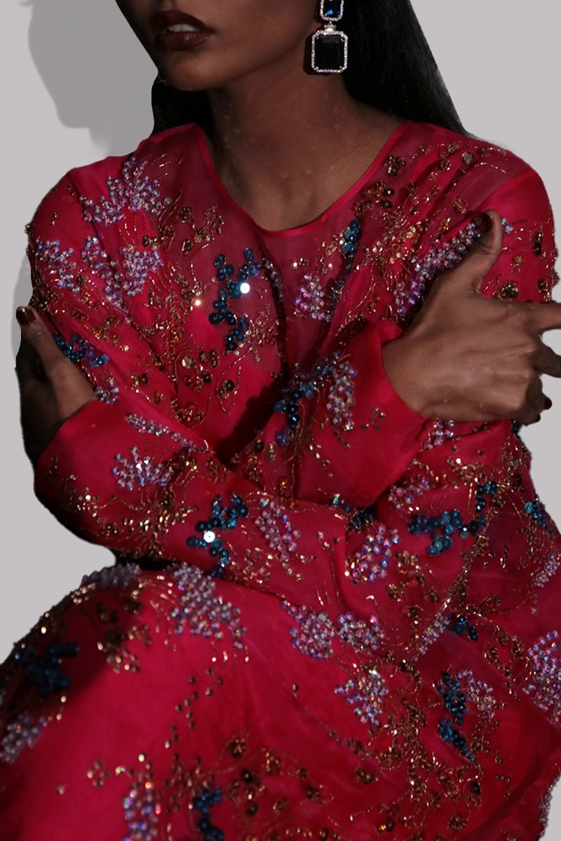 Lollipop Red, Straight raw silk maxi dress, hand embellished with multi-coloured French and Italian sequins.