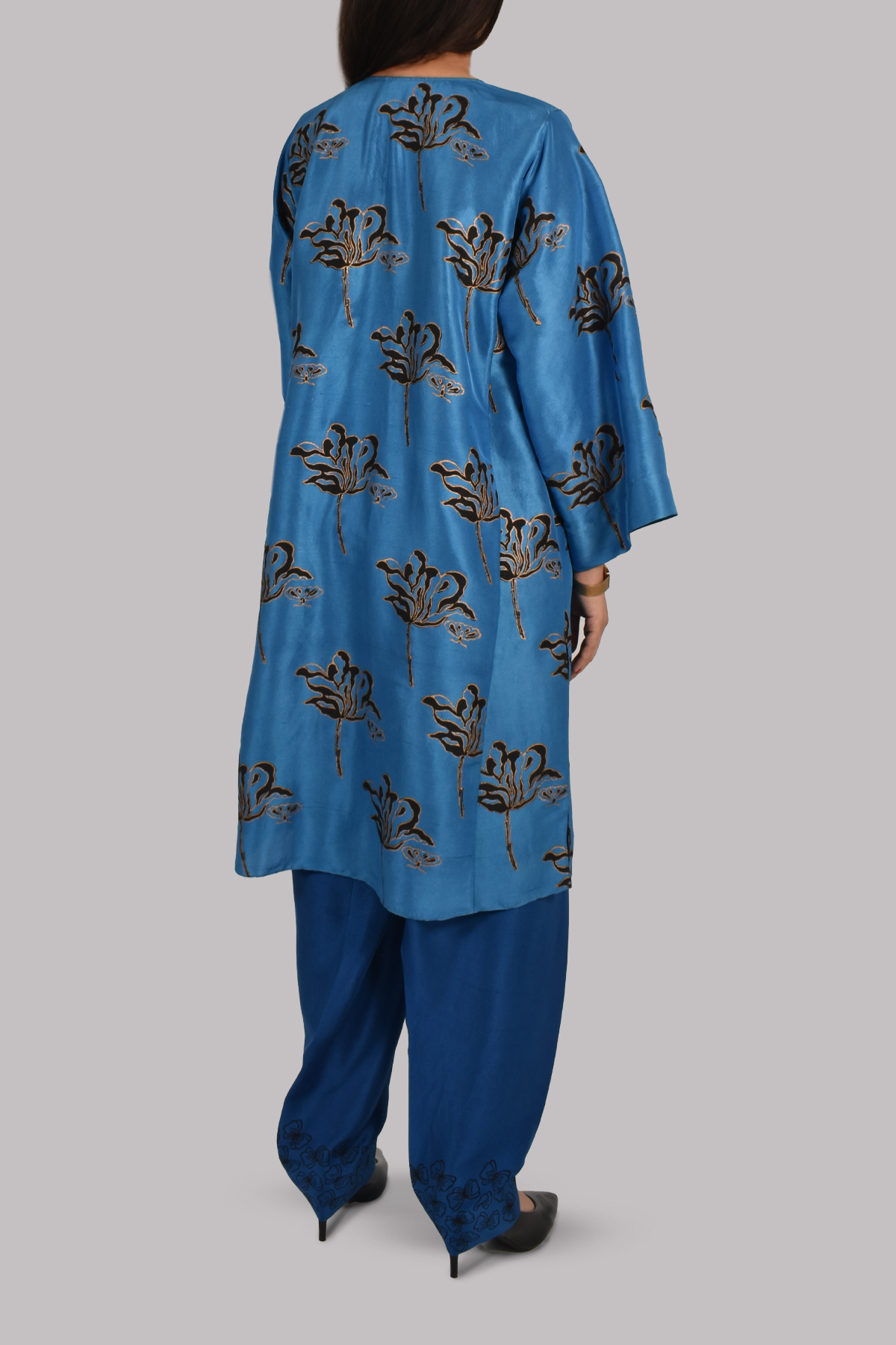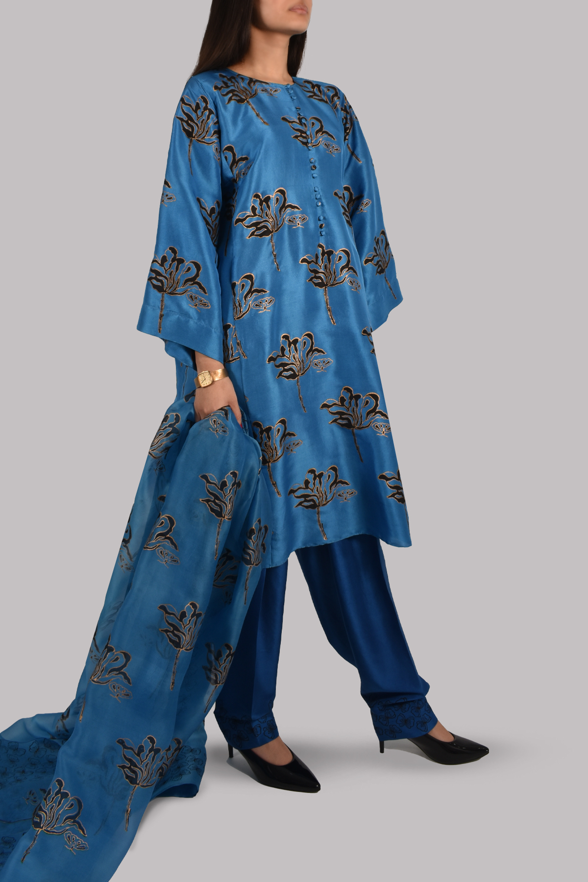 Mediterranean Blue oversized panelled tunic, hand-block printed with floral motifs. Matching block printed dupatta. Matching block printed shalwar trousers in a darker contrasting blue.