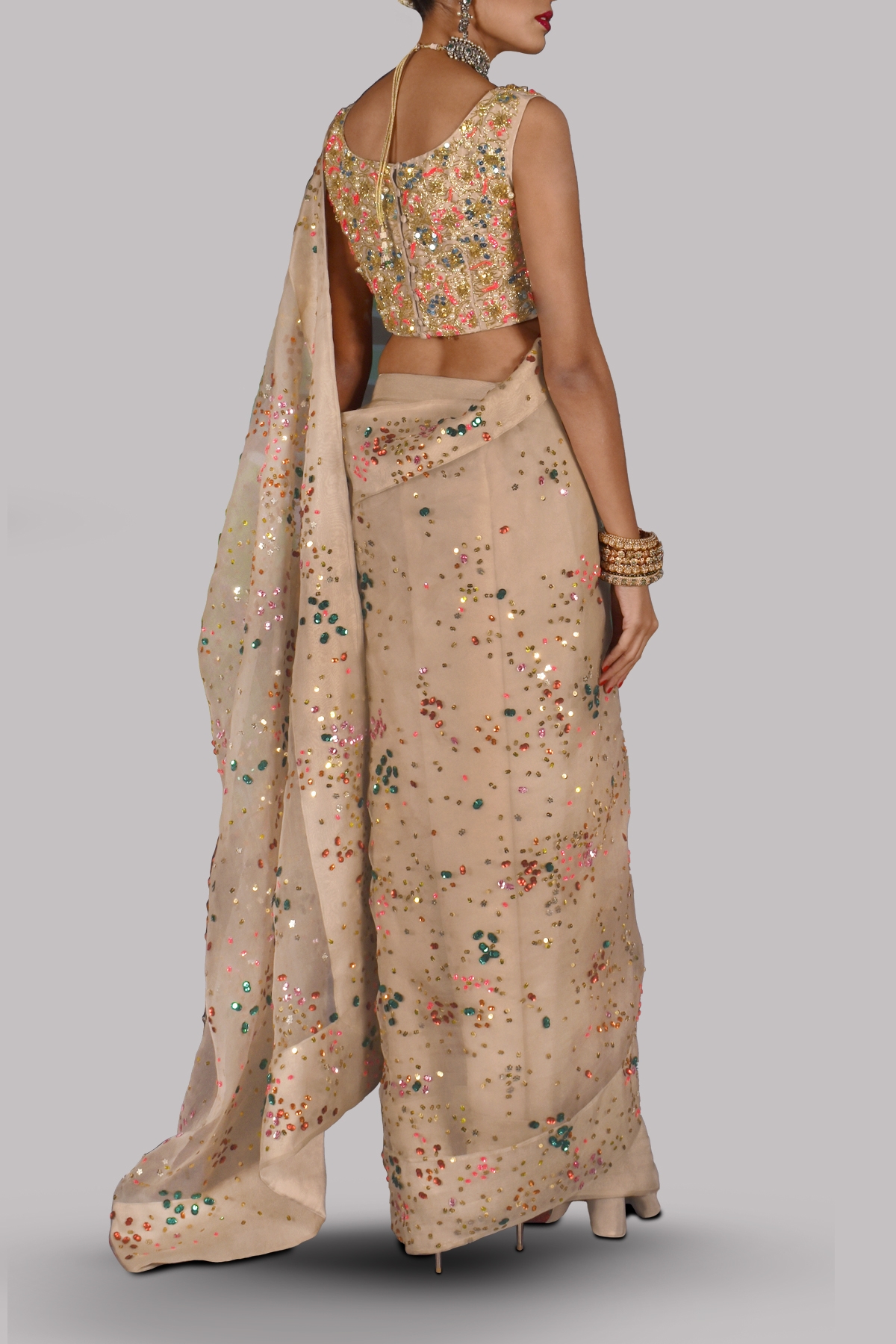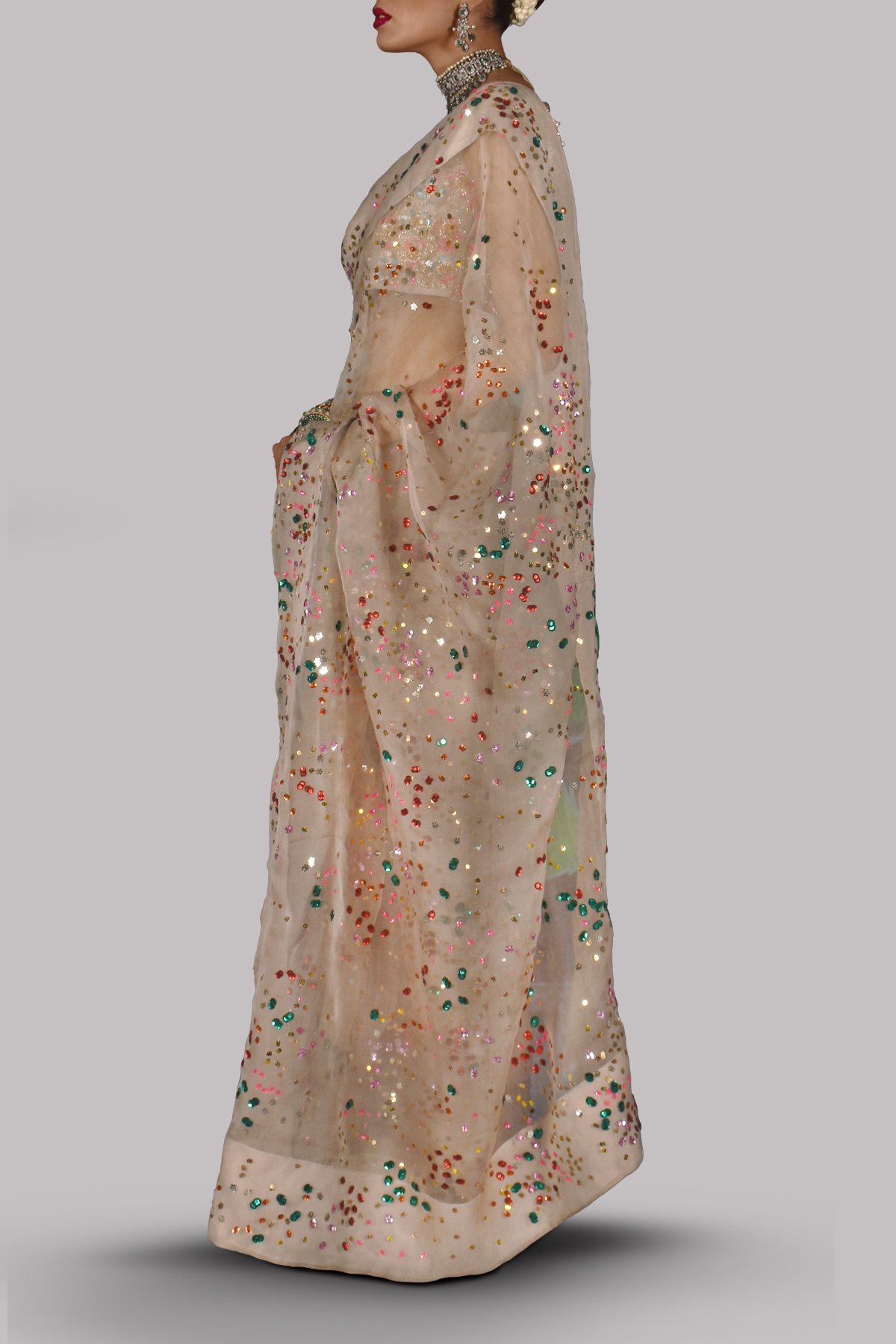 Moonlight organza sari with matching hand embellished to perfection with our intricate embellishments of crystals on cropped blouse. Hand embellished with freshwater pearls, dazzling crystals and multi coloured glistening sequins. This sensational sari is no exception. This is a stylish and perfect three piece look. The sari has stitched pleats for ease of wearing. Matching stitched underskirt included.