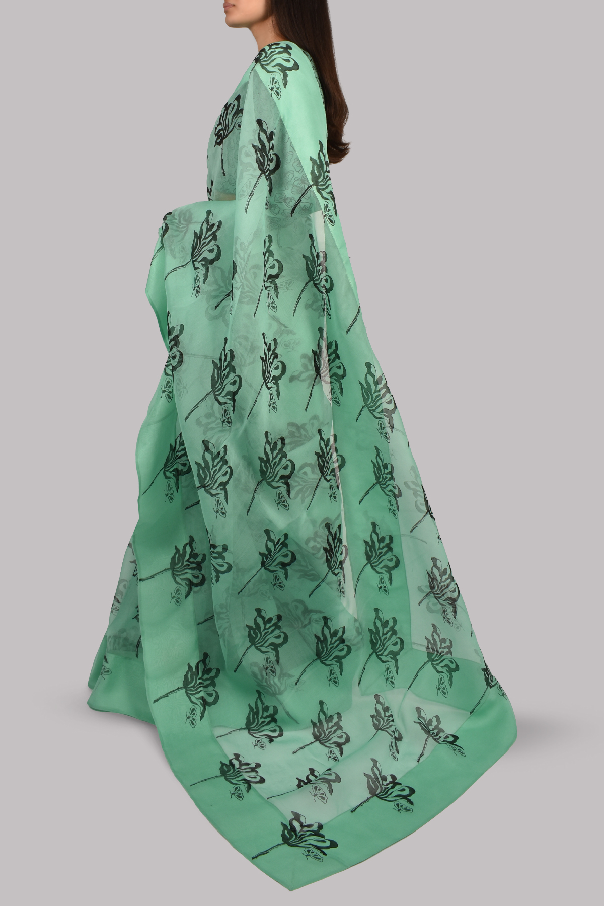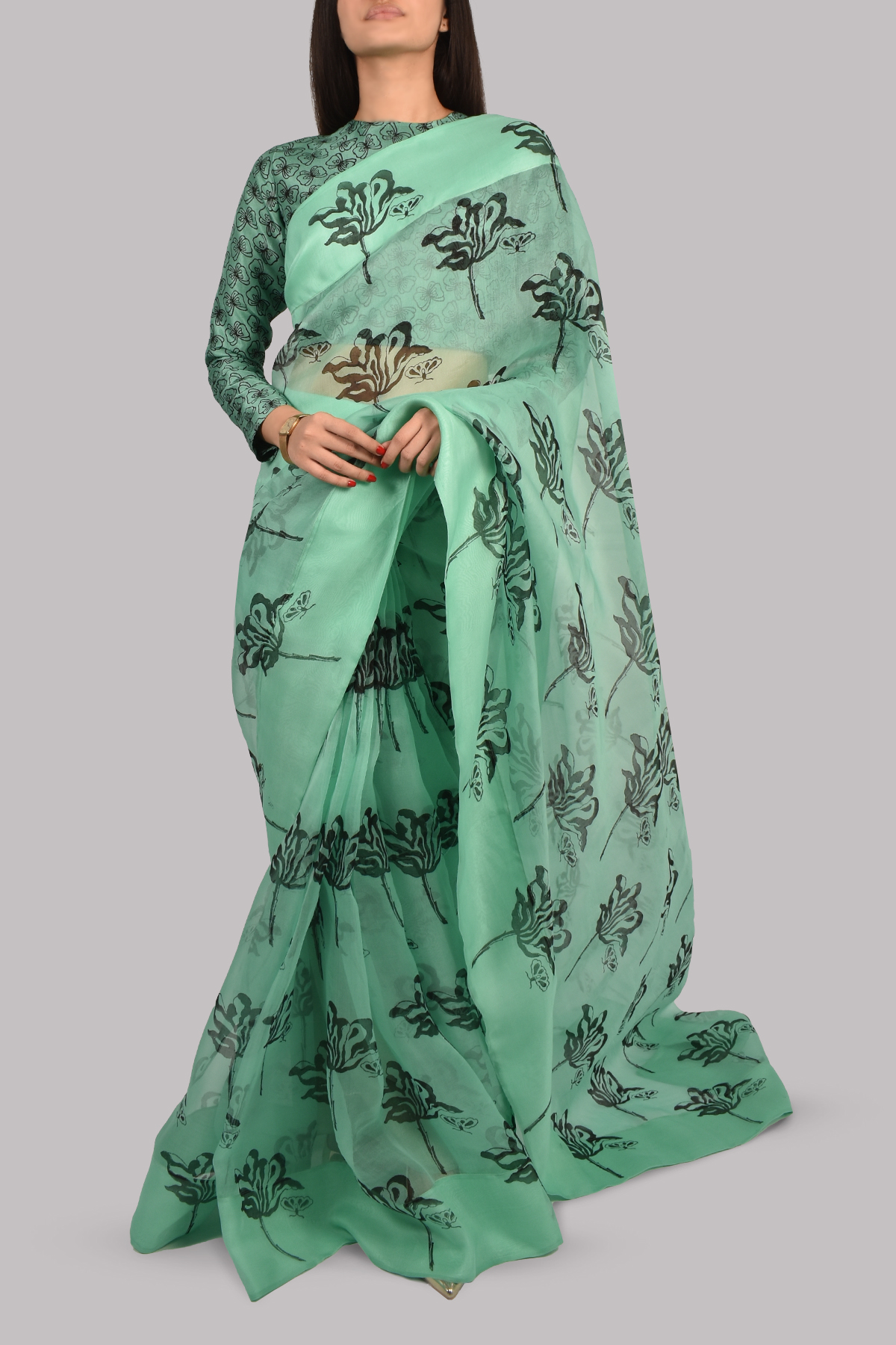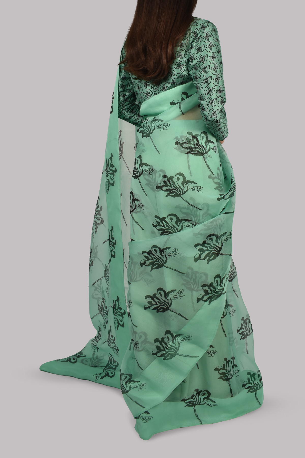 Neptune green block printed organza sari with matching block printed dupion cropped top. The sari has stitched pleats for ease of wearing. Silk petticoat included.