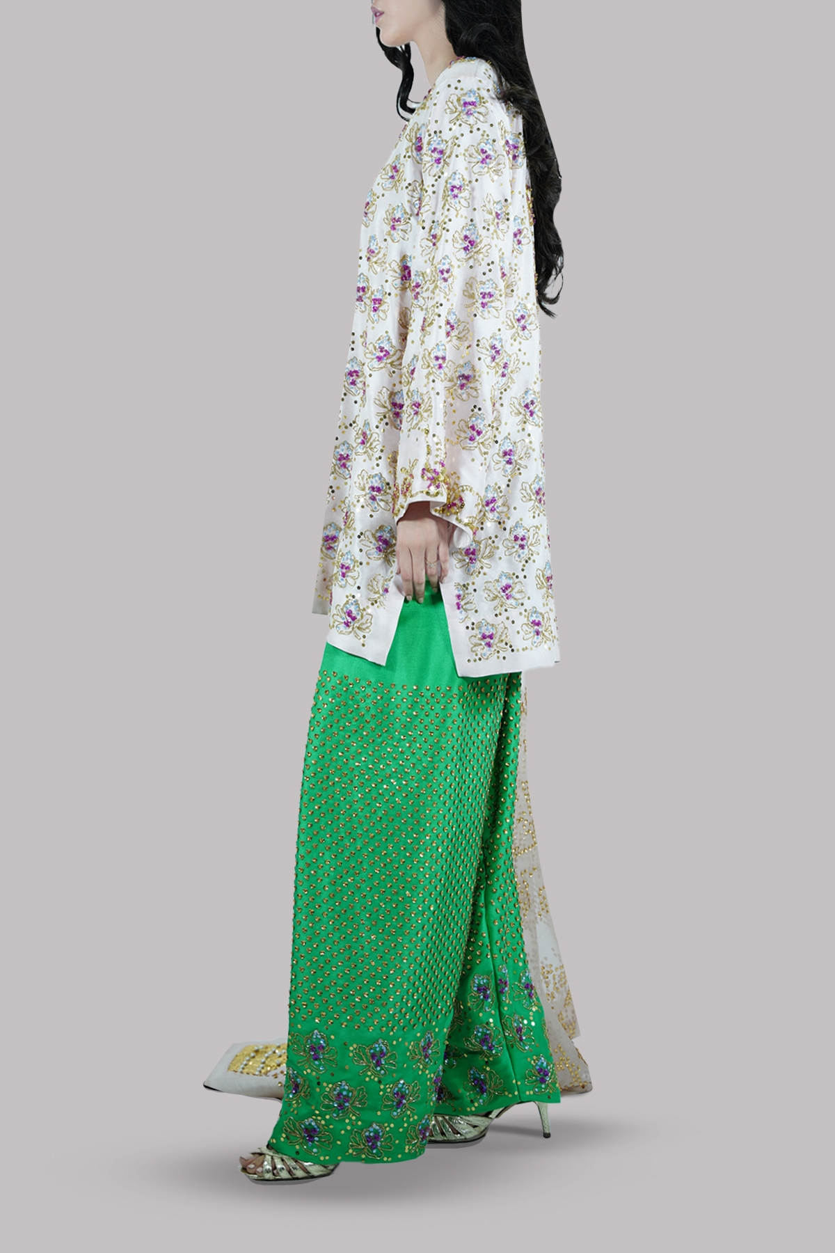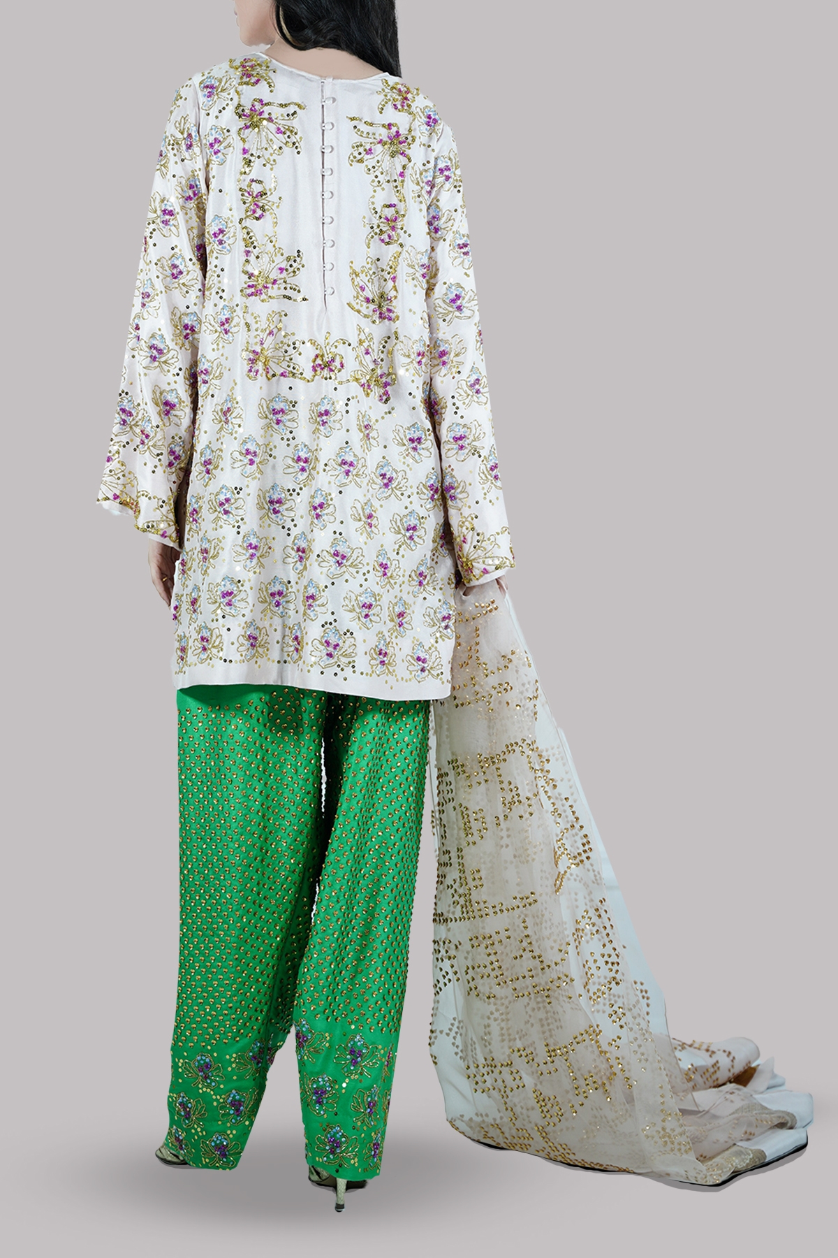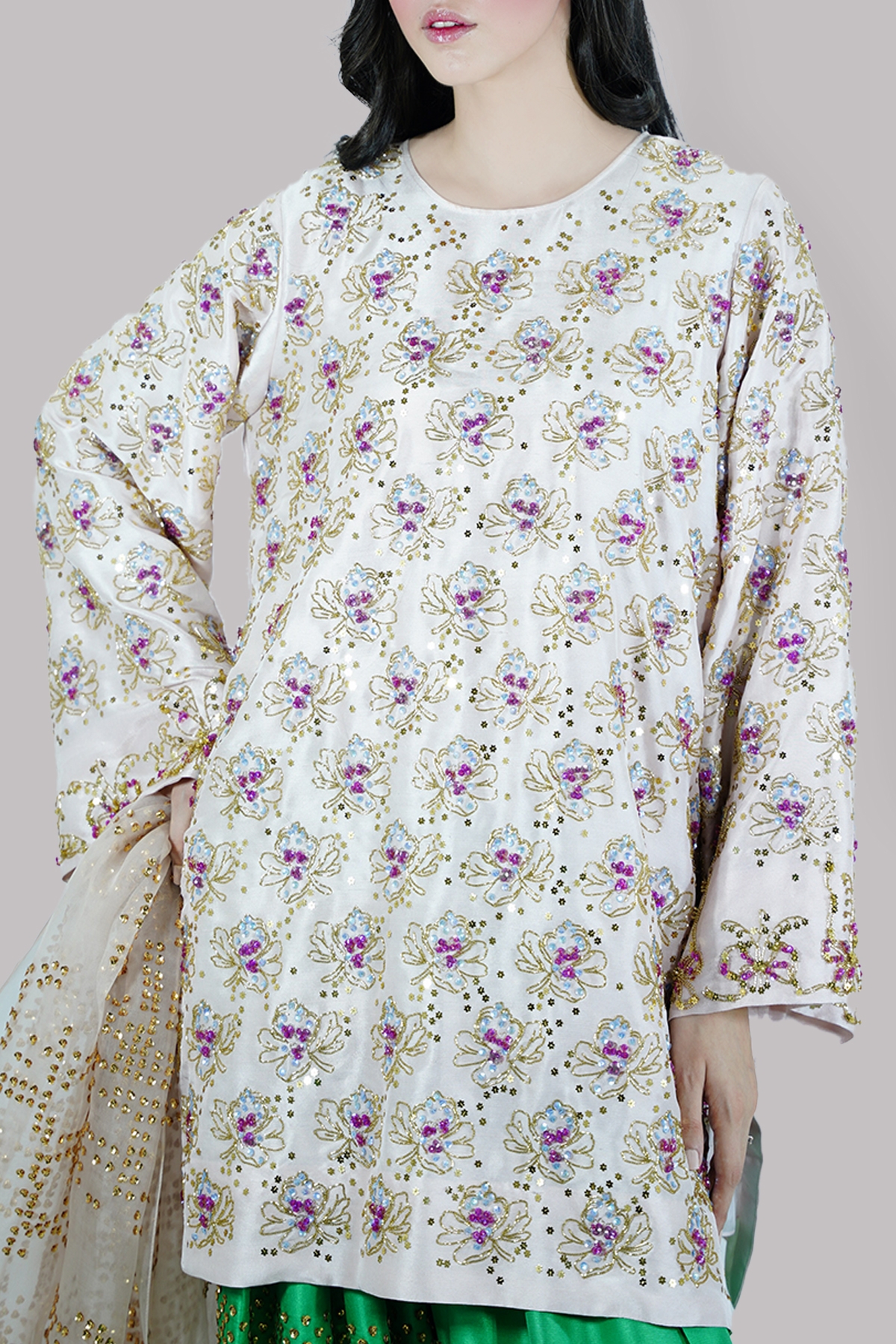 Peach blush embellished shirt adorned with multi coloured sequins and wide sleeves. Impeccably tailored with Deep Mint multi-coloured embellished shalwar and detailed embellished organza dupatta.