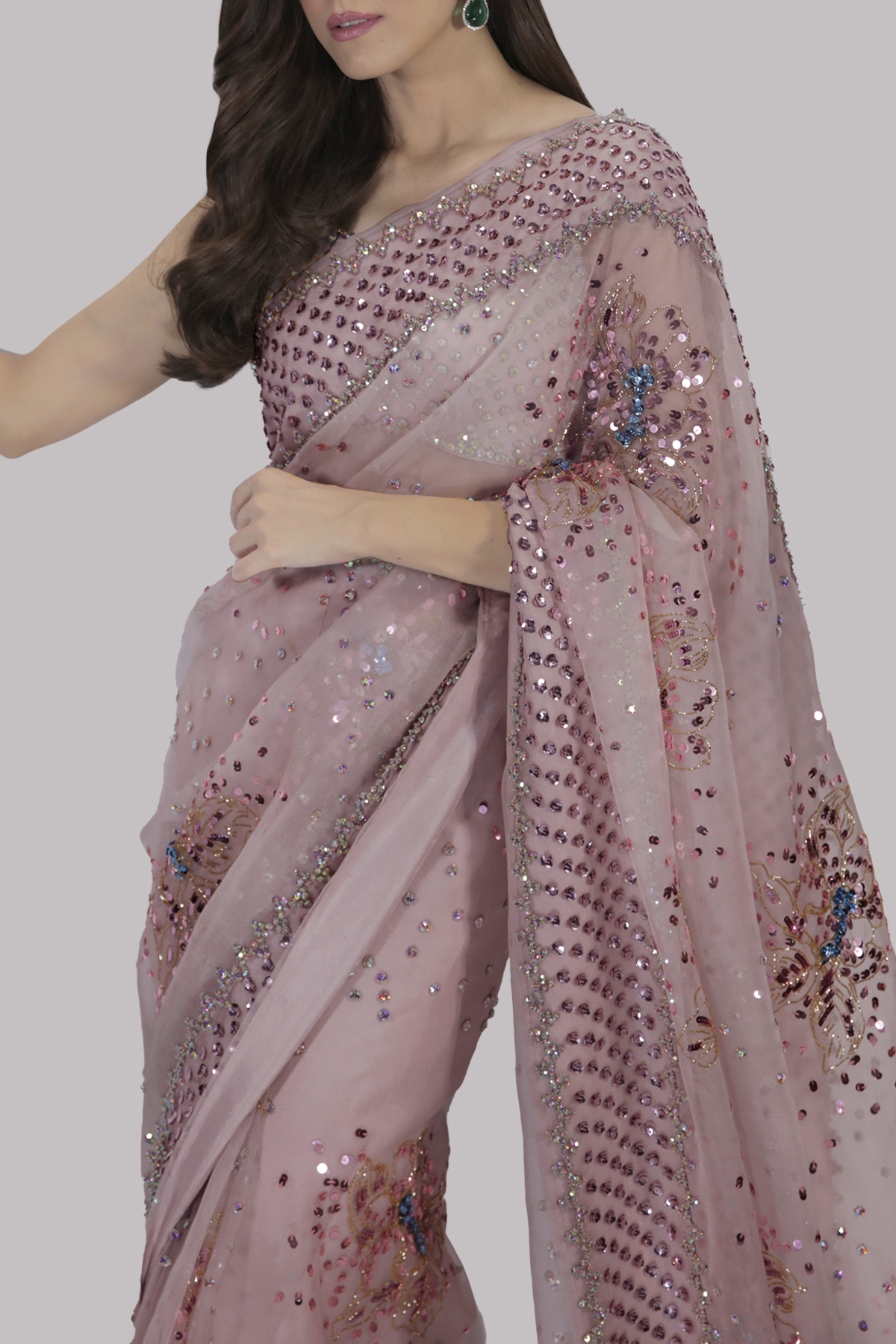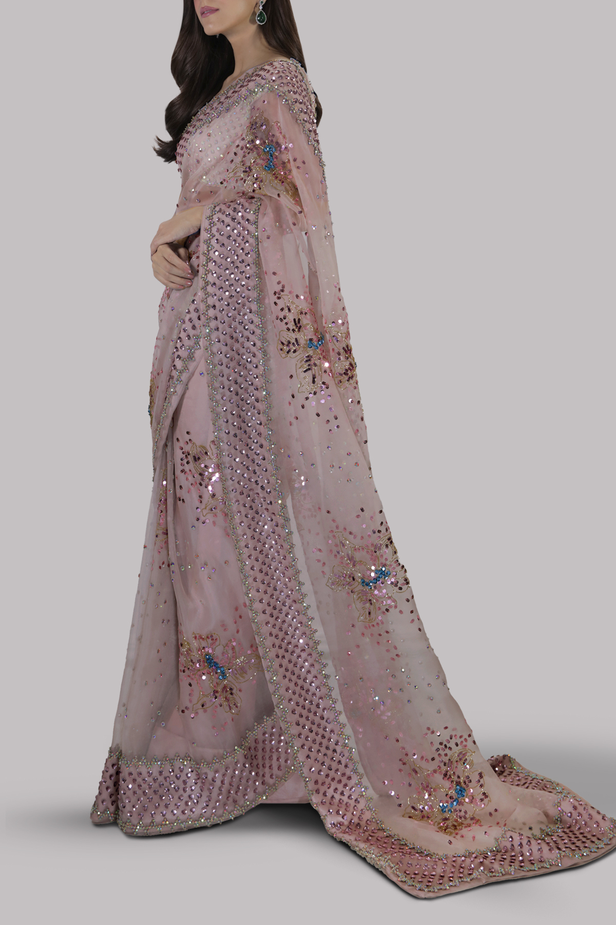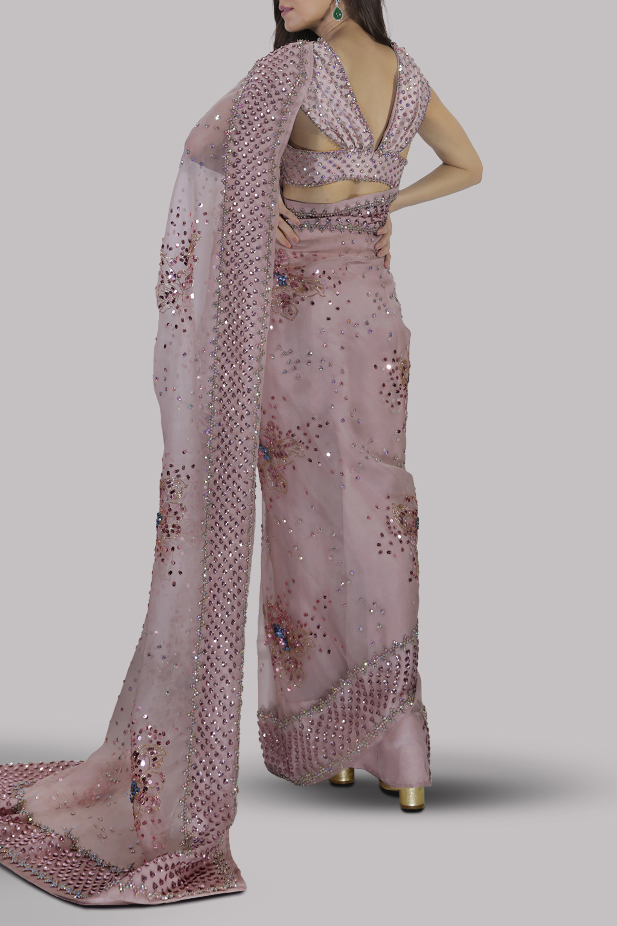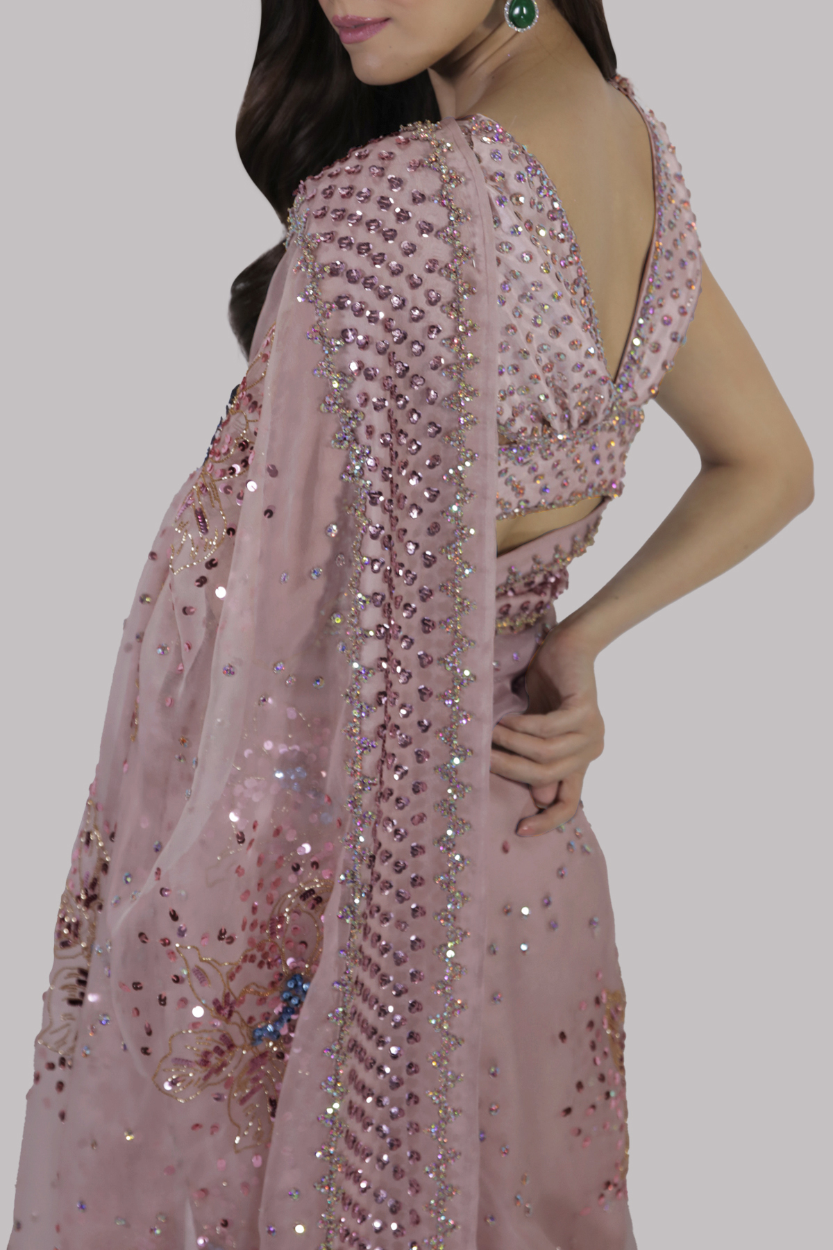 Peach Blush organza sari with matching raw silk cropped blouse. Deep V shaped back that is pierced through the bodice and has cut-outs at the waist. Hand embellished with freshwater pearls, dazzling crystals and multi coloured glittering sequins. The sari has stitched pleats for ease of wearing. Matching stitched underskirt included.