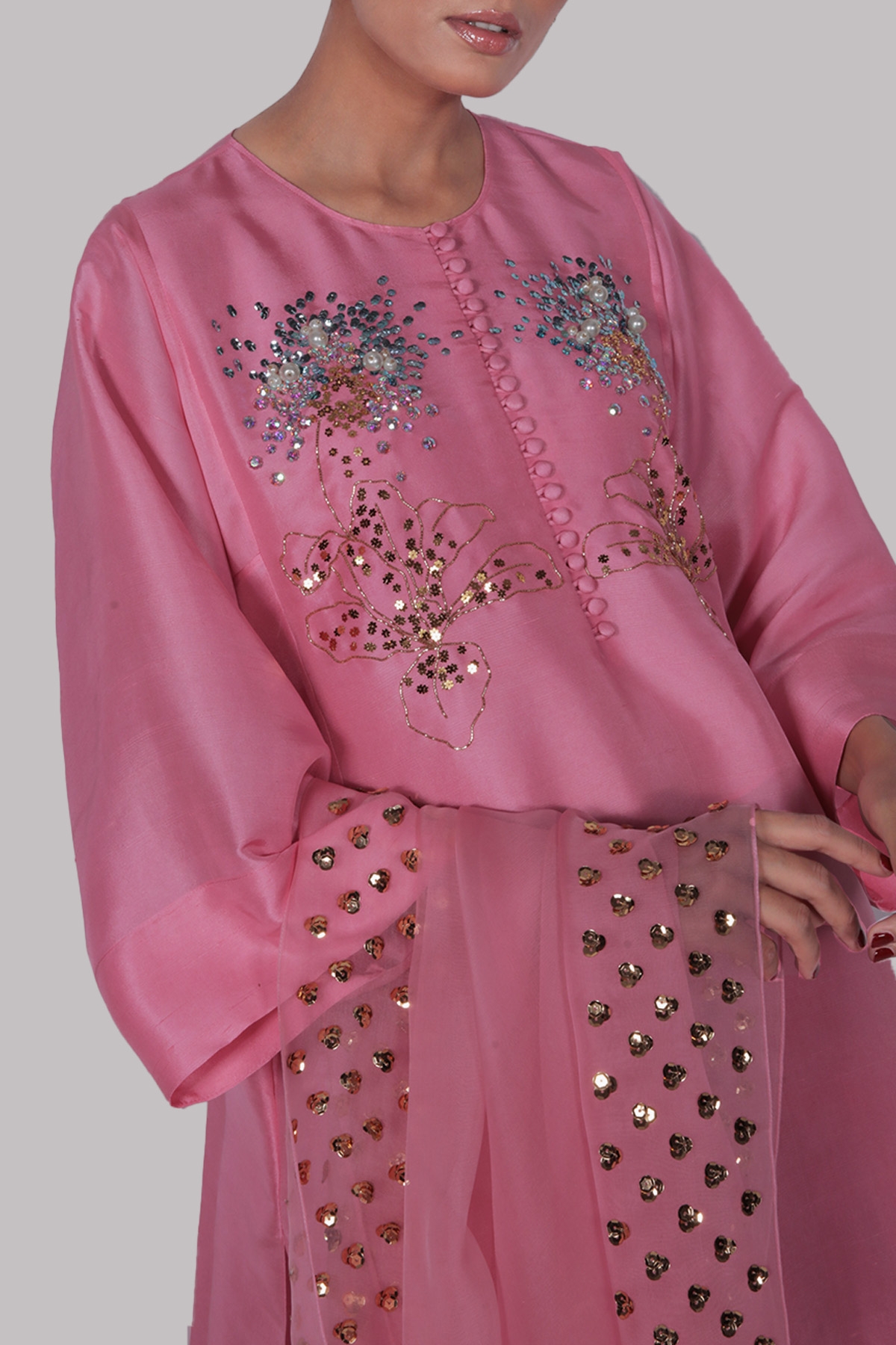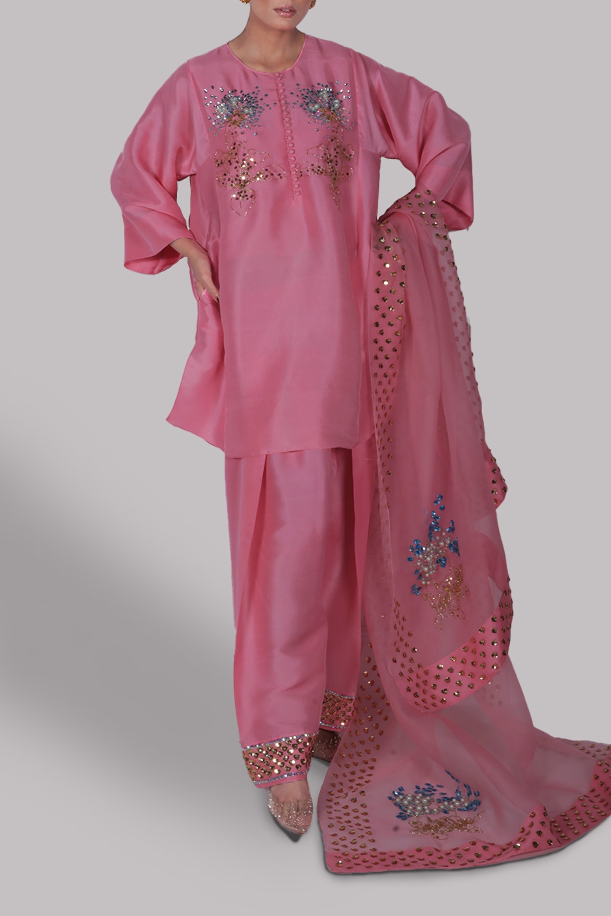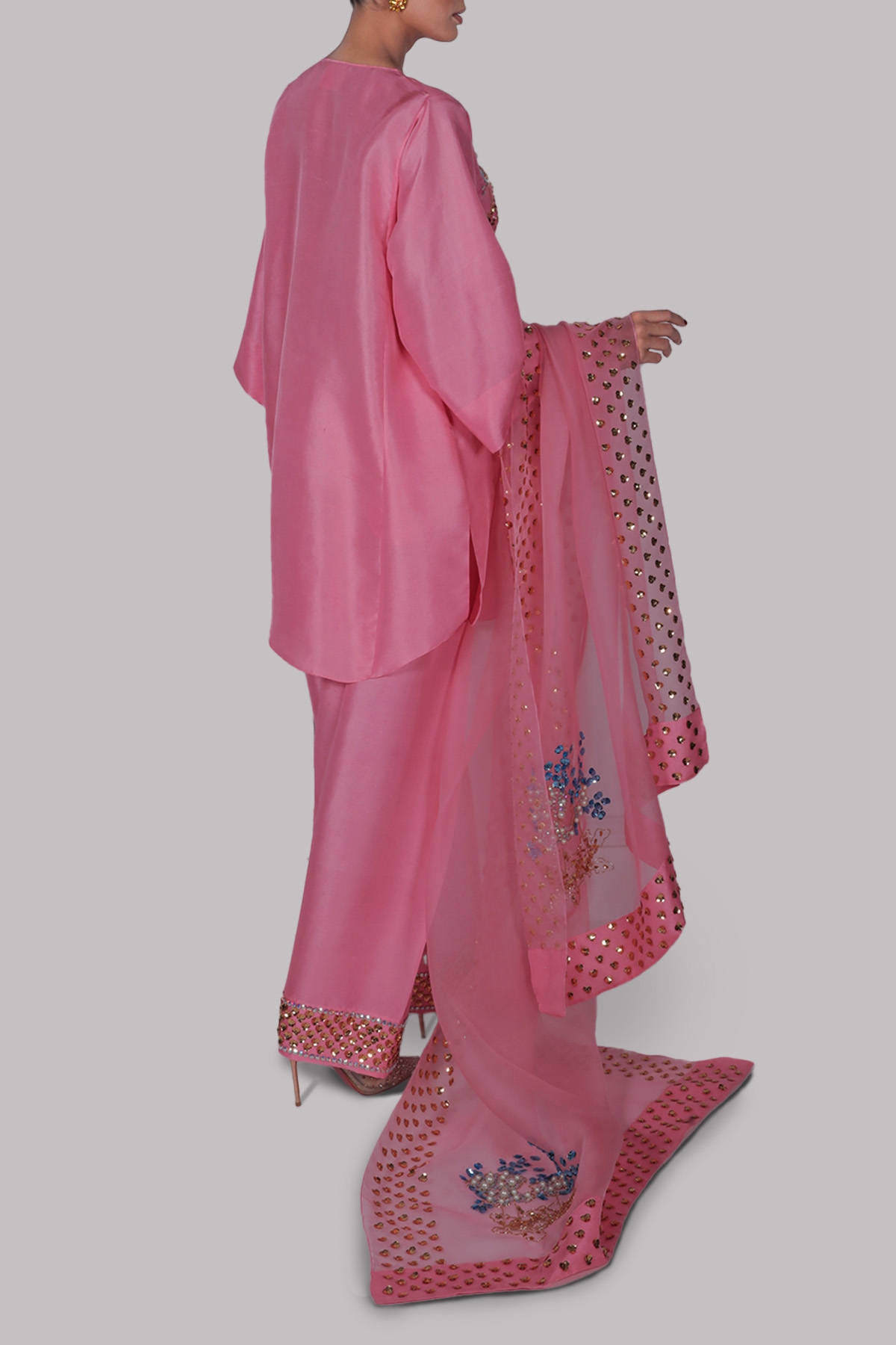 PEONY PINK, OVERSIZED RAW SILK TOP, HAND EMBELLISHED WITH MULTI-COLORED FRENCH AND ITALIAN SEQUINS. MATCHING EMBELLISHED RAW SILK SHALWAR PANTS AND EMBELLISHED ORGANZA DUPATTA.