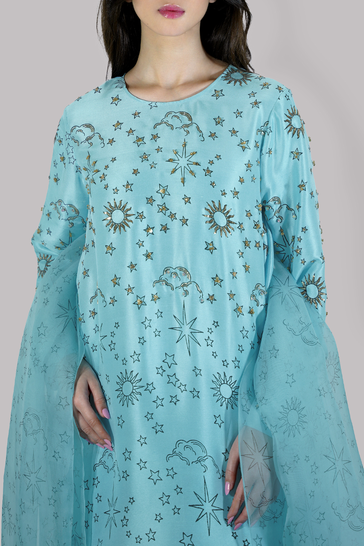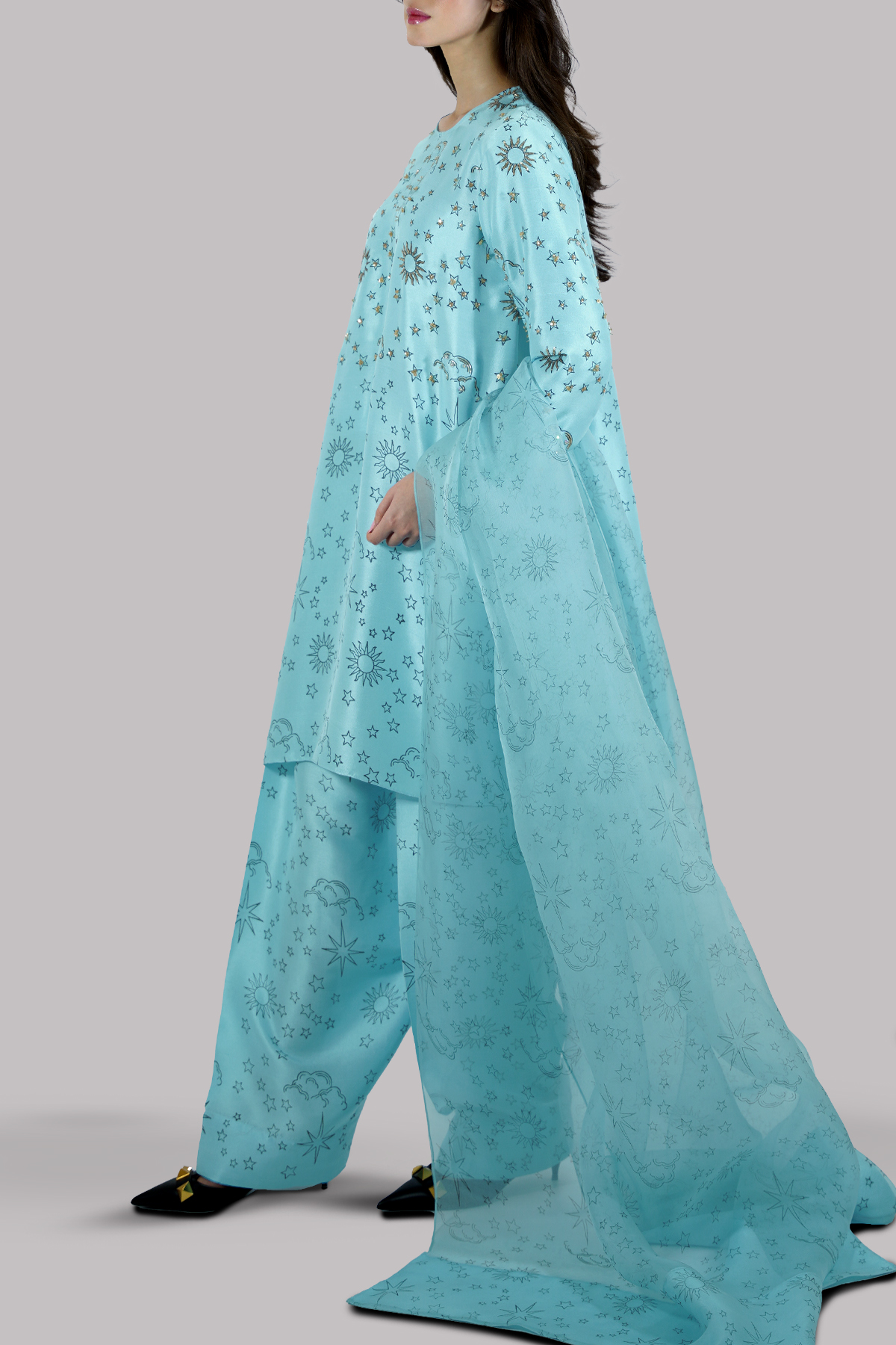 Petit Four close neck raw silk shirt decorated with gold sparkling sequins. It has perfect cuts and extravagant details, It’s impeccably tailored with matching block printed raw silk shalwar pants, paired with block printed organza dupatta.