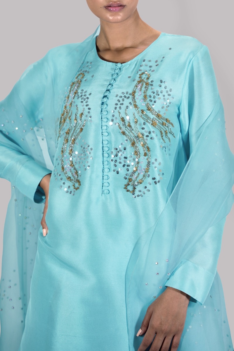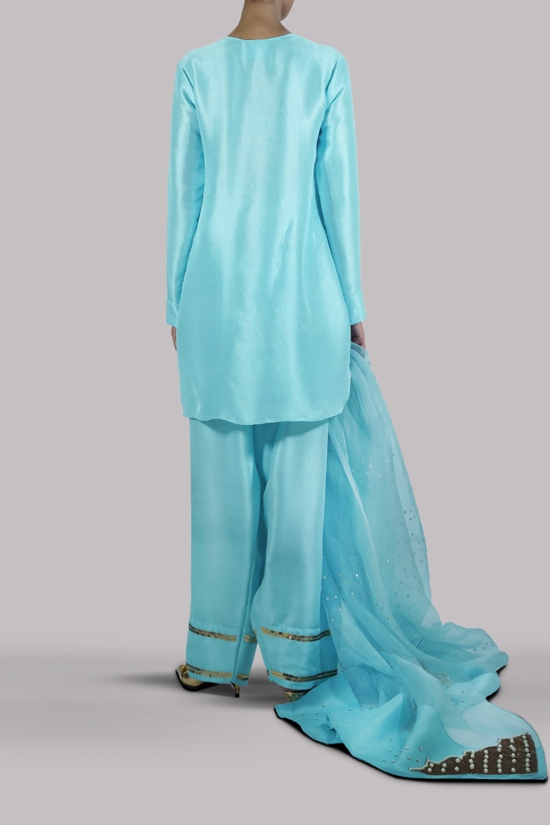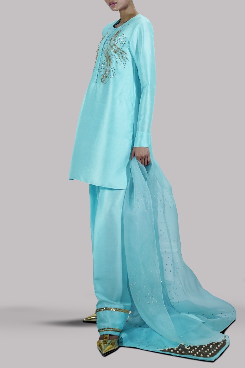 Petit Four close neck raw silk shirt decorated with sparkling crystals and sequins with perfect cut and extravagant details, It’s impeccably tailored with matching embellished raw silk shalwar pants with gold sequins and embellished organza dupatta.