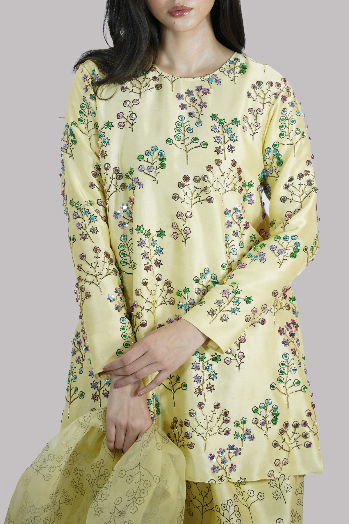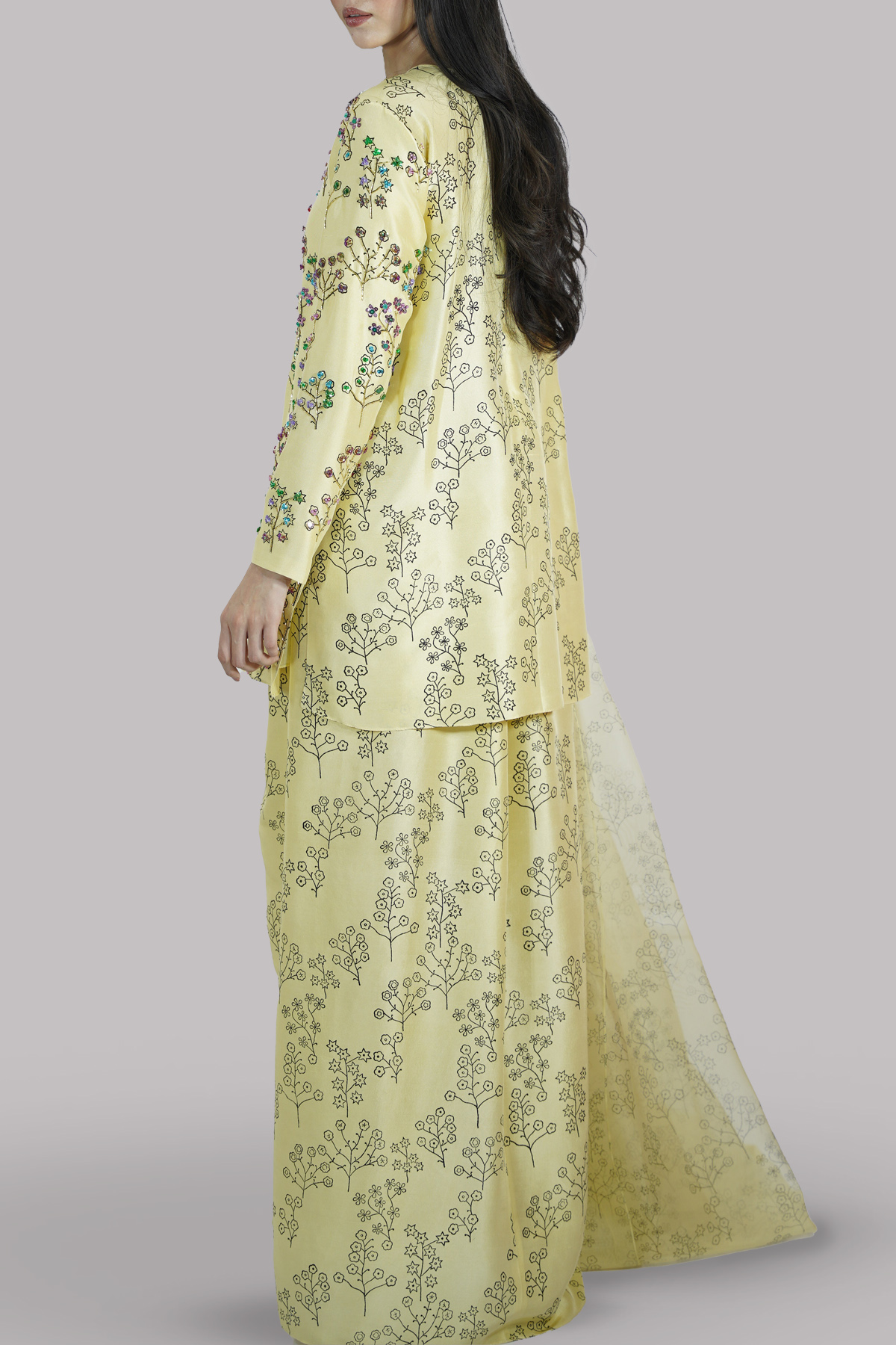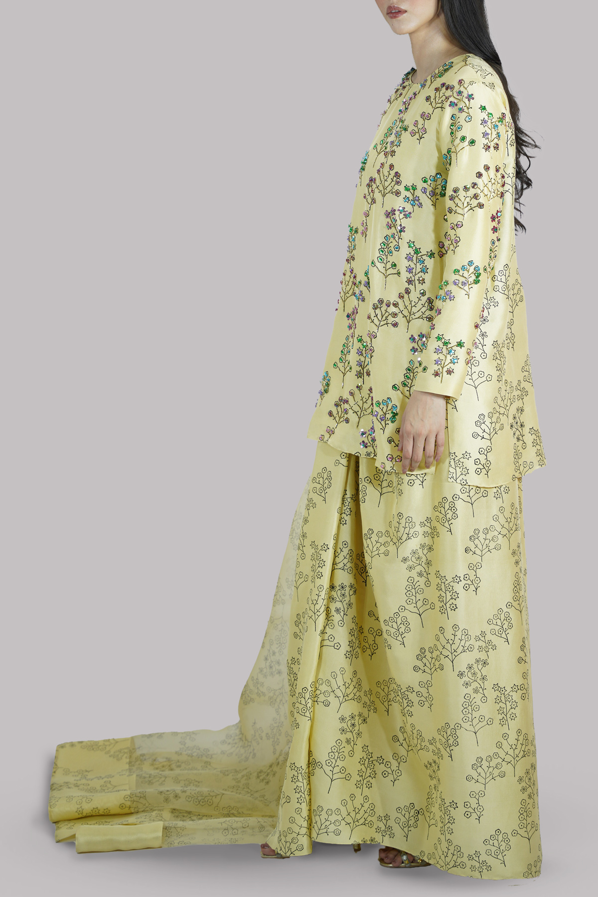 Pineapple yellow block printed and embellished tunic with a matching pleated sarong skirt and organza dupatta. The skirt can be substituted for a shalwar or wide legged pants at no additional cost. Please email us with your order number if you need to change the skirt.